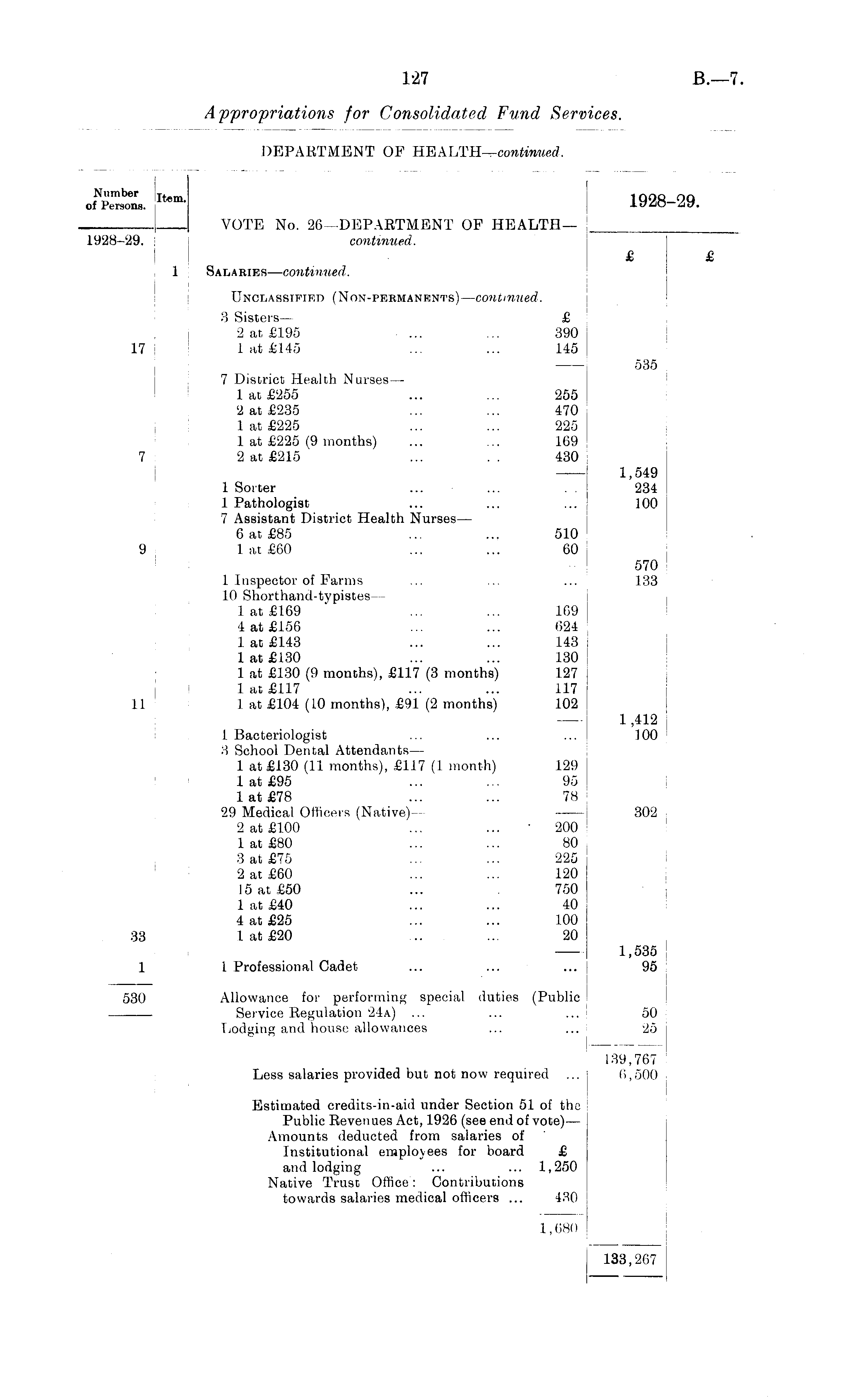 ofpe'ons. Item " 1928-29. VOTE No. 26—DEPARTMENT OF HEALTH— 1928-29. continued. £ £ 1 Salaries—continued. Unclassified (Non-peemanents)—continued. 3 Sisters— £ 2 at, £195 ... ... 390 17 1 at £145 ... ... 145 535 7 District Health Nurses — 1 at £255 ... ... 255 2 at £235 ... ... 470 1 at £225 ... ... 225 1 at £225 (9 months) ... ... 169 7 2 at £215 ... .. 430 1,549 1 Sorter ... ... 234 1 Pathologist ... ... ... 100 7 Assistant District Health Nurses—• 6 at £85 ... ... 510 9 1 at £60 ... ... 60 570 1 Inspector of Farms ... ... ... 133 10 Shorthand-typistes — 1 at £169 ' ... ... 169 4 at £156 ... ... 624 1 at £143 ... ... 143 1 at £130 ... ... 130 1 at £130 (9 months), £117 (3 months) 127 1 at £117 ... ... 117 11 1 at £104 (10 months), £91 (2 months) 102 1,412 1 Bacteriologist ... ... ... ]00 3 School Dental Attendants— 1 at £130 (11 months), £117 (1 month) 129 1 at £95 ... ... 95 1 at £78 ... ... 78 29 Medical Officers (Native) — 302 2 at £100 ... ... ' 200 1 at £80 ... ... 80 3 at £75 ... ... 225 2 at £60 ... ... 120 15 at £50 ... 750 1 at £40 ... ... 40 4 at £25 ... ... 100 33 1 at £20 .. ... 20 1,535 1 1 Professional Cadet ... ... ... 95 530 Allowance for performing special duties (Public Service Regulation 24a) ... ... ... 50 Lodging and house allowances ... ... 25 139,767 Less salaries provided but not now required ... 6,500 Estimated credits-in-aid under Section 51 of the Public Revenues Act, 1926 (see end of vote) — Amounts deducted from salaries of Institutional employees for board £ and lodging ... ... 1,250 Native Trust Office: Contributions towards salaries medical officers ... 430 1,680 133,267