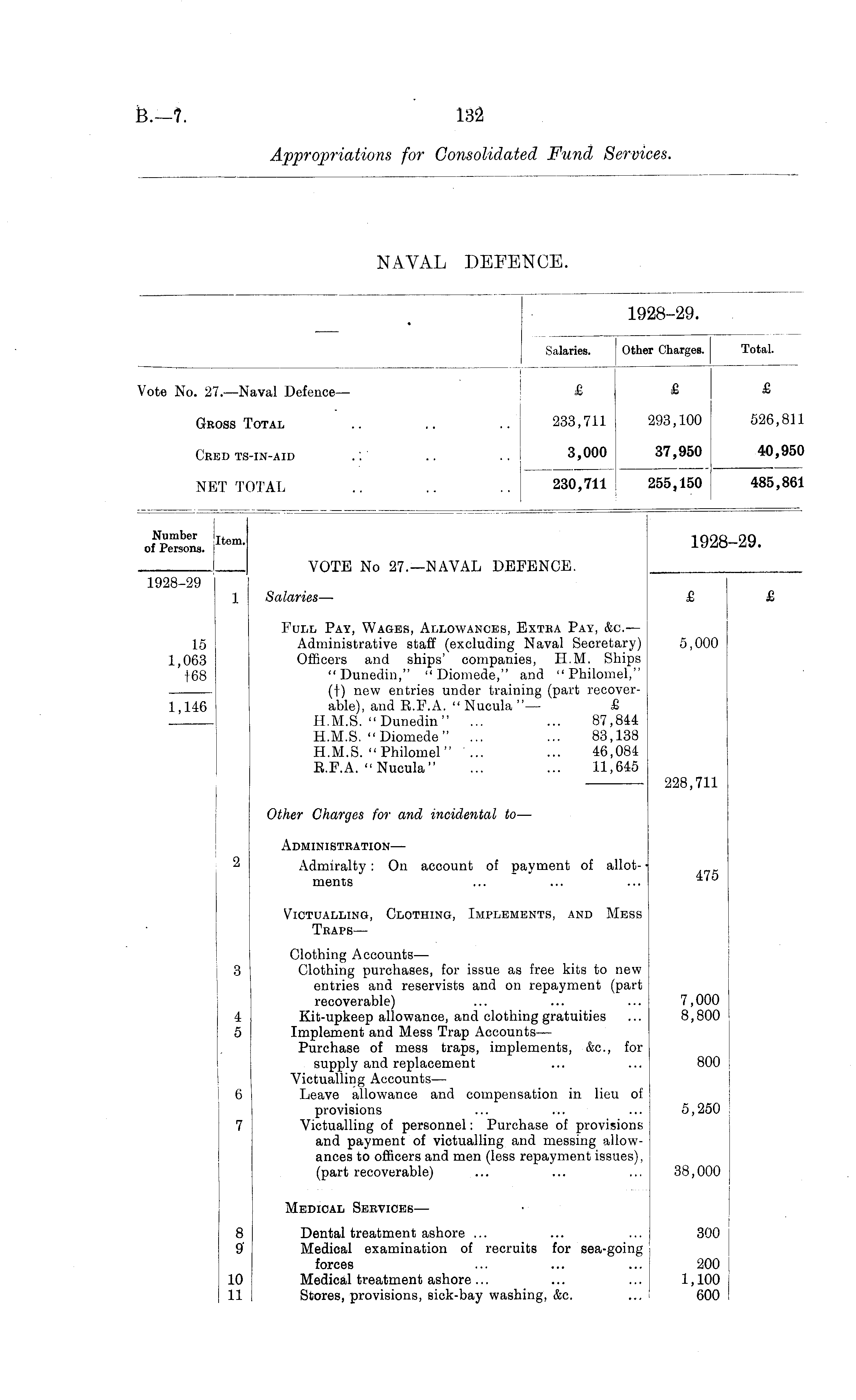 1928-29. Salaries. Other Charges. Total. Vote No. 27. —Naval Defence— £ £ £ GROSS Total .. .. .. 233,711 293,100 526,811 CRED ts-IN-AID .' .. .. 3,000 37,950 40,950 NET TOTAL .. 230,711 255,150 485,861 oft™. 1928-29. I VOTE No 27.—NAVAL DEFENCE. 1928-29 1 Salaries— £ £ Full Pay, Wages, Allowances, Extra Pay, &c.— 15 Administrative staff (excluding Naval Secretary) 5,000 1,063 Officers and ships' companies, H.M. Ships f68 " Dunedin," " Diomede," and "Philomel," (t) new entries under training (part recover1,146 able), and R.F.A. " Nucula"— £ H.M.S. "Dunedin" ... ... 87,844 H.M.S. " Diomede" ... ... 83,138 H.M.S. "Philomel" ... ... 46,084 R.F.A. "Nucula" ... ... 11,645 228,711 Other Charges for and incidental to — Administration— 2 Admiralty: On account of payment of allotments ... ... ... Victualling, Clothing, Implements, and Mess | Traps— Clothing Accounts — 3 Clothing purchases, for issue as free kits to new entries and reservists and on repayment (part recoverable) ... ... ... 7,000 4 Kit-upkeep allowance, and clothing gratuities ... 8,800 5 Implement and Mess Trap AccountsPurchase of mess traps, implements, &c., for supply and replacement ... ... 800 Victualling Accounts — 6 Leave allowance and compensation in lieu of provisions ... ... ... 5,250 7 Victualling of personnel: Purchase of provisions and payment of victualling and messing allowances to officers and men (less repayment issues), (part recoverable) ... ... ... 38,000 Medical Services — 8 Dental treatment ashore ... ... ... 300 9 Medical examination of recruits for sea-going forces ... ... ... 200 10 Medical treatment ashore... ... ... 1,100 11 Stores, provisions, sick-bay washing, &c. ... 600