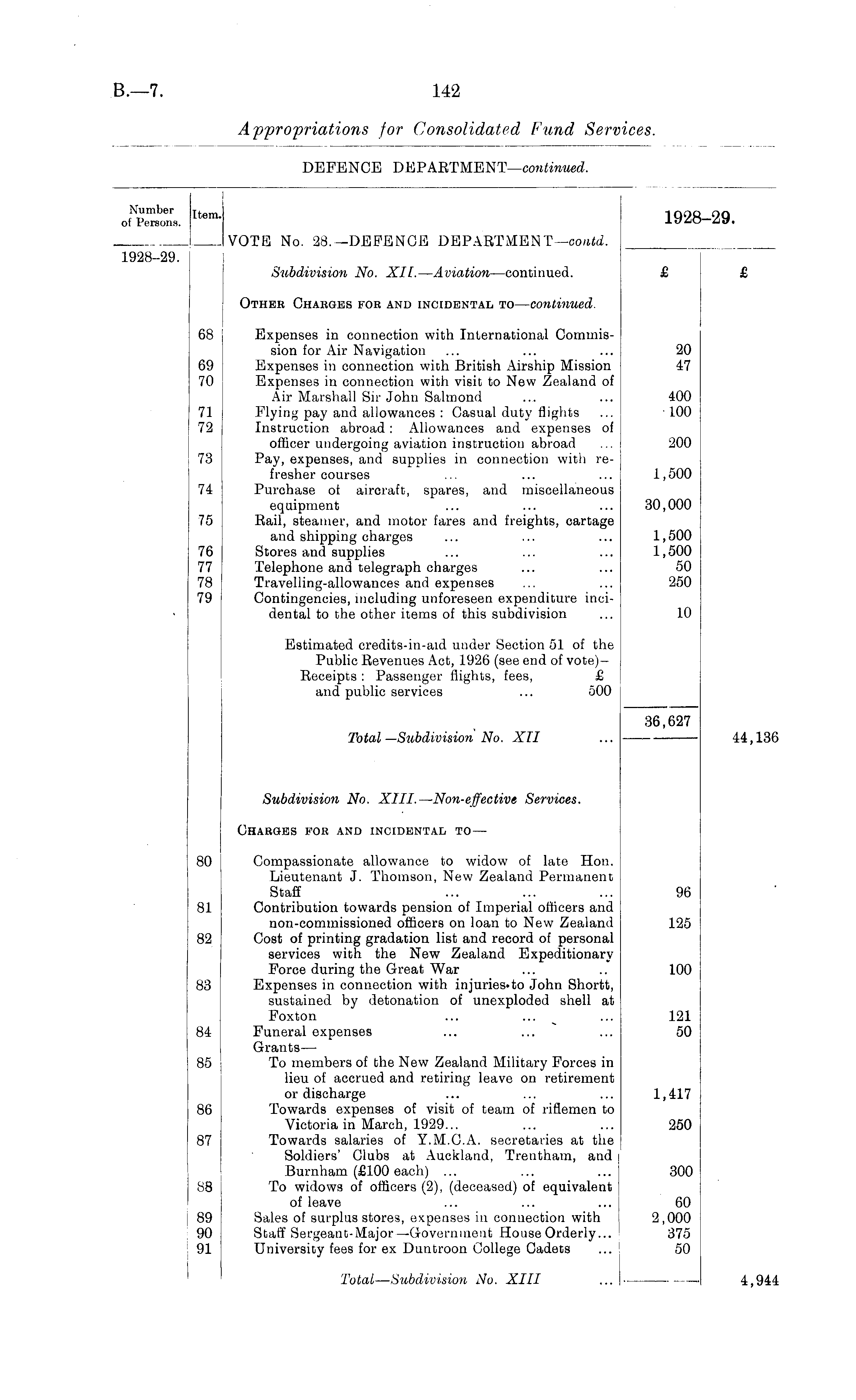 of N p™. Item - 1928-29. VOTE No. 28.— DEFENCE DEPARTMENT—oontd. 1928-29. 1 Subdivision No. XII.—Aviation—continued. £ £ Otheb Charges for and incidental to —continued. 68 Expenses in connection with International Commission for Air Navigation ... ... ... 20 69 Expenses in connection with British Airship Mission 47 70 Expenses in connection with visit to New Zealand of Air Marshall Sir John Salmond .... ... 400 71 Flying pay and allowances : Casual duty flights ... 100 72 Instruction abroad: Allowances and expenses of officer undergoing aviation instruction abroad ... 200 73 Pay, expenses, and supplies in connection with refresher courses ... ... ... 1,500 74 Purchase ot aircraft, spares, and miscellaneous equipment ... ... ... 30,000 75 Rail, steamer, and motor fares and freights, cartage and shipping charges ... ... ... 1,500 76 Stores and supplies ... ... ... 1,500 77 Telephone and telegraph charges ... ... 50 78 Travelling-allowances and expenses ... ... 250 79 Contingencies, including unforeseen expenditure incidental to the other items of this subdivision ... 10 Estimated credits-in-aid under Section 51 of the Public Revenues Act, 1926 (see end of vote)— Receipts : Passenger flights, fees, £ and public services ... 500 36,627 Total—Subdivision No. XII ... 44,136 Subdivision No. XIII.-Non-effective Services. Charges for and incidental to — 80 Compassionate allowance to widow of late Hon. Lieutenant J. Thomson, New Zealand Permanent Staff ... ... ... 96 81 Contribution towards pension of Imperial officers and non-commissioned officers on loan to New Zealand 125 82 Cost of printing gradation list and record of personal services with the New Zealand Expeditionary Force during the Great War ... .. 100 83 Expenses in connection with injuries-to John Shortt, sustained by detonation of unexploded shell at Foxton ... ... ... 121 84 Funeral expenses ... ... ... 50 Grants— 85 To members of the New Zealand Military Forces in lieu of accrued and retiring leave on retirement or discharge ... ... ... 1,417 86 j Towards expenses of visit of team of riflemen to Victoria in March, 1929... ... ... 250 87 i Towards salaries of Y.M.O.A. secretaries at the Soldiers' Clubs at Auckland, Trentham, and Burnham (£100 each) ... ... ... 300 I 88 To widows of officers (2), (deceased) of equivalent of leave ... ... ... 60 89 Sales of surplus stores, expenses in connection with 2,000 90 ' Staff Sergeant-Major— Government House Orderly... 375 i 91 University fees for ex Duntroon College Cadets ... 50 Total—Subdivision No. XIII ... 4,944