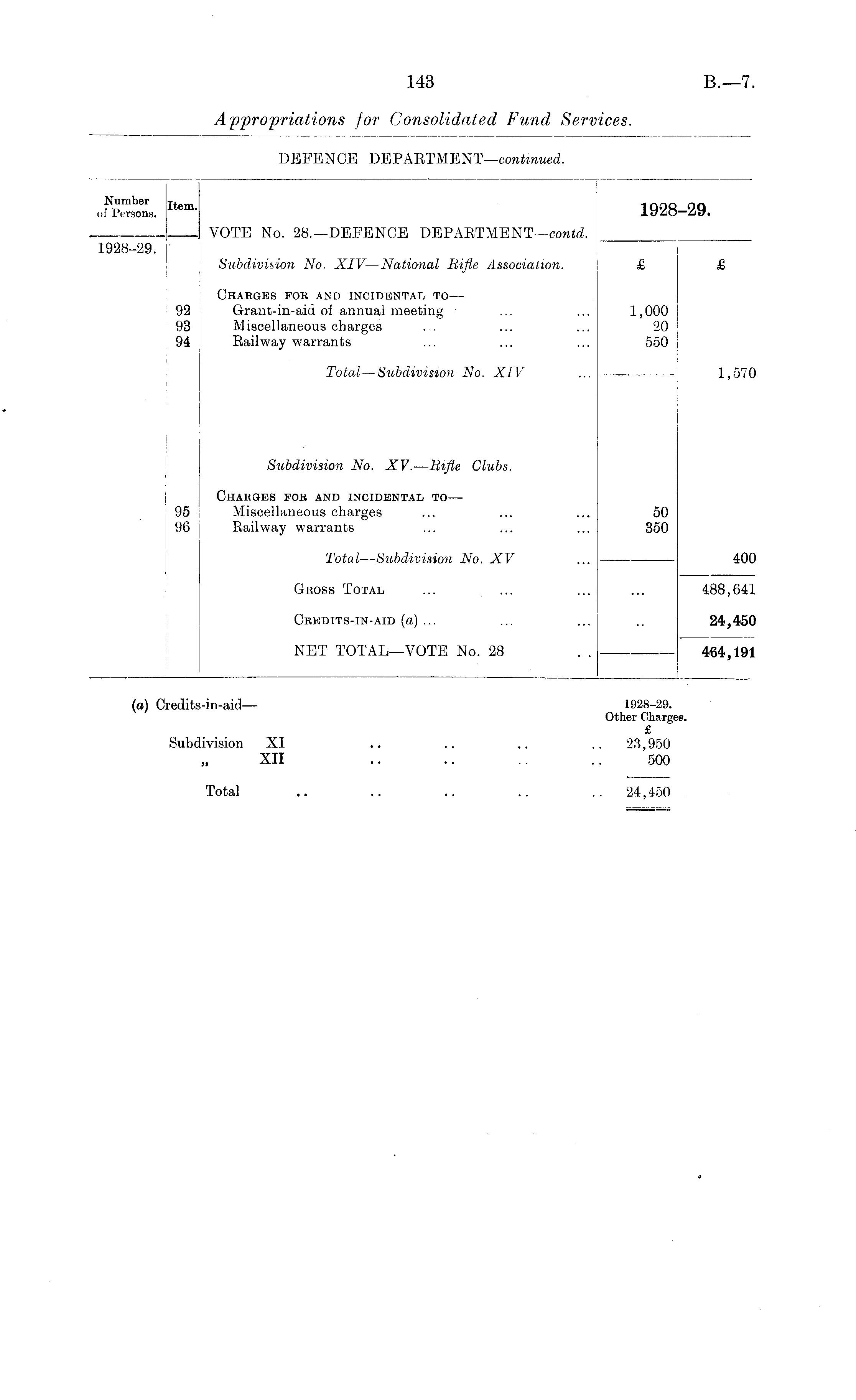 of Persons. j Item j 1928-29. VOTE No. 28.—DEFENCE DEPARTMENT—contd. 1928-29. Subdivision No. XIV —National Rifle Association. £ £ Charges fob and incidental to — 92 Grant-in-aid of annual meeting ... ... 1,000 93 Miscellaneous charges . . ... ... 20 94 Railway warrants ... ... ... 550 Total —Subdivision No. XIV ... 1,570 Subdivision No. XV.—Rifle Clubs. Charges for and incidental to — 95 Miscellaneous charges ... ... ... 50 96 Railway warrants ... ... ... 350 Total—Subdivision No. XV ... 400 Gross Total ... ... ... ... 488,641 Credits-in-aid (a) ... ... ... .. 24,450 NET TOTAL—VOTE No. 28 . . 464,191