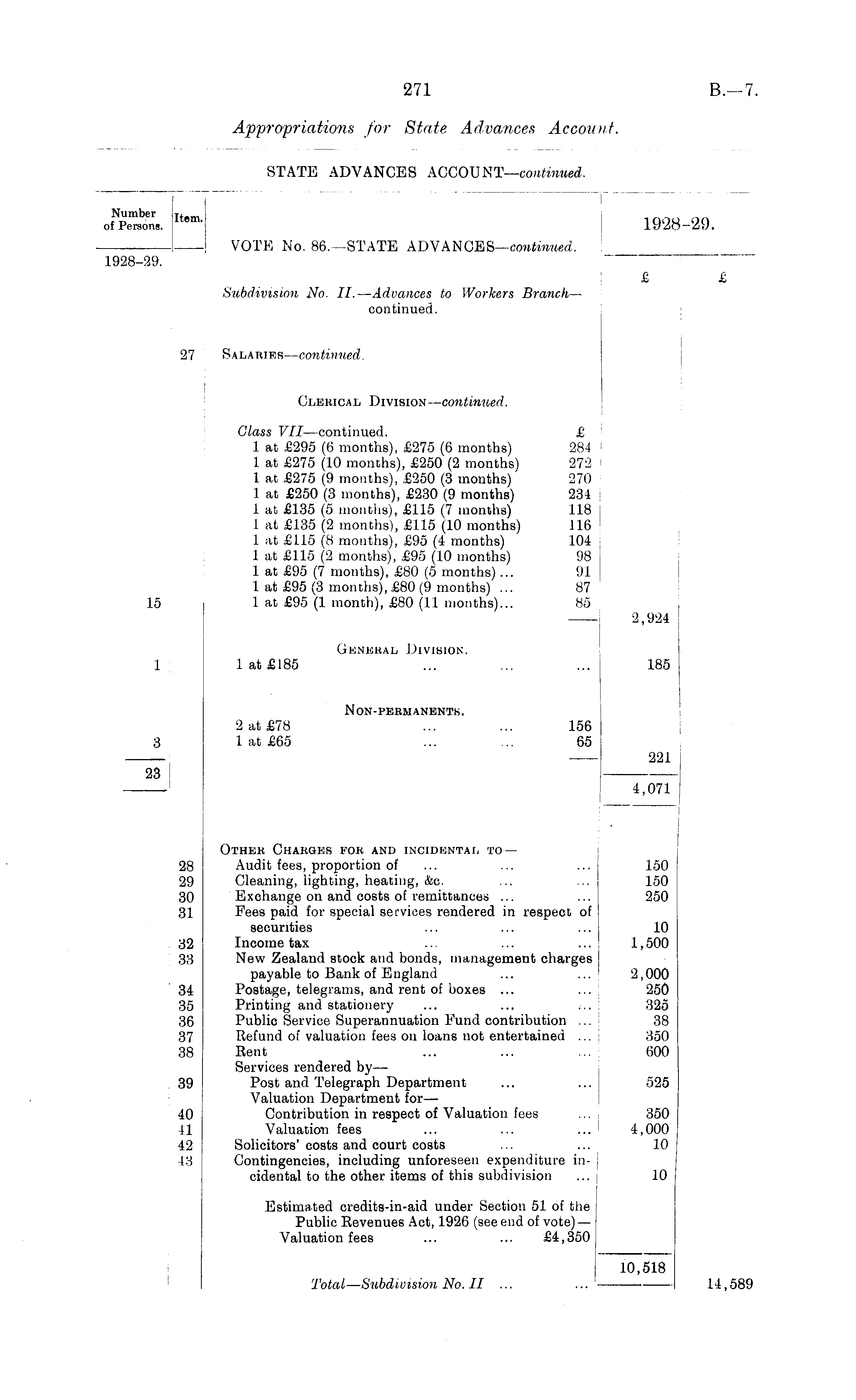 o Item " 1928-29. —— VOTE No. 86.—STATE ADVANCES —continued. 1928-29. £ £ Subdivision No. II.—Advances to Workers Branch— continued. 27 Salaries—continued. Clerical Division —continued. Glass VII—continued. £ 1 at £295 (6 months), £275 (6 months) 284 1 at £275 (10 months), £250 (2 months) 272 1 at £275 (9 months), £250 (3 months) 270 1 at £250 (3 months), £230 (9 months) 234 1 at £135 (5 months), £115 (7 months) 118 1 at £135 (2 months), £115 (10 months) 116 | 1 at £115 (8 months), £95 (4 months) 104 | 1 at £115 (2 months), £95 (10 months) 98 1 at £95 (7 months), £80 (5 months)... 91 1 at £95 (3 months), £80 (9 months) ... 87 ! 15 I 1 at £95 (1 month), £80 (11 months)... 85 2,924 General Division. 1 1 at £185 ... ... ... | 185 Non-permanents. 2 at £78 ... ... 156 3 1 at £65 ... ... 65 221 23 1 1 4,071 Other Charges for and incidental to — 28 Audit fees, proportion of ... ... ... 150 29 Cleaning, lighting, heating, &c. ... ... 150 30 Exchange on and costs of remittances ... ... 250 31 Fees paid for special services rendered in respect of securities ... ... ... 10 32 Income tax ... ... 1,500 33 New Zealand stock and bonds, management charges payable to Bank of England ... ... 2,000 34 Postage, telegrams, and rent of boxes ... ... 250 35 Printing and stationery ... ... ... 325 36 Public Service Superannuation Fund contribution ... 38 37 Refund of valuation fees on loans not entertained ... ; 350 38 Rent ... ... ... 600 Services rendered by— 39 Post and Telegraph Department ... ... 525 Valuation Department for— 40 Contribution in respect of Valuation fees ... 350 41 Valuation fees ... ... ... 4,000 42 Solicitors' costs and court costs ... ... 10 43 Contingencies, including unforeseen expenditure in- j cidental to the other items of this subdivision ... ! 10 Estimated credits-in-aid under Section 51 of the Public Revenues Act, 1926 (see end of vote) — Valuation fees ... ... £4,350 10,518 Total —SubdivisionNo.il ... ... ' 14,589