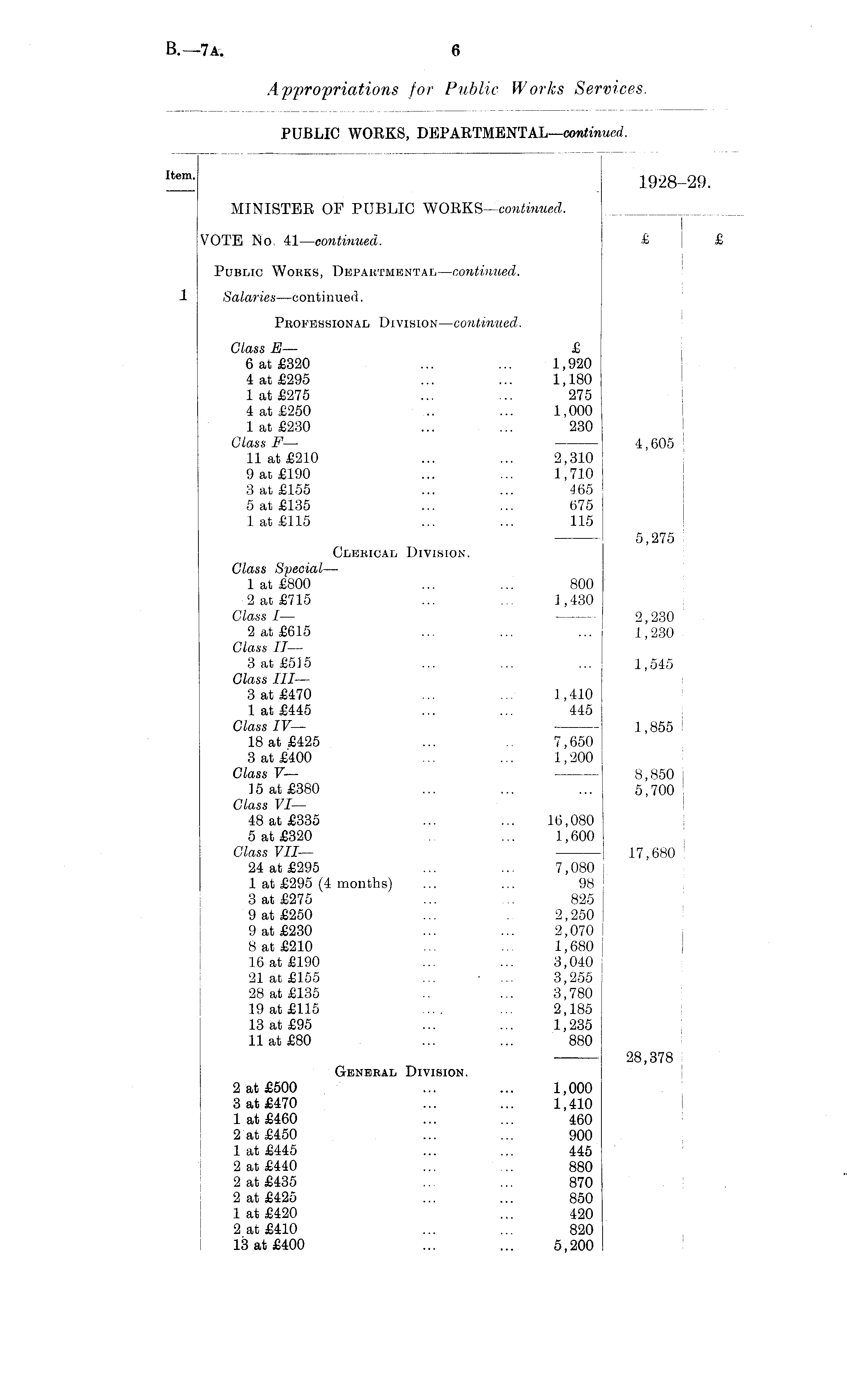 Item - 19-28-29. MINISTER OF PUBLIC WORKS—continued. VOTE No, 41—continued. £ £ Public Works, Departmental—continued. 1 Salaries—continued. Professional Division —continued. Class E— £ 6 at £320 ... ... 1,920 4 at £295 ... ... 1,180 1 at £275 ... ... 275 4 at £250 .. ... 1,000 I at £230 ... ... 230 Glass F— — 4,605 II at £210 ... ... 2,310 9 ac £190 ... ... 1,710 3 at £155 ... ... 465 5 at £135 ... ... 675 1 at £115 ... ... 115 5,275 Clerical Division. Class Special— 1 at £800 ... ... 800 2 ac £715 ... ... 1,430 Class I— 2,230 2 at £615 ... ... ... 1,230 Class II — 3 at £515 ... ... ... 1,545 Class III— 3 at £470 ... ... 1,410 1 at £445 ... ... 445 Class IV — 1,855 18 at £425 ... 7,650 3 at £400 ... ... 1,200 Class V— 8,850 J5 at £380 ... ... ... 5,700 Class VI— 48 at £335 ... ... 16,080 5 at £320 ... 1,600 Class VII— 17,680 24 at £295 ... ... 7,080 I at £295 (4 months) ... ... 98 3 at £275 ... ... 825 9 at £250 ... 2,250 9 at £230 ... ... 2,070 8 at £210 ... ... 1,680 16 at £190 ... ... 3,040 21 at £155 ... • ... 3,255 28 at £135 ... 3,780 19 at £115 ... 2,185 13 at £95 ... ... 1,235 II at £80 ... ... 880 28,378 General Division. 2 at £500 ... ... 1,000 3 at £470 ... ... 1,410 1 at £460 ... ... 460 2 at £450 ... ... 900 1 at £445 ... ... 445 2 at £440 ... ... 880 2 at £435 ... 870 2 at £425 ... ... 850 1 at £420 ... 420 2 at £410 ... ... 820 13 at £400 ... ... 5,200