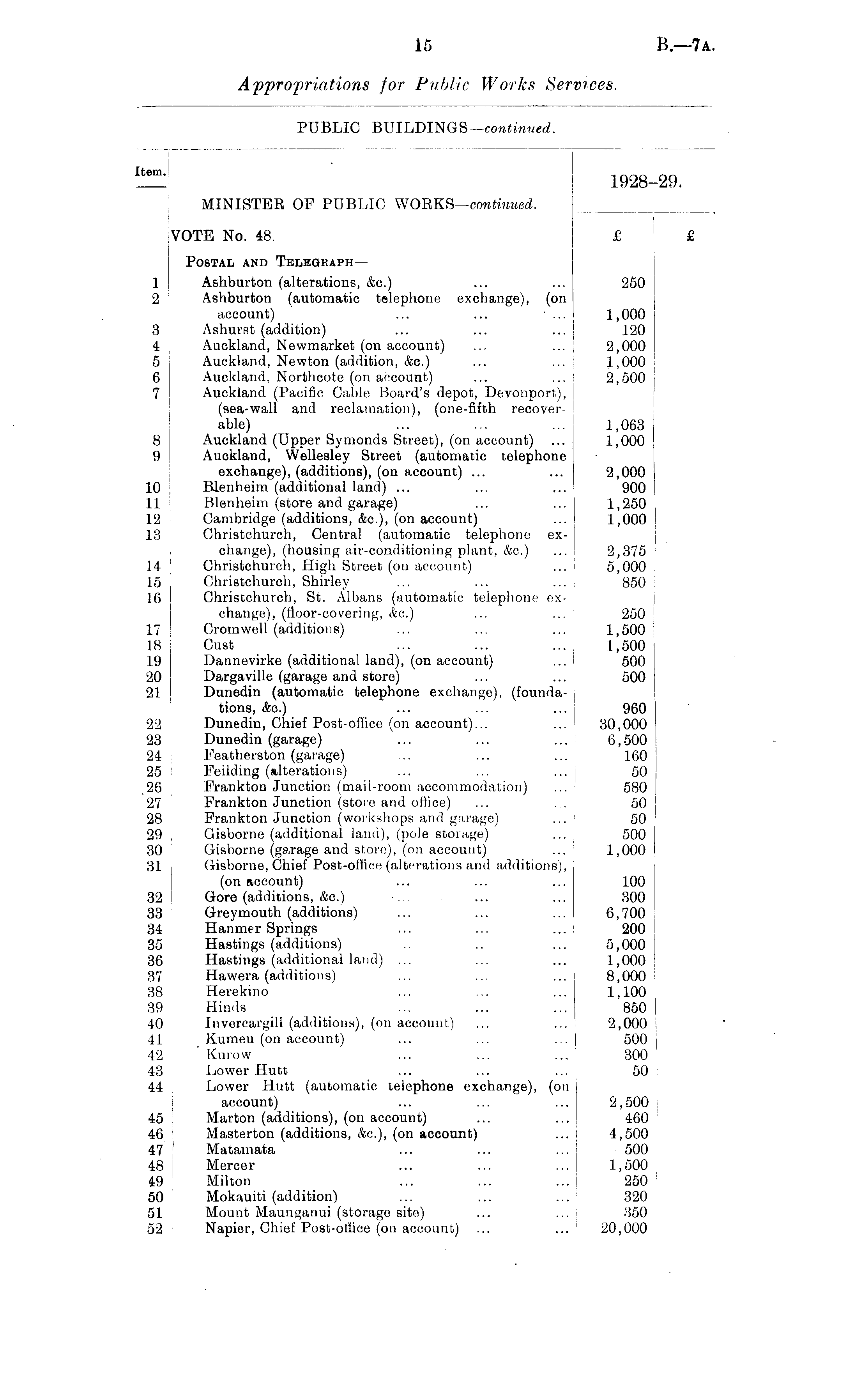 ' 1928-29. MINISTER OF PUBLIC WORKS—continued. I VOTE No. 48. £ £ Postal and Telegraph— 1 ! Ashburton (alterations, &c.) ... ... 250 2 | Ashburton (automatic telephone exchange), (on account) ... ... • ... | 1,000 3 | Ashurst (addition) ... ... ... 120 4 | Auckland, Newmarket (on account) ... ... 2,000 5 Auckland, Newton (addition, &c.) ... ... J,000 6 Auckland, Northcote (on account) ... ... ! 2,500 7 ! Auckland (Pacific Cable Board's depot, Devonport), (sea-wall and reclamation), (one-fifth recoverable) ... ... ... 1,063 8 j Auckland (Upper Symonds Street), (on account) ... 1,000 9 ! Auckland, Wellesley Street (automatic telephone exchange), (additions), (on account) ... ... j 2,000 10 Blenheim (additional land) ... ... ... 900 j 11 Blenheim (store and garage) ... ... 1,250 12 ■ Cambridge (additions, &c.), (on account) ... 1,000 j 13 | Christchurch, Central (automatic telephone exchange), (housing air-conditioning plant, &c.) ... 2,375 14 | Christchurch, High Street (on account) ... 5,000 j 15 ; Christchurch, Shirley ... ... ... I 850 j 16 ! Christchurch, St. Albans (automatic telephone exchange), (floor-covering, &c.) ... ... 250 j 17 | Cromwell (additions) ... ... ... 1,500 ! 18 Cust ... ... ... 1,500 ; 19 | Dannevirke (additional land), (on account) ... 500 20 Dargaville (garage and store) ... ... 500 21 j Dunedin (automatic telephone exchange), (founda- 1 tions, &c.) ... ... ... 960 ; 22 | Dunedin, Chief Post-office (on account)... ... j 30,000 | 23 | Dunedin (garage) ... ... ... 6,500 24 | Featherston (garage) ... ... ... | 160 25 Feilding (alterations) ... ... 50 26 Frankton Junction (mail-room accommodation) ... 580 27 Frankton Junction (store and office) ... ... j 50 28 Frankton Junction (workshops and garage) ... I 50 29 Gisborne (additional land), (pole storage) ... j 500 30 Gisborne (garage and store), (on account) ... 1 1,000 31 Gisborne, Chief Post-office (alterations and additions), (on account) ... ... ... 100 32 Gore (additions, &c.) ... ... 300 33 Greymouth (additions) ... ... ... 6,700 34 Hanmer Springs ... ... ... j 200 35 Hastings (additions) .. ... 5,000 36 Hastings (additional land) ... ... ... 1,000 ! 37 Hawera (additions) ... ... ... 8,000 38 Herekino ... ... ... 1,100 39 Hinds ... ... ... | 850 40 Invercargill (additions), (on account) ... ... 2,000 41 Kumeu (on account) ... ... ... I 500 42 Kurow ... ... ... 300 43 Lower Hutt ... ... ... 1 50 44 Lower Hutt (automatic telephone exchange), (on account) ... ... ... 2,500 45 Marton (additions), (on account) ... ... 460 46 Masterton (additions, &c.), (on account) ... 4,500 47 Matamata ... ... ... 500 48 Mercer ... ... ... 1,500 49 Milton ... ... ... 250 50 Mokauiti (addition) ... ... ... J 320 51 Mount Maunganui (storage site) ... ... 350 52 Napier, Chief Post-office (on account) ... ... 20,000