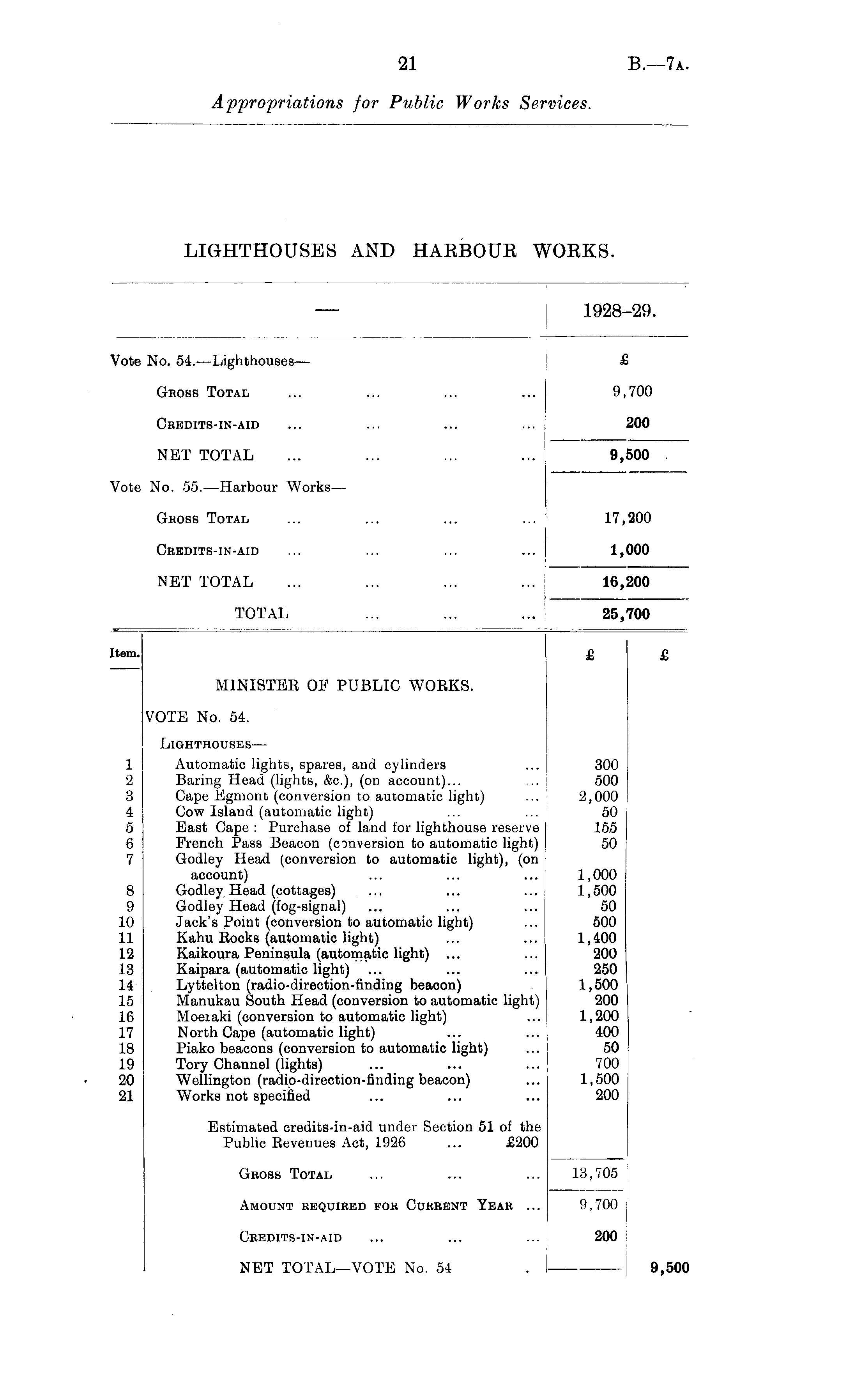 . I — 1928-29. Vote No. 54.—Lighthouses— £ Gboss Total ... ... ... ... 9,700 Credits-in-aid ... ... ... ... 200 NET TOTAL ... ... ... ... 9,500 . Vote No. 55.—Harbour Works— Gross Total ... ... ... ... 17,200 Credits-in-aid ... ... ... ... 1,000 NET TOTAL ... ... ... ... 16,200 TOTAL ... ... ... 25,700 Item. £ £ MINISTER OF PUBLIC WORKS. VOTE No. 54. Lighthouses— 1 Automatic lights, spares, and cylinders ... 300 2 Baring Head (lights, &c.), (on account)... ... 500 3 Cape Egmont (conversion to automatic light) ... 2,000 4 Cow Island (automatic light) ... ... 50 5 East Cape : Purchase of land for lighthouse reserve 15.5 6 French Pass Beacon (conversion to automatic light) 50 7 Godley Head (conversion to automatic light), (on account) ... ... ... 1,000 8 Godley Head (cottages) ... ... ... 1,500 9 Godley Head (fog-signal) ... ... ... 50 10 Jack's Point (conversion to automatic light) ... 500 11 Kahu Rocks (automatic light) ... ... 1,400 12 Kaikoura Peninsula (automatic light) ... ... 200 13 Kaipara (automatic light) ... ... ... 250 14 Lyttelton (radio-direction-finding beacon) 1,500 15 Manukau South Head (conversion to automatic light) 200 16 Moeiaki (conversion to automatic light) ... 1,200 17 North Cape (automatic light) ... ... 400 18 Piako beacons (conversion to automatic light) ... 50 19 Tory Channel (lights) ... ... ... 700 20 Wellington (radio-direction-finding beacon) ... 1,500 21 Works not specified ... ... ... 200 Estimated credits-in-aid under Section 51 of the Public Revenues Act, 1926 ... £200 Gross Total ... ... ... 13,705 Amount required for Current Year ... 9,700 Credits-in-aid ... ... ... 200 : NET TOTAL—VOTE No. 54 . 1 9,500