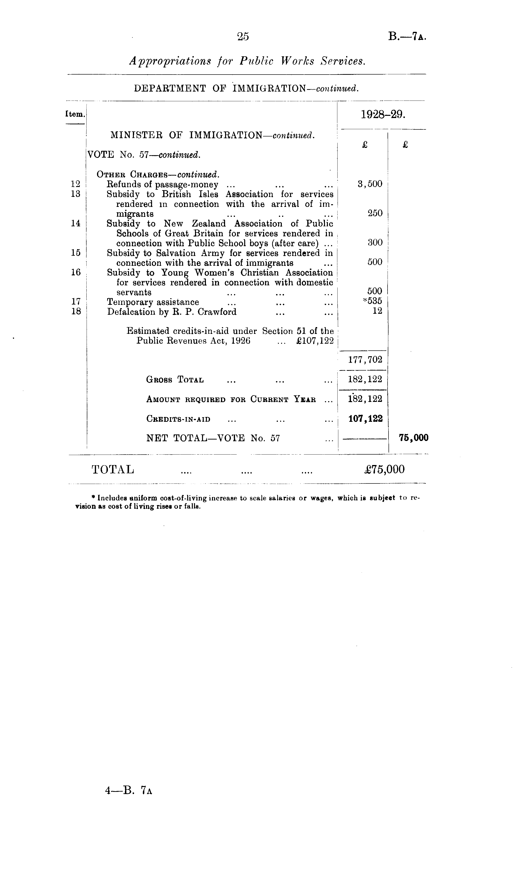 Item. 1928-29. I MINISTER OF IMMIGRATION—continued. £ £ VOTE No. 57 —continued. Otheb Chabges—continued. 12 | Refunds of passage-money ... ... ... 3,500 13 Subsidy to British Isles Association for services rendered in connection with the arrival of immigrants ... .. 250 14 i Subsidy to New Zealand Association of Public Schools of Great Britain for services rendered in connection with Public School boys (after care) ... 300 15 Subsidy to Salvation Army for services rendered in connection with the arrival of immigrants ... 500 16 Subsidy to Young Women's Christian Association for services rendered in connection with domestic servants ... ... ... 500 17 Temporary assistance ... ... ... *535 18 Defalcation by R. P. Crawford ... ... 12 Estimated credits-in-aid under Section 51 of the Public Revenues Act, 1926 ... £107,122 177,702 Gross Total ... ... ... 182,122 Amount requiked for Current Year ... 182,122 Credits-in-aid ... ... ... 107,122 NET TOTAL—VOTE No. 57 ... 75,000 TOTAL .... .... .... £75,000 * Includes uniform cost-of-living increase to scale salaries or wages, which is subjeet to revision as cost of living rises or falls.