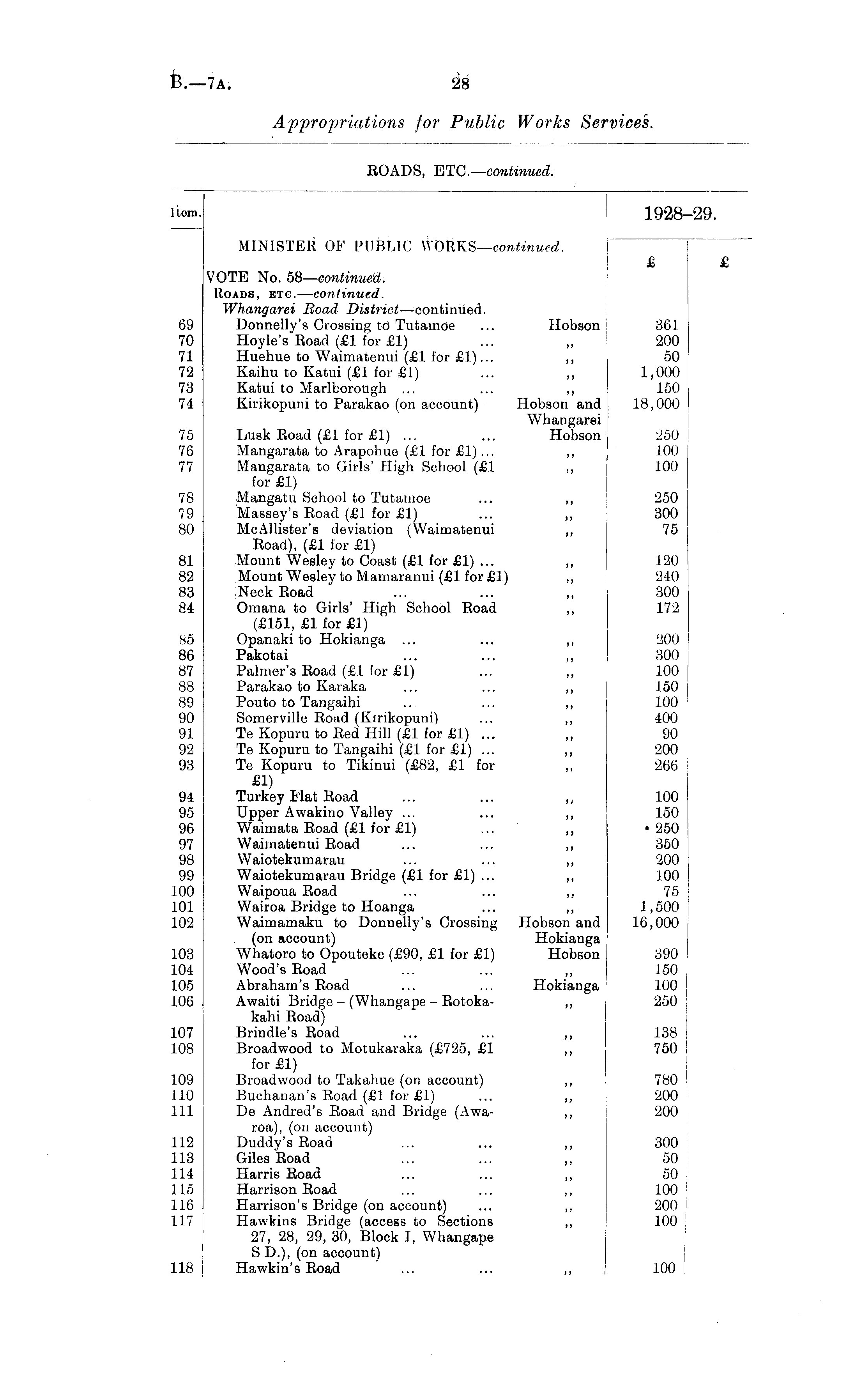 Item. 1928-29. MINISTER OF PUBLIC WORKS—continued. T~ £ £ VOTE No. 58—continued. Roads, etc. —continued. Whangarei Road District—continued. 69 Donnelly's Crossing to Tutamoe ... Hobson 361 70 Hoyle's Boad (£1 for £1) ... ,, 200 71 Huehue to Waimatenui (£1 for £1)... ,, 50 72 Kaihu to Katui (£1 for £1) ... ,, 1,000 73 Katui to Marlborough ... ... ,, 150 74 Kirikopuni to Parakao (on account) Hobson and 18,000 Whangarei 75 Lusk Road (£1 for £1) ... ... Hobson 250 76 Mangarata to Arapohue (£1 for £1)... ,, 100 77 Mangarata to Girls' High School (£1 ,, 100 for £1) 78 Mangatu School to Tutamoe ... ,, 250 79 Massey's Road (£1 for £1) ... ,, 300 80 McAllister's deviation (Waimatenui ,, 75 Road), (£1 for £1) 81 Mount Wesley to Coast (£1 for £1) ... ,, 120 82 Mount Wesley to Mamaranui (£1 for £1) ,, 240 83 Neck Road ... ... ,, 300 84 Omana to Girls' High School Road ,, 172 (£151, £1 for £1) 85 Opanaki to Hokianga ... ... ,, 200 86 Pakotai ... ... ,, 300 87 Palmer's Road (£1 for £1) ... ,, 100 88 Parakao to Karaka ... ... ,, 150 89 Pouto to Tangaihi .. ... ,, 100 90 Somerville Road (Kirikopuni) ... ,, 400 91 Te Kopuru to Red Hill (£1 for £1) ... ,, 90 92 Te Kopuru to Tangaihi (£1 for £1) ... ,, 200 93 Te Kopuru to Tikinui (£82, £1 for ,, 266 £1) 94 Turkey Hat Road ... ... ,, 100 95 Upper Awakino Valley ... ... ,, 150 96 Waimata Road (£1 for £1) ... ,, • 250 97 Waimatenui Road ... ... ,, 350 98 Waiotekumarau ... ... ,, 200 99 Waiotekumarau Bridge (£1 for £1) ... ,, 100 100 Waipoua Boad ... ... ,, 75 101 Wairoa Bridge to Hoanga ... ,, 1,500 102 Waimamaku to Donnelly's Crossing Hobson and 16,000 (on account) Hokianga 103 Whatoro to Opouteke (£90, £1 for £1) Hobson 390 104 Wood's Boad ... ... ,, 150 105 Abraham's Boad ... ... Hokianga 100 106 Awaiti Bridge - (Whangape - Botoka- ,, 250 kahi Boad) 107 Brindle's Boad ... ... ,, 138 108 Broadwood to Motukaraka (£725, £1 ,, 750 for £1) 109 Broadwood to Takahue (on account) ,, 780 110 Buchanan's Boad (£1 for £1) ... ,, 200 111 De Andred's Boad and Bridge (Awa- ,, 200 roa), (on account) 112 Duddy's Boad ... ... ,, 300 113 Giles Boad ... ... ,, 50 114 Harris Boad ... ... ,, 50 115 Harrison Boad ... ... ,, 100 116 Harrison's Bridge (on account) ... ,, 200 117 Hawkins Bridge (access to Sections ,, 100 27, 28, 29, 30, Block I, Whangape S D.), (on account) 118 Hawkin's Boad ... ... ,, 100