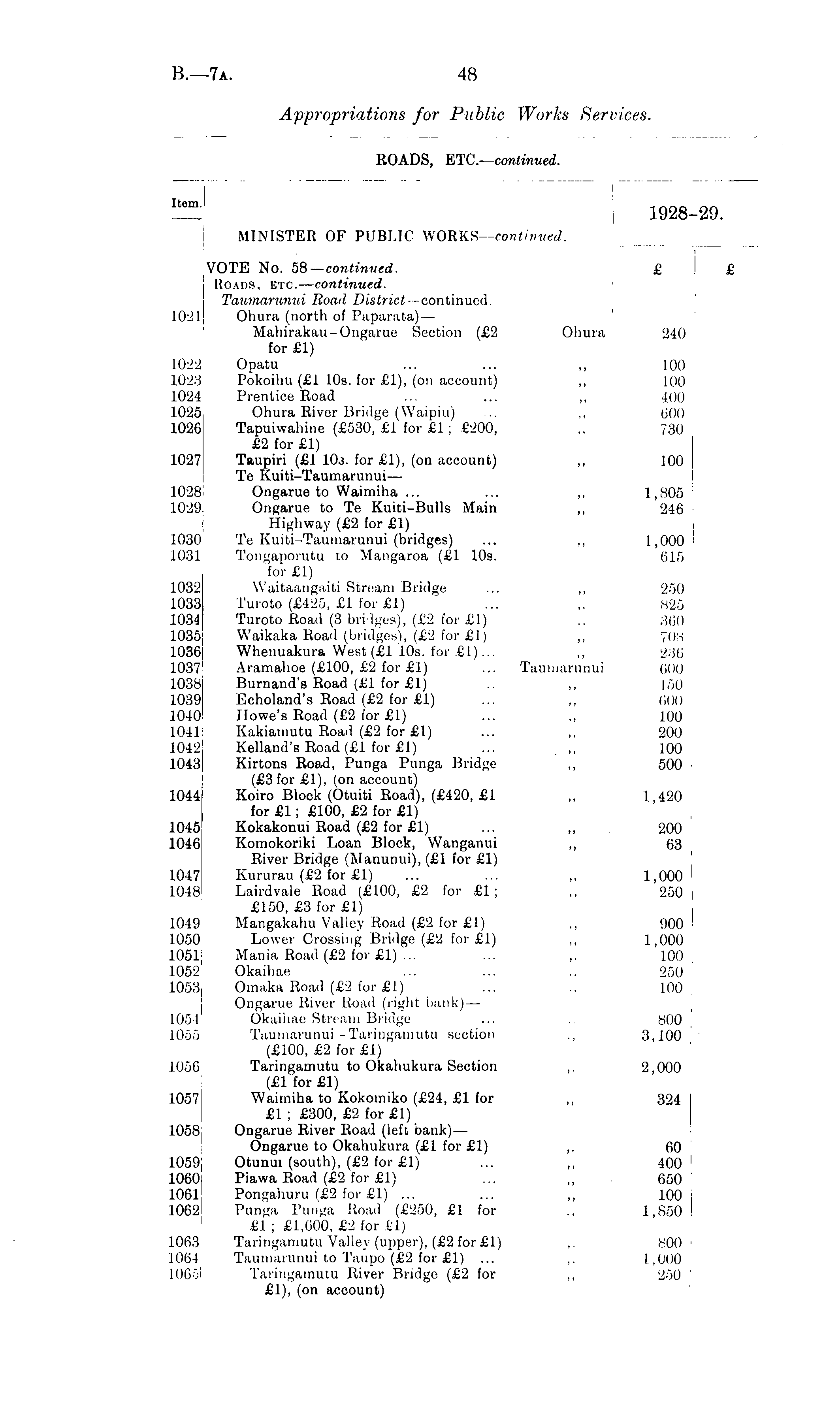 — 1928-29. MINISTER OF PUBLIC WORKS —continued. _ VOTE No. 58—continued. £ j £ IIoads, etc.—continued. Taumarunui Boad District—continued. 1021 Ohura (north of Paparata)— Mahirakau-Ongarue Section (£2 Ohura 240 for £1) 1022 Opatu ... ... ,, 100 1023 Pokoihu (£1 10s. for £1), (on account) „ 100 1024 Prentice Road ... ... ,, 400 1025 Ohura River Bridge (Waipiu) ... ,, 600 1026 Tapuiwahine (£530, £1 for £1; £200, ,, 730 £2 for £1) 1027 Taupiri (£1 10a. for £1), (on account) ,, 100 Te Kuiti-Taumarunui — 1028 Ongarue to Waimiha ... ... ,, 1,805 1029 Ongarue to Te Kuiti-Bulls Main ,, 246 Highway (£2 for £1) 1030 Te Kuiti-Taumarunui (bridges) ... ,, 1,000 1031 Tongaporutu to Mangaroa (£1 10s. 615 for £1) 1032 Waitaangaiti Stream Bridge ... ,, 250 1033 Turoto (£425, £1 for £1) ... ,, 825 1034 Turoto Road (3 bridges), (£2 for £1) ,, 360 j 1035 Waikaka Road (bridges), (£2 for £1) ,, 708 I 1036 Whenuakura West (£1 10s. for £1)... ,, 236 j 1037 Aramahoe (£100, £2 for £1) ... Taumarunui 600 j 1038 Burnand's Road (£1 for £1) .. ,, 150 j 1039 Bcholand's Road (£2 for £1) ... ,, 600 1040 Howe's Road (£2 for £1) ... ,, 100 I 1041 Kakiamutu Road (£2 for £1) ... ,, 200 1042 Kelland's Road (£1 for £1) ... ,, 100 1043 Kirtons Road, Punga Punga Bridge ,, 500 (£3 for £1), (on account) 1044 Koiro Block (Otuiti Road), (£420, £1 ,, 1,420 for £1; £100, £2 for £1) 1045 Kokakonui Road (£2 for £1) ... ,, 200 1046 Komokoriki Loan Block, Wanganui ,, 63 River Bridge (Manunui), (£1 for £1) 1047 Kururau (£2 for £1) ... ... ,, 1,000 1048 Lairdvale Road (£100, £2 for £1; ,, 250 £150, £3 for £1) 1049 Mangakahu Valley Road (£2 for. £1) ,, 900 1050 Lower Crossing Bridge (£2 for £1) ,, i 1,000 1051 Mania Road (£2 for £1) ... ... ,, j 100 1052 Okaihae ... ... ,, j 250 1053 Omaka Road (£2 for £1) ... ,, I 100 Ongarue River Road (right bank) — 1054 Okaihae Stream Bridge ... ,, j 800 1055 Taumarunui-Taringamutu section ., 3,100 (£100, £2 for £1) 1056 Taringamutu to Okahukura Section ,, 2,000 (£1 for £1) 1057 Waimiha to Kokomiko (£24, £1 for ,, 324 £1 ; £300, £2 for £1) 1058 Ongarue River Road (left bank) — Ongarue to Okahukura (£1 for £1) ,, 60 1059 Otunui (south), (£2 for £1) ... ,, 400 1060 Piawa Road (£2 for £1) ... ,, 650 1061 Pongahuru (£2 for £1) ... ... ,, 100 1062 Punga Punga Road (£250, £1 for 1,850 £1; £1,600, £2 for £1) 1063 Taringamutu Valley (upper), (£2 for £1) ,. 800 1064 Taumarunui to Taupo (£2 for £1) ... ,, 1,000 1065 Taringamutu River Bridge (£2 for ,, 250 £1), (on account)