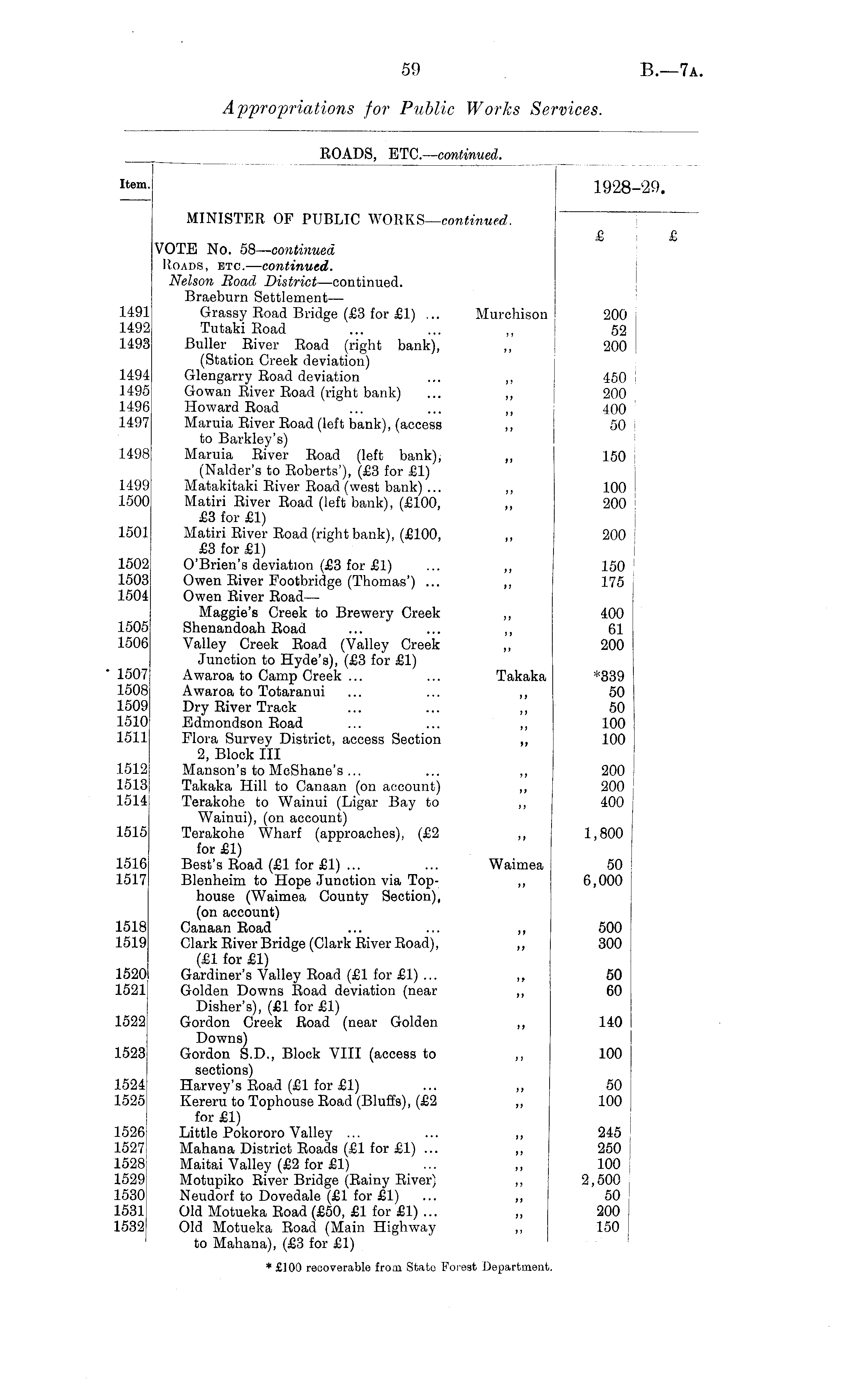 Item - 1928-29. MINISTER OF PUBLIC WORKS—continued. £ £ VOTE No. 58—continued Roads, etc. —continued. Nelson Road District—continued. Braeburn Settlement— 1491 Grassy Road Bridge (£3 for £1) ... Murchison 200 1492 Tutaki Road ... ... ,, 52 1493 Buller River Road (right bank), ,, 200 (Station Creek deviation) 1494 Glengarry Road deviation ... ,, 450 1495 Gowan River Road (right bank) ... ,, 200 1496 Howard Road ... ... ,, 400 1497 Maruia River Road (left bank), (access ,, 50 to Barkley's) 1498 Maruia River Road (left bank), ,, 150 (Nalder's to Roberts'), (£3 for £1) 1499 Matakitaki River Road (west bank) ... ,, 100 1500 Matiri River Road (left bank), (£100, ,, 200 } £3 for £1) 1501 Matiri River Road (right bank), (£100, ,, 200 £3 for £1) 1502 O'Brien's deviation (£3 for £1) ... ,, 150 1503 Owen River Footbridge (Thomas') ... „ 175 1504 Owen River Road— Maggie's Creek to Brewery Creek ,, 400 1505 Shenandoah Road ... ... ,, 61 1506 Valley Creek Road (Valley Creek ,, 200 Junction to Hyde's), (£3 for £1) 1507 Awaroa to Camp Creek ... ... Takaka *339 1508 Awaroa to Totaranui ... ... ,, 50 1509 Dry River Track ... ... ,, 50 1510 Edmondson Road ... ... ,, 100 1511 Flora Survey District, access Section ,, 100 2, Block III 1512 Manson's to McShane's... ... ,, 200 1513 Takaka Hill to Canaan (on account) ,, 200 1514 Terakohe to Wainui (Ligar Bay to ,, 400 Wainui), (on account) 1515 Terakohe Wharf (approaches), (£2 ,, 1,800 for £1) 1516 Best's Road (£1 for £1) ... ... Waimea 50 1517 Blenheim to Hope Junction via Top- ,, 6,000 house (Waimea County Section), (on account) 1518 Canaan Road ... ... ,, 500 1519 Clark River Bridge (Clark River Road), ,, 300 (£1 for £1) 1520 Gardiner's Valley Road (£1 for £1) ... ,, 50 1521 Golden Downs Road deviation (near ,, 60 Disher's), (£1 for £1) 1522 Gordon Creek Road (near Golden ,, 140 Downs) 1523 Gordon S.D., Block VIII (access to ,, 100 sections) 1524 Harvey's Road (£1 for £1) ... ,, 50 1525 Kereru to Tophouse Road (Bluffs), (£2 ,, 100 for £1) 1526 Little Pokororo Valley ... ... ,, 245 1527 Mahana District Roads (£1 for £1) ... ,, 250 1528 Maitai Valley (£2 for £1) ... „ 100 1529 Motupiko River Bridge (Rainy River) ,, 2,500 1530 Neudorf to Dovedale (£1 for £1) ... ,, 50 1531 Old Motueka Road (£50, £1 for £1) ... ,, 200 1532 Old Motueka Road (Main Highway ,, 150 to Mahana), (£3 for £1) * £100 recoverable froal State Forest Department.