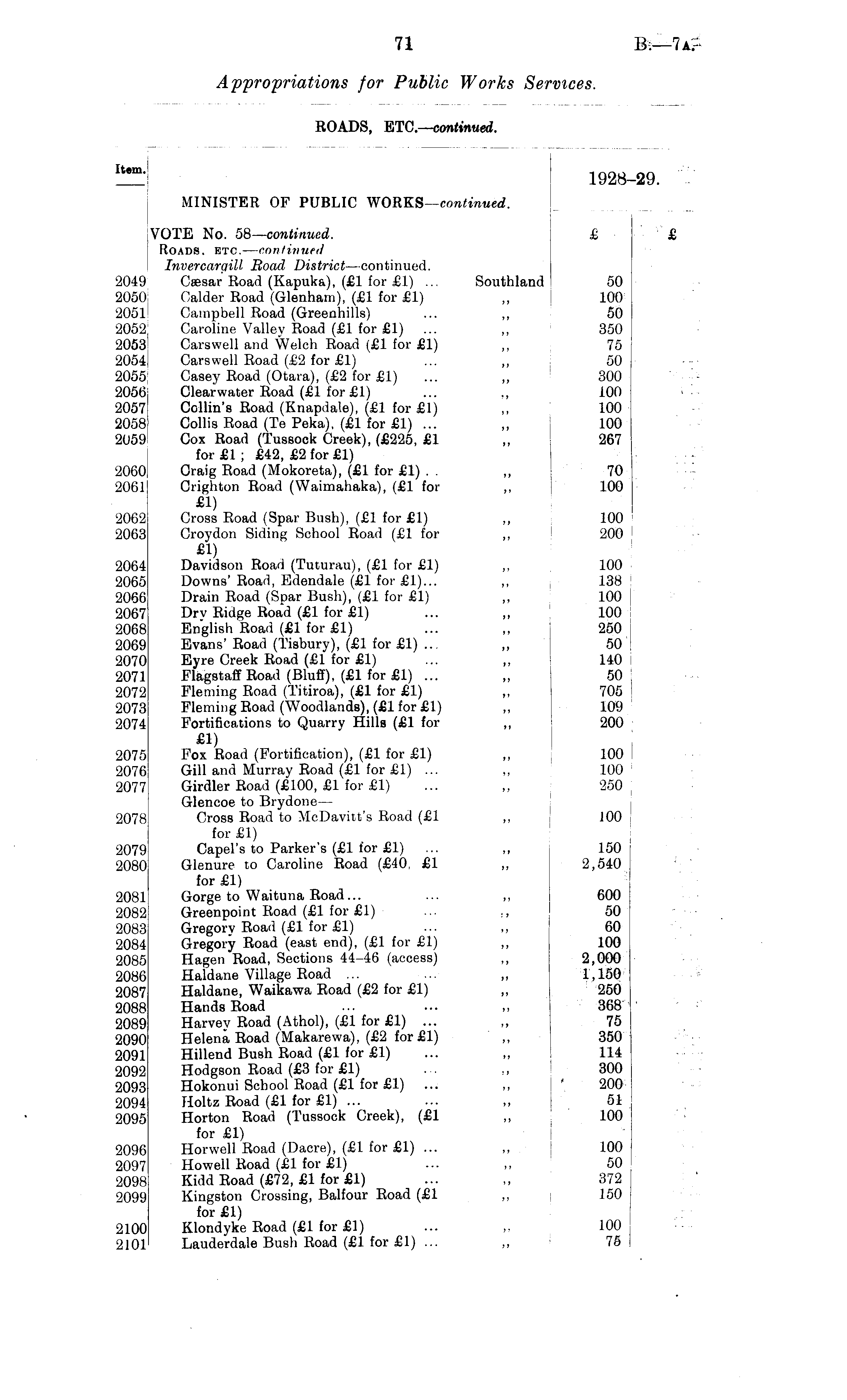 It8m ' 1928-29. MINISTER OF PUBLIC WORKS —continued. VOTE No. 58—continued. £ £ Roads, etc. —continued Invercaraill Road District—continued. 2049 Caesar Road (Kapuka), (£1 for £1) ... Southland 50 2050 Calder Road (Glenham), (£1 for £1) ,, 100 2051 Campbell Road (Greenhills) ... ,, 50 2052 Caroline Valley Road (£1 for £1) ... ,, 350 2053 Carswell and Welch Road (£1 for £1) ,, 75 2054 Carswell Road (£2 for £1) ... ,, j 50 2055 Casey Road (Otara), (£2 for £1) ... „ 300 2056 Clearwater Road (£1 for £1) ... ,, 100 2057 Collin's Road (Knapdale), (£1 for £1) ,, 100 2058 Collis Road (Te Peka), (£1 for £1) ... ,, 100 2059 Cox Road (Tussock Creek), (£225, £1 ,, 267 for £1 ; £42, £2 for £1) 2060 Craig Road (Mokoreta), (£1 for £1) . . ,, 70 2061 Crighton Road (Waimahaka), (£1 for ,, 100 £1) 2062 Cross Road (Spar Bush), (£1 for £1) ,, 100 2063 Croydon Siding School Road (£1 for ,, I 200 £1) 2064 Davidson Road (Tuturau), (£1 for £1) ,, 100 i 2065 Downs' Road, Edendale (£1 for £1)... ,, 138 2066 Drain Road (Spar Bush), (£1 for £1) ,, | 100 ' 2067 Dry Ridge Road (£1 for £1) ... „ 100 2068 English Road (£1 for £1) ... ,, 250 2069 Evans'Road (Tisbury), (£1 for £1) ... ,, 50 2070 Eyre Creek Road (£1 for £1) ... ,, 140 2071 Flagstaff Road (Bluff), (£1 for £1) ... ,, 50 ! 2072 Fleming Road (Titiroa), (£1 for £1) ,, 705 2073 Fleming Road (Woodlands), (£1 for £1) ,, 109 2074 Fortifications to Quarry Hills (£1 for ,, 200 £1) 2075 Fox Road (Fortification), (£1 for £1) ,, 100 j 2076 Gill and Murray Road (£1 for £1) ... ,, 100 j 2077 Girdler Road (£100, £1 for £1) ... ,, 250 Glencoe to Brydone — 2078 Cross Road to McDavitt's Road (£1 ,, 100 | for £1) 2079 Capel's to Parker's (£1 for £1) ... ,, 150 2080 Glenure to Caroline Road (£40, £1 ,, 2,540 for £1) 2081 Gorge to Waituna Road... ,, 600 2082 Greenpoint Road (£1 for £1) ... ., 50 2083 Gregory Road (£1 for £1) ... ,, I 60 2084 Gregory Road (east end), (£1 for £1) ,, j 100 2085 Hagen Road, Sections 44-46 (access) ,, 2,000 2086 Haldane Village Road ... ... ,, 1,150 2087 Haldane, Waikawa Road (£2 for £1) ,, 250 2088 Hands Road ... ... ,, 368 2089 Harvey Road (Athol), (£1 for £1) ... ,, 75 2090 Helena Road (Makarewa), (£2 for £1) ,, 350 2091 Hillend Bush Road (£1 for £1) ... ,, 114 2092 Hodgson Road (£3 for £1) ... ,, 300 2093 Hokonui School Road (£1 for £1) ... ,, ' 200 2094 Holtz Road (£1 for £1) ... ... „ 51 2095 Horton Road (Tussock Creek), (£1 ,, 100 for £1) 2096 Horwell Road (Dacre), (£1 for £1) ... ,, 100 2097 Howell Road (£1 for £1) ... ,, 50 2098 Kidd Road (£72, £1 for £1) ... „ 372 2099 Kingston Crossing, Balfour Road (£1 ,, | 150 for £1) 2100 Klondyke Road (£1 for £1) ... ,, 100 2101 Lauderdale Bush Road (£1 for £1) ... ,, ' 75