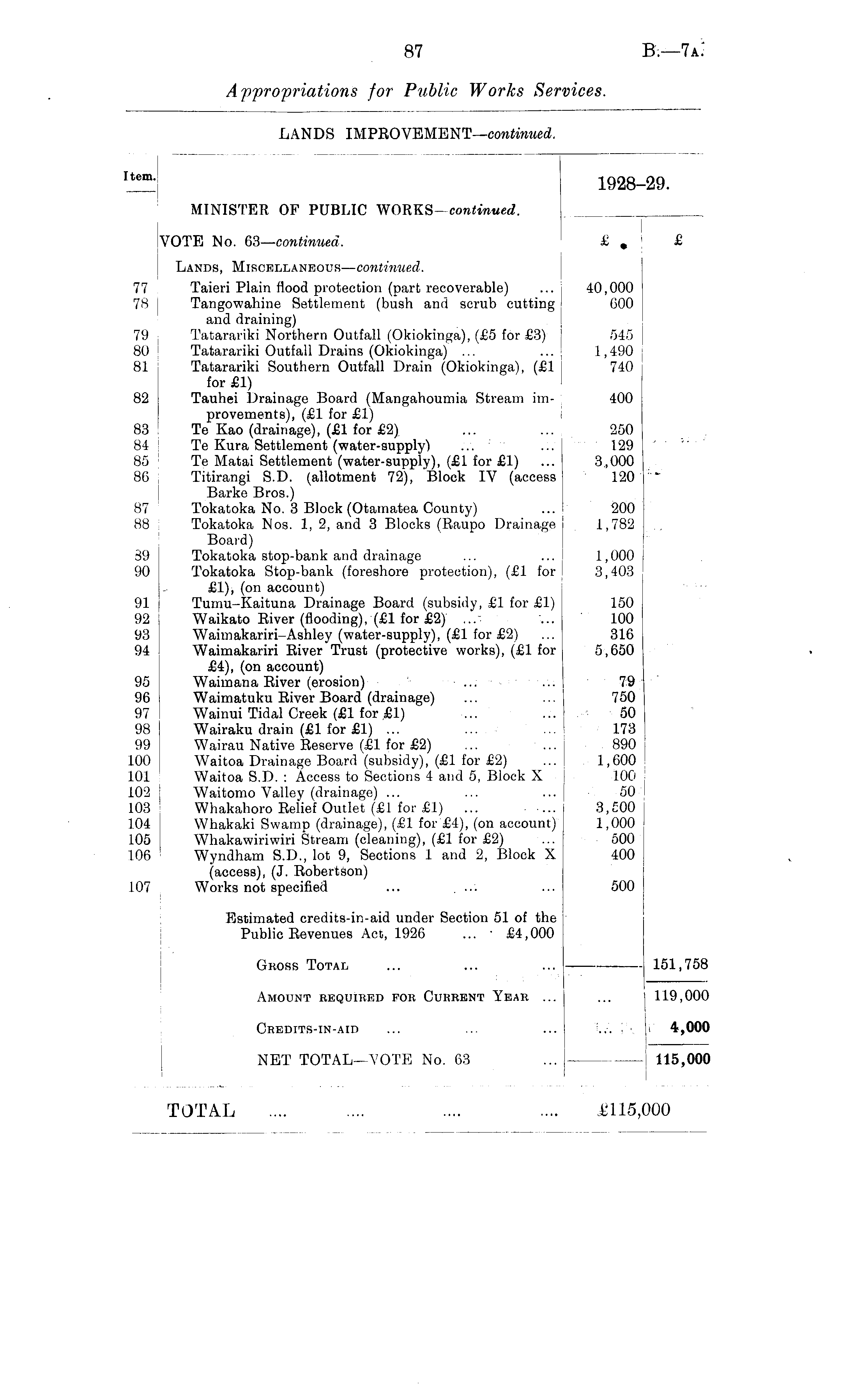Item - 1928-29. MINISTER OF PUBLIC WORKS —continued. . VOTE No. 63—continued. £ » £ Lands, Miscellaneous—continued. 77 Taieri Plain flood protection (part recoverable) ... 40,000 78 Tangowahine Settlement (bush and scrub cutting 600 and draining) 79 Tatarariki Northern Outfall (Okiokinga), (£5 for £3) 545 80 Tatarariki Outfall Drains (Okiokinga) ... ... 1,490 81 Tatarariki Southern Outfall Drain (Okiokinga), (£1 740 for £1) 82 Tauhei Drainage Board (Mangahoumia Stream im- 400 provements), (£1 for £1) 83 Te Kao (drainage), (£1 for £2) ... ... 250 84 Te Kura Settlement (water-supply) ... ... 129 85 Te Matai Settlement (water-supply), (£1 for £1) ... 3,000 86 Titirangi S.D. (allotment 72), Block IV (access 120 " Barke Bros.) 87 Tokatoka No. 3 Block (Otamatea County) ... 200 88 Tokatoka Nos. 1, 2, and 3 Blocks (Raupo Drainage 1,782 . Board) 39 Tokatoka stop-bank and drainage ... ... 1,000 90 Tokatoka Stop-bank (foreshore protection), (£1 for 3,403 £1), (on account) 91 Tumu-Kaituna Drainage Board (subsidy, £1 for £1) 150 92 Waikato River (flooding), (£1 for £2) ... ... 100 93 Waimakariri-Ashley (water-supply), (£1 for £2) ... 316 94 Waimakariri River Trust (protective works), (£1 for 5,650 £4), (on account) 95 Waimana River (erosion) ... ... 79 96 Waimatuku River Board (drainage) ... ... 750 97 Wainui Tidal Creek (£1 for £1) ... ... 50 98 Wairaku drain (£1 for £1) ... ... ... 173 99 Wairau Native Reserve (£1 for £2) ... ... 890 100 Waitoa Drainage Board (subsidy), (£1 for £2) ... 1,600 101 Waitoa S.D. : Access to Sections 4 and 5, Block X 100 102 Waitomo Valley (drainage) ... ... ... 50 103 Whakahoro Relief Outlet (£1 for £1) ... .... 3,500 104 Wbakaki Swamp (drainage), (£1 for £4), (on account) 1,000 105 Whakawiriwiri Stream (cleaning), (£1 for £2) ... 500 106 Wyndham S.D., lot 9, Sections 1 and 2, Block X 400 (access), (J. Robertson) 107 Works not specified ... ... ... 500 Estimated credits-in-aid under Section 51 of the Public Revenues Act, 1926 ... • £4,000 Gross Total ... ... ... 151,758 Amount required for Current Year ... ... 119,000 Credits-in-aid ... ... ... ... 4,000 NET TOTAL —"VOTE No. 63 ... 115,000 TOTAL .... .... £115,000