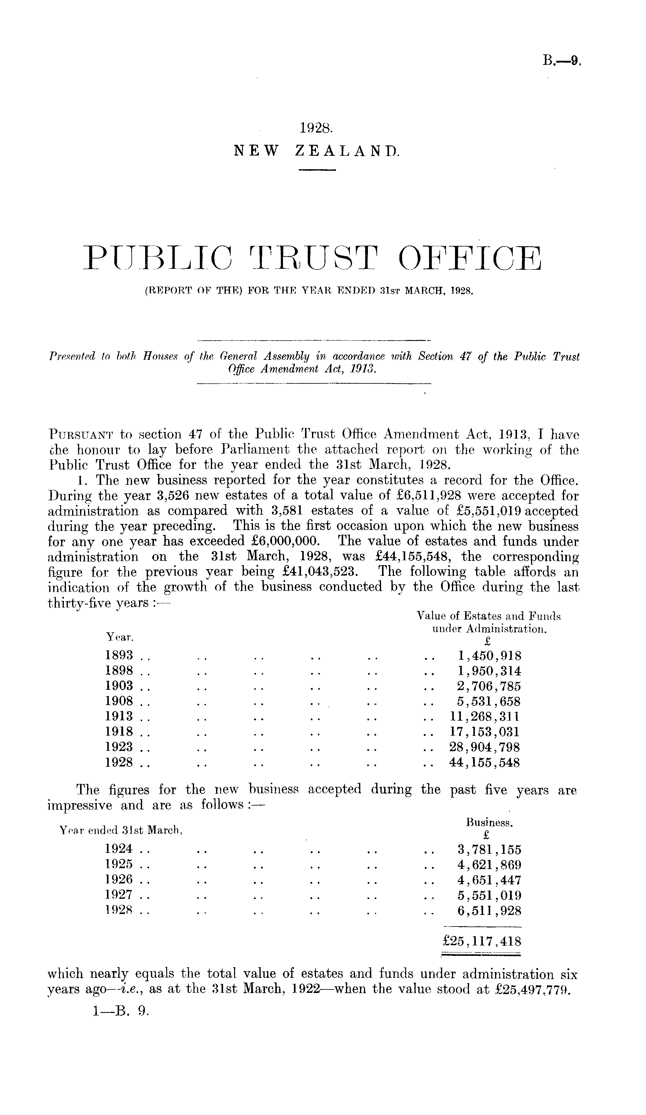 Pursuant to section 47 of the Public Trust Office Amendment Act, 1913, I have the honour to lay before Parliament the attached report on the working of the Public Trust Office for the year ended the 31st March, 1928. 1. The new business reported for the year constitutes a record for the Office. During the year 3,526 new estates of a total value of £6,511,928 were accepted for administration as compared with 3,581 estates of a value of £5,551,019 accepted during the year preceding. This is the first occasion upon which the new business for any one year has exceeded £6,000,000. The value of estates and funds under administration on the 31st March, 1928, was £44,155,548, the corresponding figure for the previous year being £41,043,523. The following table affords an indication of the growth of the business conducted by the Office during the last thirty-five years : — Value of Estates and Funds under Administration. Year. £ 1893.. .. .. .. .. .. 1,450,918 1898 . . .. .. .. .. .. 1,950,314 1903.. .. .. .. .. .. 2,706,785 1908.. .. .. ... .. .. 5,531,658 1913.. .. .. .. .. .. 11,268,311 1918.. .. .. .. .. .. 17,153,031 1923.. .. .. .. .. .. 28,904,798 1928.. .. .. .. .. .. 44,155,548 The figures for the new business accepted during the past five years are impressive and are as follows : — T , _ „„ . Business. Year ended .31st March, « 1924.. .. .. .. .. .. 3,781,155 1925.. .. .. .. .. .. 4,621,869 1926.. .. .. .. .. .. 4,651.447 1927 . . . . . . . . .. .. 5,551,019 1928 . . . . .. . . .. .. 6,511,928 £25,117,418 which nearly equals the total value of estates and funds under administration six years ago —i.e., as at the 31st March, 1922 —when the value stood at £25,497,779.
