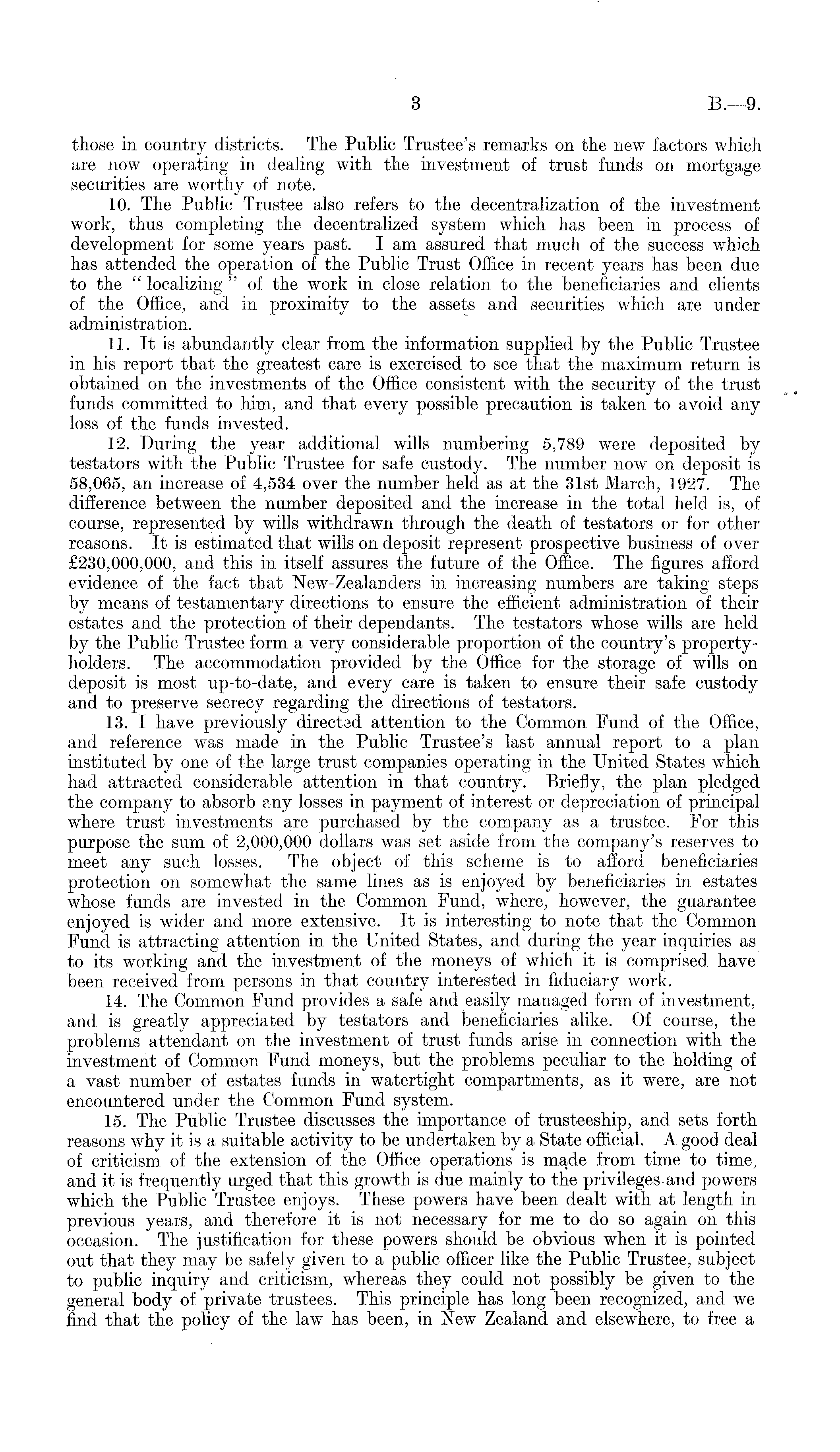 those in country districts. The Public Trustee's remarks on the new factors which are now operating in dealing with the investment of trust funds on mortgage securities are worthy of note. 10. The Public Trustee also refers to the decentralization of the investment work, thus completing the decentralized system which has been in process of development for some years past. lam assured that much of the success which has attended the operation of the Public Trust Office in recent years has been due to the " localizing " of the work in close relation to the beneficiaries and clients of the Office, and in proximity to the assets and securities which are under administration. 11. It is abundantly clear from the information supplied by the Public Trustee in his report that the greatest care is exercised to see that the maximum return is obtained on the investments of the Office consistent with the security of the trust funds committed to him, and that every possible precaution is taken to avoid any loss of the funds invested. 12. During the year additional wills numbering 5,789 were deposited by testators with the Public Trustee for safe custody. The number now on deposit is 58,065, an increase of 4,534 over the number held as at the 31st March, 1927. The difference between the number deposited and the increase in the total held is, of course, represented by wills withdrawn through the death of testators or for other reasons. It is estimated that wills on deposit represent prospective business of over £230,000,000, and this in itself assures the future of the Office. The figures afford evidence of the fact that New-Zealanders in increasing numbers are taking steps by means of testamentary directions to ensure the efficient administration of their estates and the protection of their dependants. The testators whose wills are held by the Public Trustee form a very considerable proportion of the country's propertyholders. The accommodation provided by the Office for the storage of wills on deposit is most up-to-date, and every care is taken to ensure their safe custody and to preserve secrecy regarding the directions of testators. 13. I have previously directed attention to the Common Fund of the Office, and reference was made in the Public Trustee's last annual report to a plan instituted by one of the large trust companies operating in the United States which had attracted considerable attention in that country. Briefly, the plan pledged the company to absorb any losses in payment of interest or depreciation of principal where trust investments are purchased by the company as a trustee. For this purpose the sum of 2,000,000 dollars was set aside from the company's reserves to meet any such losses. The object of this scheme is to afford beneficiaries protection on somewhat the same lines as is enjoyed by beneficiaries in estates whose funds are invested in the Common Fund, where, however, the guarantee enjoyed is wider and more extensive. It is interesting to note that the Common Fund is attracting attention in the United States, and during the year inquiries as to its working and the investment of the moneys of which it is comprised have been received from persons in that country interested in fiduciary work. 14. The Common Fund provides a safe and easily managed form of investment, and is greatly appreciated by testators and beneficiaries alike. Of course, the problems attendant on the investment of trust funds arise in connection with the investment of Common Fund moneys, but the problems peculiar to the holding of a vast number of estates funds in watertight compartments, as it were, are not encountered under the Common Fund system. 15. The Public Trustee discusses the importance of trusteeship, and sets forth reasons why it is a suitable activity to be undertaken by a State official. A good deal of criticism of the extension of the Office operations is made from time to time, and it is frequently urged that this growth is due mainly to the privileges and powers which the Public Trustee enjoys. These powers have been dealt with at length in previous years, and therefore it is not necessary for me to do so again on this occasion. The justification for these powers should be obvious when it is pointed out that they may be safely given to a public officer like the Public Trustee, subject to public inquiry and criticism, whereas they could not possibly be given to the general body of private trustees. This principle has long been recognized, and we find that the policy of the law has been, in New Zealand and elsewhere, to free a