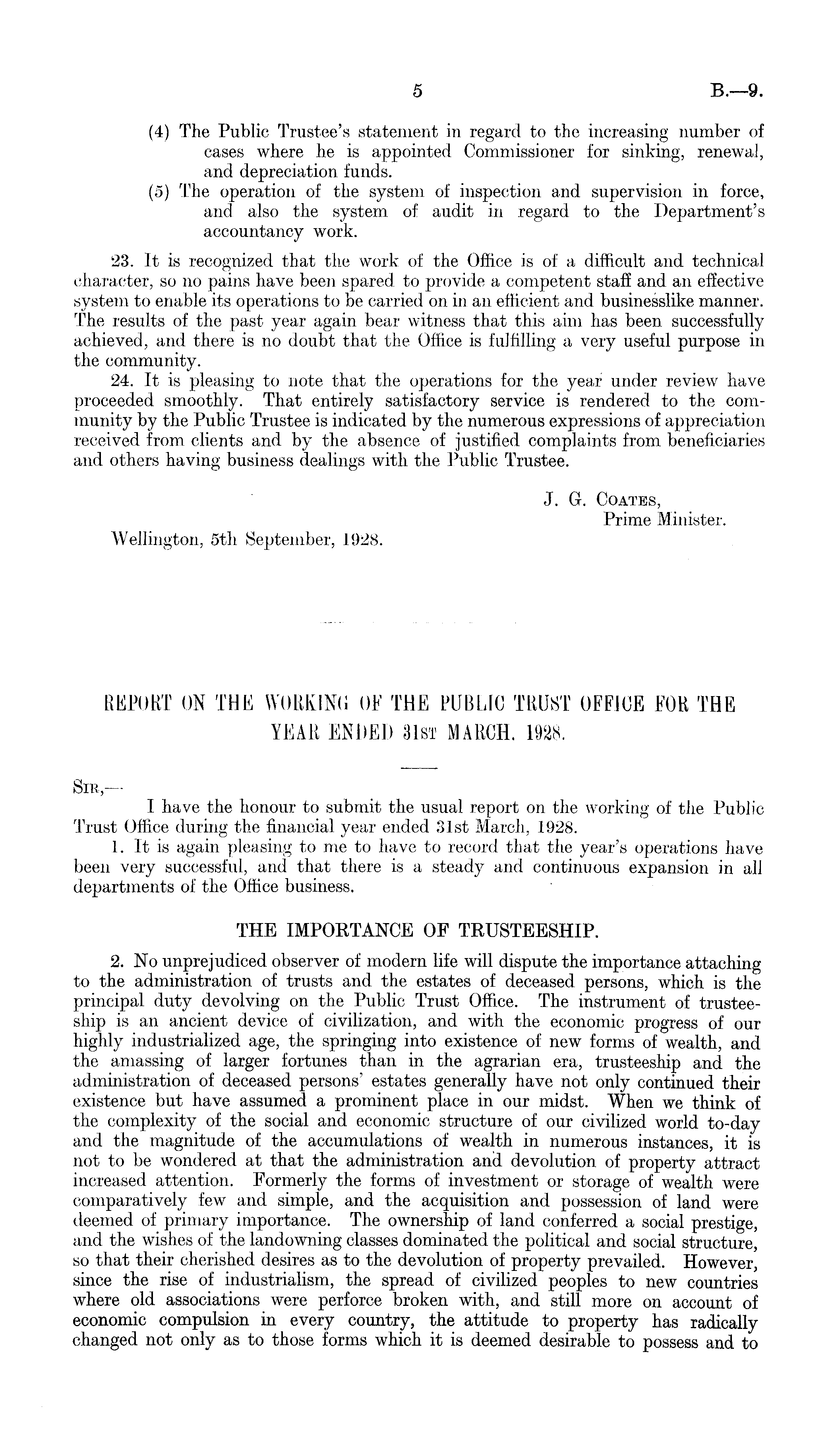 (4) The Public Trustee's statement in regard to the increasing number of cases where he is appointed Commissioner for sinking, renewal, and depreciation funds. (5) The operation of the system of inspection and supervision in force, and also the system of audit in regard to the Department's accountancy work. 23. It is recognized that the work of the Office is of a difficult and technical character, so no pains have been spared to provide a competent staff and an effective system to enable its operations to be carried on in an efficient and businesslike manner. The results of the past year again bear witness that this aim has been successfully achieved, and there is no doubt that the Office is fulfilling a very useful purpose in the community. 24. It is pleasing to note that the operations for the year under review have proceeded smoothly. That entirely satisfactory service is rendered to the community by the Public Trustee is indicated by the numerous expressions of appreciation received from clients and by the absence of justified complaints from beneficiaries and others having business dealings with the Public Trustee. J. G. Coaxes, Prime Minister. Wellington, sth September, 1928. REPORT ON THE WORKING OF THE PUBLIC TRUST OFFICE FOR THE YEAR ENDED 31st MARCH. 11128. Sib, — I have the honour to submit the usual report on the working of the Public Trust Office during the financial year ended 31st March, 1928. 1. It is again pleasing to me to have to record that the year's operations have been very successful, and that there is a steady and continuous expansion in all departments of the Office business. THE IMPORTANCE OF TRUSTEESHIP. 2. No unprejudiced observer of modern life will dispute the importance attaching to the administration of trusts and the estates of deceased persons, which is the principal duty devolving on the Public Trust Office. The instrument of trusteeship is an ancient device of civilization, and with the economic progress of our highly industrialized age, the springing into existence of new forms of wealth, and the amassing of larger fortunes than in the agrarian era, trusteeship and the administration of deceased persons' estates generally have not only continued their existence but have assumed a prominent place in our midst. When we think of the complexity of the social and economic structure of our civilized world to-day and the magnitude of the accumulations of wealth in numerous instances, it is not to be wondered at that the administration and devolution of property attract increased attention. Formerly the forms of investment or storage of wealth were comparatively few and simple, and the acquisition and possession of land were deemed of primary importance. The ownership of land conferred a social prestige, and the wishes of the landowning classes dominated the political and social structure, so that their cherished desires as to the devolution of property prevailed. However, since the rise of industrialism, the spread of civilized peoples to new countries where old associations were perforce broken with, and still more on account of economic compulsion in every country, the attitude to property has radically changed not only as to those forms which it is deemed desirable to possess and to