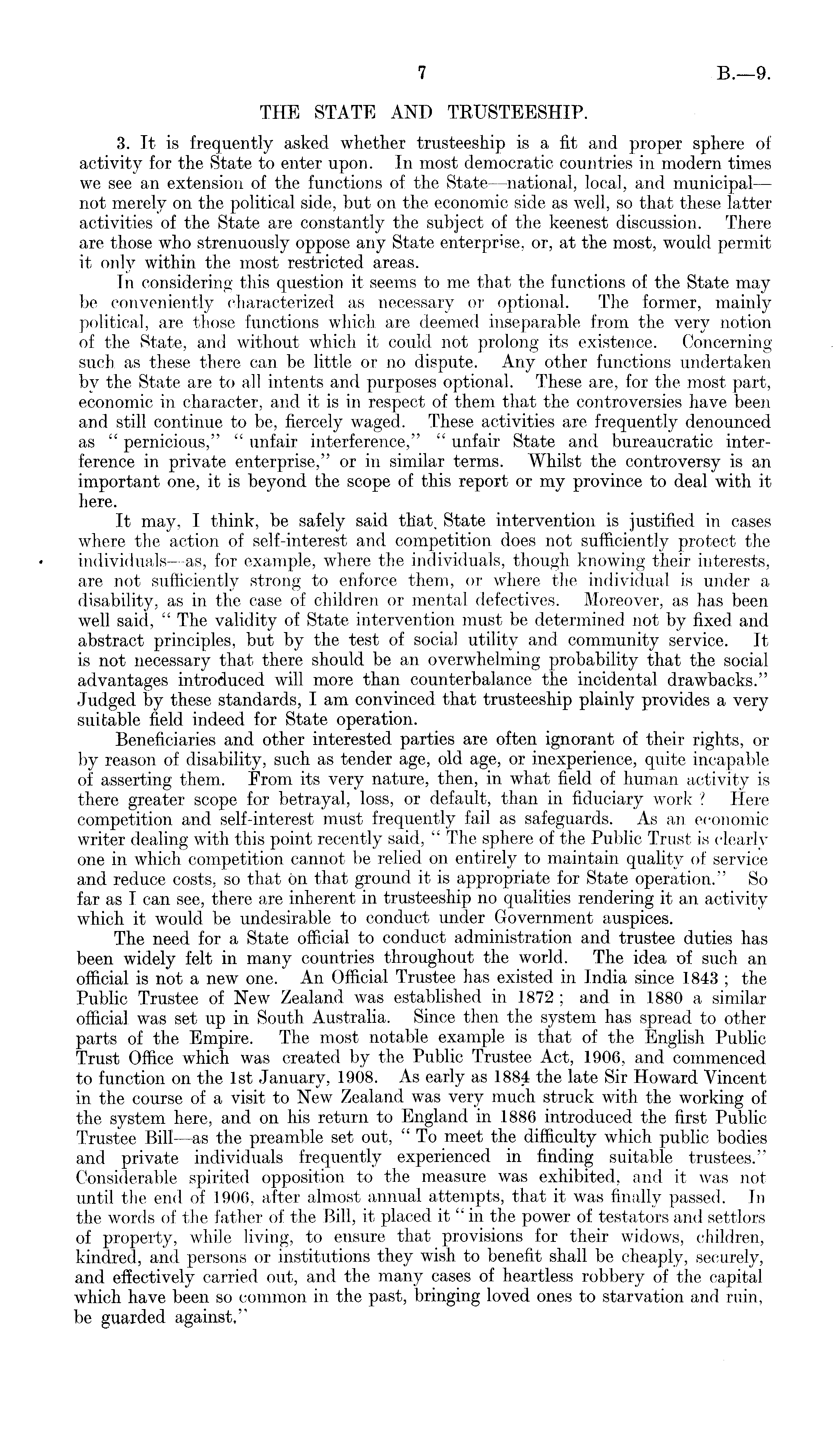 THE STATE AND TRUSTEESHIP. 3. It is frequently asked whether trusteeship is a fit and proper sphere of activity for the State to enter upon. In most democratic countries in modern times we see an extension of the functions of the State —national, local, and municipal— not merely on the political side, but on the economic side as well, so that these latter activities of the State are constantly the subject of the keenest discussion. There are those who strenuously oppose any State enterprise, or, at the most, would permit it onlv within the most restricted areas. In considering this question it seems to me that the functions of the State may be conveniently characterized as necessary or optional. The former, mainly political, are those functions which are deemed inseparable from the very notion of the State, and without which it could not prolong its existence. Concerning such as these there can be little or no dispute. Any other functions undertaken by the State are to all intents and purposes optional. These are, for the most part, economic in character, and it is in respect of them that the controversies have been and still continue to be, fiercely waged. These activities are frequently denounced as " pernicious," " unfair interference," " unfair State and bureaucratic interference in private enterprise," or in similar terms. Whilst the controversy is an important one, it is beyond the scope of this report or my province to deal with it here. It may, I think, be safely said that. State intervention is justified in cases where the action of self-interest and competition does not sufficiently protect the individuals —as, for example, where the individuals, though knowing their interests, are not sufficiently strong to enforce them, or where the individual is under a disability, as in the case of children or mental defectives. Moreover, as has been well said, " The validity of State intervention must be determined not by fixed and abstract principles, but by the test of social utility and community service. It is not necessary that there should be an overwhelming probability that the social advantages introduced will more than counterbalance the incidental drawbacks." Judged by these standards, I am convinced that trusteeship plainly provides a very suitable field indeed for State operation. Beneficiaries and other interested parties are often ignorant of their rights, or by reason of disability, such as tender age, old age, or inexperience, quite incapable of asserting them. From its very nature, then, in what field of human activity is there greater scope for betrayal, loss, or default, than in fiduciary work ? Here competition and self-interest must frequently fail as safeguards. As an economic writer dealing with this point recently said, " The sphere of the Public Trust is clearly one in which competition cannot be relied on entirely to maintain quality of service and reduce costs, so that on that ground it is appropriate for State operation." So far as I can see, there are inherent in trusteeship no qualities rendering it an activity which it would be undesirable to conduct under Government auspices. The need for a State official to conduct administration and trustee duties has been widely felt in many countries throughout the world. The idea of such an official is not a new one. An Official Trustee has existed in India since 1843 ; the Public Trustee of New Zealand was established in 1872; and in 1880 a similar official was set up in South Australia. Since then the system has spread to other parts of the Empire. The most notable example is that of the English Public Trust Office which was created by the Public Trustee Act, 1906, and commenced to function on the Ist January, 1908. As early as 1884 the late Sir Howard Vincent in the course of a visit to New Zealand was very much struck with the working of the system here, and on his return to England in 1886 introduced the first Public Trustee Bill —as the preamble set out, " To meet the difficulty which public bodies and private individuals frequently experienced in finding suitable trustees." Considerable spirited opposition to the measure was exhibited, and it was not until the end of 1906, after almost annual attempts, that it was finally passed. In the words of the father of the Bill, it placed it " in the power of testators and settlors of property, while living, to ensure that provisions for their widows, children, kindred, and persons or institutions they wish to benefit shall be cheaply, securely, and effectively carried out, and the many cases of heartless robbery of the capital which have been so common in the past, bringing loved ones to starvation and ruin, be guarded against,"