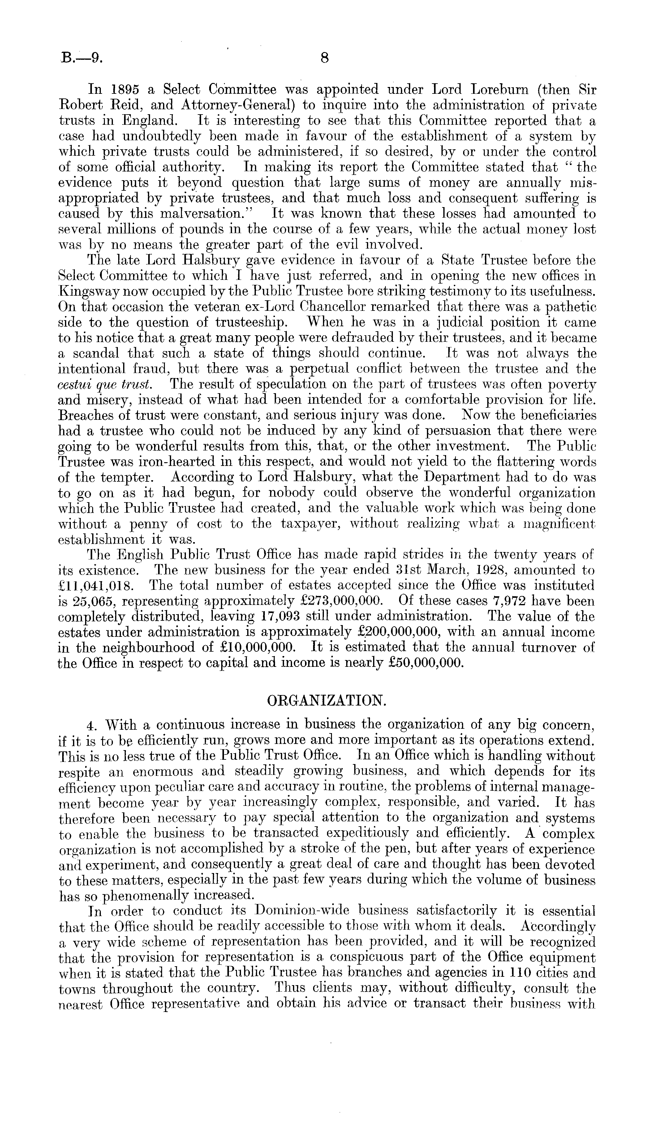 In 1895 a Select Committee was appointed under Lord Loreburn (then Sir Robert Reid, and Attorney-General) to inquire into the administration of private trusts in England. It is interesting to see that this Committee reported that a case had undoubtedly been made in favour of the establishment of a system by which private trusts could be administered, if so desired, by or under the control of some official authority. In making its report the Committee stated that " the evidence puts it beyond question that large sums of money are annually misappropriated by private trustees, and that much loss and consequent suffering is caused by this malversation." It was known that these losses had amounted to several millions of pounds in the course of a few years, while the actual money lost was by no means the greater part of the evil involved. The late Lord Halsbury gave evidence in favour of a State Trustee before the Select Committee to which I have just referred, and in opening the new offices in Kingsway now occupied by the Public Trustee bore striking testimony to its usefulness. On that occasion the veteran ex-Lord Chancellor remarked that there was a pathetic side to the question of trusteeship. When he was in a judicial position it came to his notice that a great many people were defrauded by their trustees, and it became a scandal that such a state of things should continue. It was not always the intentional fraud, but there was a perpetual conflict between the trustee and the cestui que trust. The result of speculation on the part of trustees was often poverty and misery, instead of what had been intended for a comfortable provision for life. Breaches of trust were constant, and serious injury was done. Now the beneficiaries had a trustee who could not be induced by any kind of persuasion that there were going to be wonderful results from this, that, or the other investment. The Public Trustee was iron-hearted in this respect, and would not yield to the flattering words of the tempter. According to Lord Halsbury, what the Department had to do was to go on as it had begun, for nobody could observe the wonderful organization which the Public Trustee had created, and the valuable work which was being done without a penny of cost to the taxpayer, without realizing what a magnificent establishment it was. The English Public Trust Office has made rapid strides in the twenty years of its existence. The new business for the year ended 31st March, 1928, amounted to £11,041,018. The total number of estates accepted since the Office was instituted is 25,065, representing approximately £273,000,000. Of these cases 7,972 have been completely distributed, leaving 17,093 still under administration. The value of the estates under administration is approximately £200,000,000, with an annual income in the neighbourhood of £10,000,000. It is estimated that the annual turnover of the Office in respect to capital and income is nearly £50,000,000. ORGANIZATION. 4. With a continuous increase in business the organization of any big concern, if it is to be efficiently run, grows more and more important as its operations extend. This is no less true of the Public Trust Office. In an Office which is handling without respite an enormous and steadily growing business, and which depends for its efficiency upon peculiar care and accuracy in routine, the problems of internal management become year by year increasingly complex, responsible, and varied. It has therefore been necessary to pay special attention to the organization and systems to enable the business to be transacted expeditiously and efficiently. A complex organization is not accomplished by a stroke of the pen, but after years of experience and experiment, and consequently a great deal of care and thought has been devoted to these matters, especially in the past few years during which the volume of business has so phenomenally increased. Tn order to conduct its Dominion-wide business satisfactorily it is essential that the Office should be readily accessible to those with whom it deals. Accordingly a very wide scheme of representation has been provided, and it will be recognized that the provision for representation is a conspicuous part of the Office equipment when it is stated that the Public Trustee has branches and agencies in 110 cities and towns throughout the country. Thus clients may, without difficulty, consult the nearest Office representative and obtain his advice or transact their business with