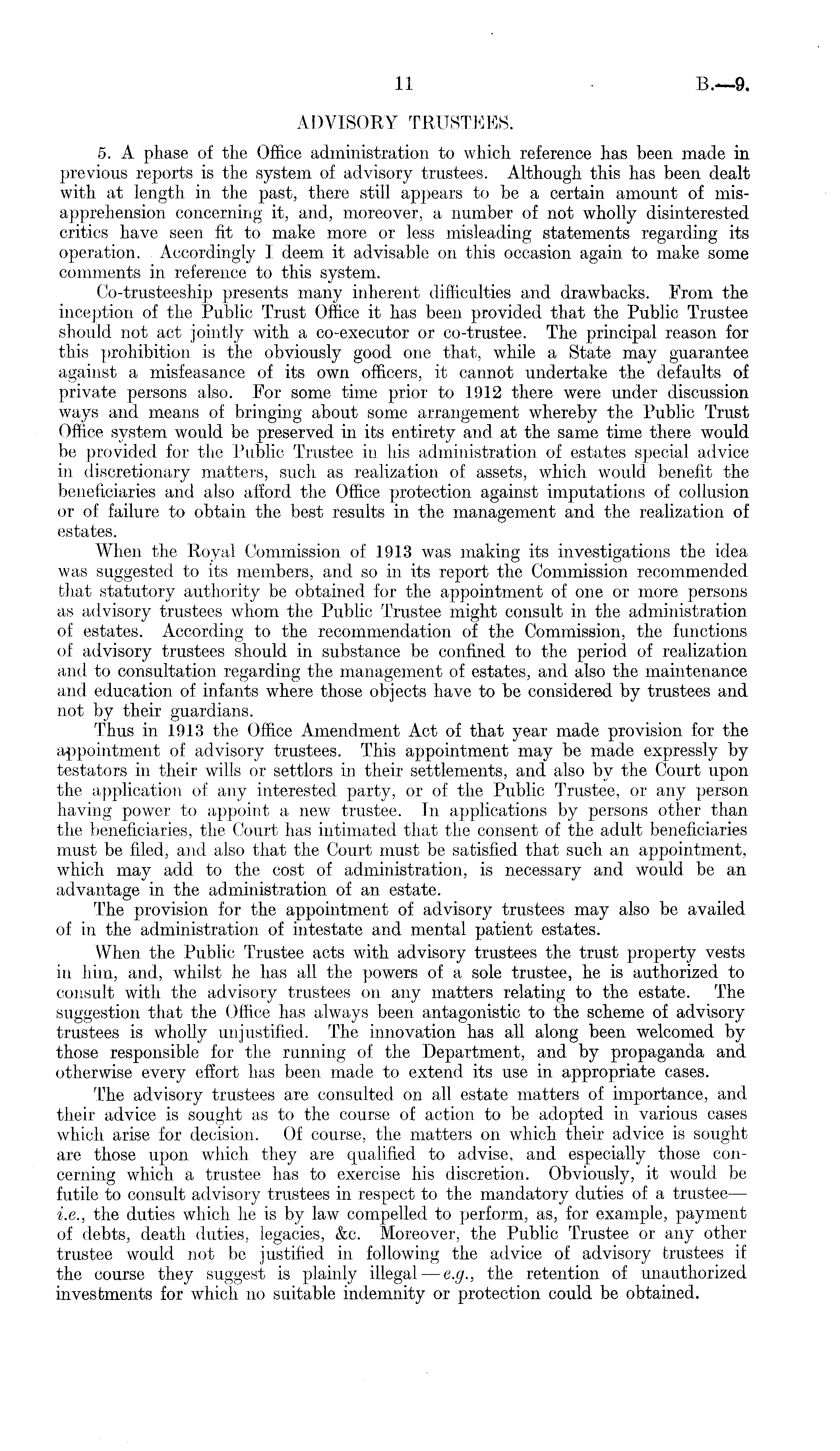 ADVISORY TRUSTEES. 5. A phase of the Office administration to which reference has been made in previous reports is the system of advisory trustees. Although this has been dealt with at length in the past, there still appears to be a certain amount of misapprehension concerning it, and, moreover, a number of not wholly disinterested critics have seen fit to make more or less misleading statements regarding its operation. Accordingly I deem it advisable on this occasion again to make some comments in reference to this system. Co-trusteeship presents many inherent difficulties and drawbacks. From the inception of the Public Trust Office it has been provided that the Public Trustee should not act jointly with a co-executor or co-trustee. The principal reason for this prohibition is the obviously good one that, while a State may guarantee against a misfeasance of its own officers, it cannot undertake the defaults of private persons also. For some time prior to 1912 there were under discussion ways and means of bringing about some arrangement whereby the Public Trust Office system would be preserved in its entirety and at the same time there would be provided for the Public Trustee in his administration of estates special advice in discretionary matters, such as realization of assets, which would benefit the beneficiaries and also afford the Office protection against imputations of collusion or of failure to obtain the best results in the management and the realization of estates. When the Royal Commission of 1913 was making its investigations the idea was suggested to its members, and so in its report the Commission recommended that statutory authority be obtained for the appointment of one or more persons as advisory trustees whom the Public Trustee might consult in the administration of estates. According to the recommendation of the Commission, the functions of advisory trustees should in substance be confined to the period of realization and to consultation regarding the management of estates, and also the maintenance and education of infants where those objects have to be considered by trustees and not by their guardians. Thus in 1913 the Office Amendment Act of that year made provision for the appointment of advisory trustees. This appointment may be made expressly by testators in their wills or settlors in their settlements, and also by the Court upon the application of any interested party, or of the Public Trustee, or any person having power to appoint a new trustee. In applications by persons other than the beneficiaries, the Court has intimated that the consent of the adult beneficiaries must be filed, and also that the Court must be satisfied that such an appointment, which may add to the cost of administration, is necessary and would be an advantage in the administration of an estate. The provision for the appointment of advisory trustees may also be availed of in the administration of intestate and mental patient estates. When the Public Trustee acts with advisory trustees the trust property vests iu him, and, whilst he has all the powers of a sole trustee, he is authorized to consult with the advisory trustees on any matters relating to the estate. The suggestion that the Office has always been antagonistic to the scheme of advisory trustees is wholly unjustified. The innovation has all along been welcomed by those responsible for the running of the Department, and by propaganda and otherwise every effort has been made to extend its use in appropriate cases. The advisory trustees are consulted on all estate matters of importance, and their advice is sought as to the course of action to be adopted in various cases which arise for decision. Of course, the matters on which their advice is sought are those upon which they are qualified to advise, and especially those concerning which a trustee has to exercise his discretion. Obviously, it would be futile to consult advisory trustees in respect to the mandatory duties of a trustee — i.e., the duties which he is by law compelled to perform, as, for example, payment of debts, death duties, legacies, &c. Moreover, the Public Trustee or any other trustee would not be justified in following the advice of advisory trustees if the course they suggest is plainly illegal — e.g., the retention of unauthorized investments for which no suitable indemnity or protection could be obtained.