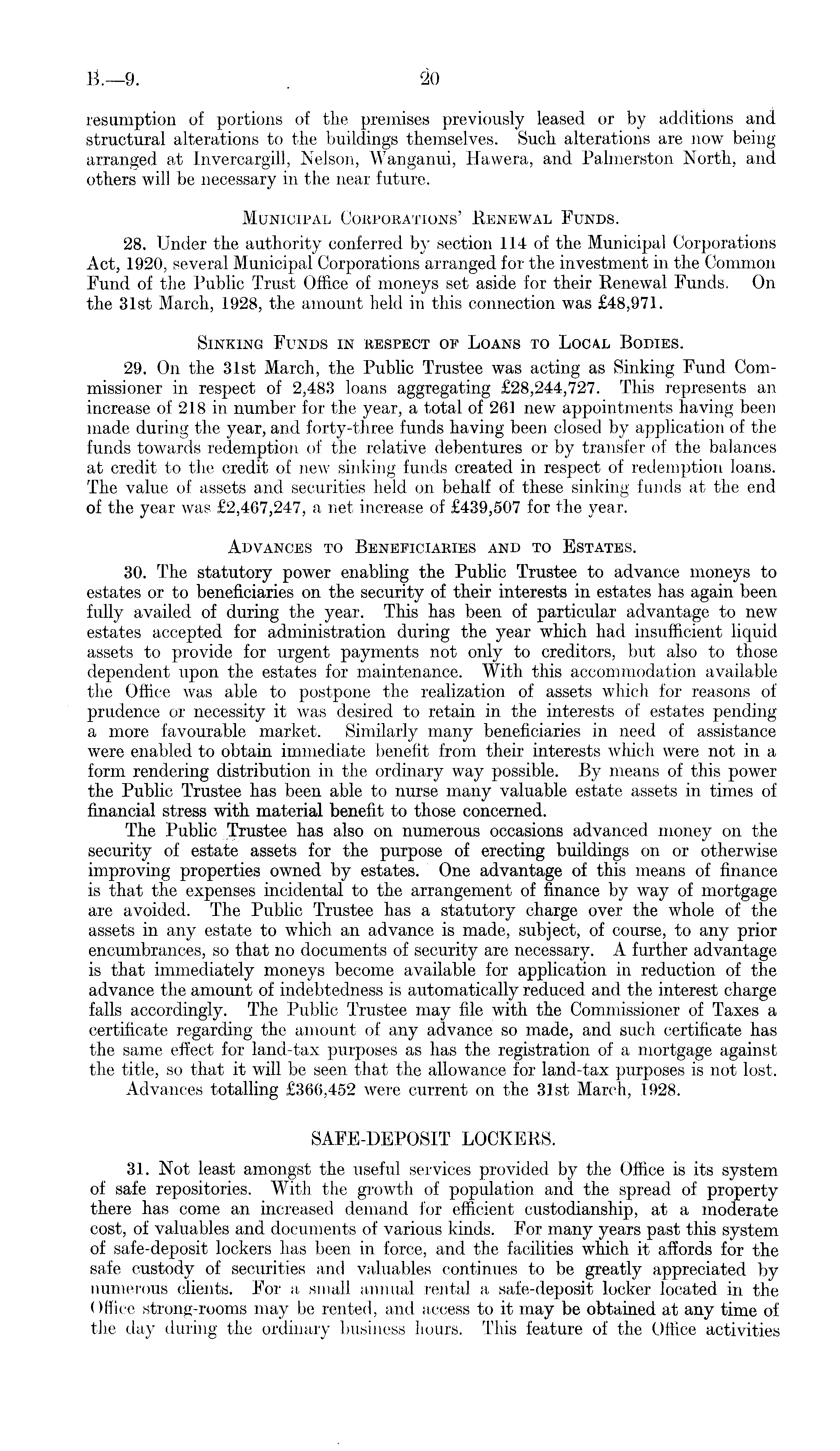 resumption of portions of tlie premises previously leased or by additions and structural alterations to the buildings themselves. Such alterations are now being arranged at Invercargill, Nelson, Wanganui, Hawera, and Palmerston North, and others will be necessary in the near future. Municipal Corporations' Renewal Funds. 28. Under the authority conferred by section 114 of the Municipal Corporations Act, 1920, several Municipal Corporations arranged for the investment in the Common Fund of the Public Trust Office of moneys set aside for their Renewal Funds. On the 31st March, 1928, the amount held in this connection was £48,971. Sinking Funds in respect of Loans to Local Bodies. 29. On the 31st March, the Public Trustee was acting as Sinking Fund Commissioner in respect of 2,483 loans aggregating £28,244,727. This represents an increase of 218 in number for the year, a total of 261 new appointments having been made during the year, and forty-three funds having been closed by application of the funds towards redemption of the relative debentures or by transfer of the balances at credit to the credit of new sinking funds created in respect of redemption loans. The value of assets and securities held on behalf of these sinking funds at the end of the year was £2,467,247, a net increase of £439,507 for the year. Advances to Beneficiaries and to Estates. 30. The statutory power enabling the Public Trustee to advance moneys to estates or to beneficiaries on the security of their interests in estates has again been fully availed of during the year. This has been of particular advantage to new estates accepted for administration during the year which had insufficient liquid assets to provide for urgent payments not only to creditors, but also to those dependent upon the estates for maintenance. With this accommodation available the Office was able to postpone the realization of assets which for reasons of prudence or necessity it was desired to retain in the interests of estates pending a more favourable market. Similarly many beneficiaries in need of assistance were enabled to obtain immediate benefit from their interests which were not in a form rendering distribution in the ordinary way possible. By means of this power the Public Trustee has been able to nurse many valuable estate assets in times of financial stress with material benefit to those concerned. The Public Trustee has also on numerous occasions advanced money on the security of estate assets for the purpose of erecting buildings on or otherwise improving properties owned by estates. One advantage of this means of finance is that the expenses incidental to the arrangement of finance by way of mortgage are avoided. The Public Trustee has a statutory charge over the whole of the assets in any estate to which an advance is made, subject, of course, to any prior encumbrances, so that no documents of security are necessary. A further advantage is that immediately moneys become available for application in reduction of the advance the amount of indebtedness is automatically reduced and the interest charge falls accordingly. The Public Trustee may file with the Commissioner of Taxes a certificate regarding the amount of any advance so made, and such certificate has the same effect for land-tax purposes as has the registration of a mortgage against the title, so that it will be seen that the allowance for land-tax purposes is not lost. Advances totalling £366,452 were current on the 31st March, 1928. SAFE-DEPOSIT LOCKERS. 31. Not least amongst the useful services provided by the Office is its system of safe repositories. With the growth of population and the spread of property there has come an increased demand for efficient custodianship, at a moderate cost, of valuables and documents of various kinds. For many years past this system of safe-deposit lockers has been in force, and the facilities which it affords for the safe custody of securities and valuables continues to be greatly appreciated by numerous clients. For a small annual rental a safe-deposit locker located in the Office strong-rooms may be rented, and access to it may be obtained at any time of the day during the ordinary business hours. This feature of the Office activities