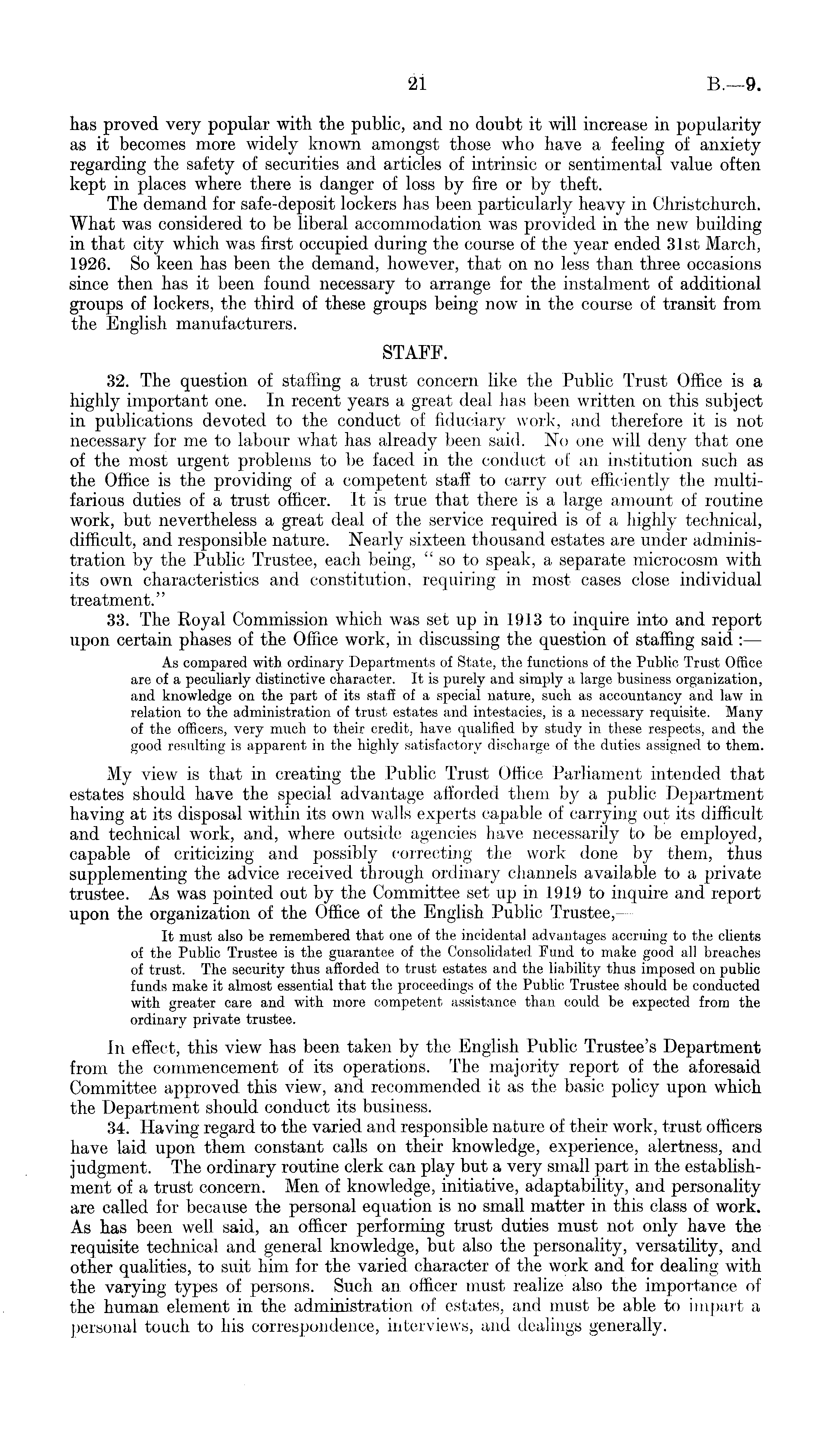 lias proved very popular with the public, and no doubt it will increase in popularity as it becomes more widely known amongst those who have a feeling of anxiety regarding the safety of securities and articles of intrinsic or sentimental value often kept in places where there is danger of loss by fire or by theft. The demand for safe-deposit lockers lias been particularly heavy in Christchurch. What was considered to be liberal accommodation was provided in the new building in that city which was first occupied during the course of the year ended 31st March, 1926. So keen has been the demand, however, that on no less than three occasions since then has it been found necessary to arrange for the instalment of additional groups of lockers, the third of these groups being now in the course of transit from the English manufacturers. STAFF. 32. The question of staffing a trust concern like the Public Trust Office is a highly important one. In recent years a great deal has been written on this subject in publications devoted to the conduct of fiduciary work, and therefore it is not necessary for me to labour what has already been said. No one will deny that one of the most urgent problems to be faced in the conduct of an institution such as the Office is the providing of a competent staff to carry out efficiently the multifarious duties of a trust officer. It is true that there is a large amount of routine work, but nevertheless a great deal of the service required is of a highly technical, difficult, and responsible nature. Nearly sixteen thousand estates are under administration by the Public Trustee, each being, "so to speak, a separate microcosm with its own characteristics and constitution, requiring in most cases close individual treatment." 33. The Royal Commission which was set up in 1913 to inquire into and report upon certain phases of the Office work, in discussing the question of staffing said:— As compared with ordinary Departments of State, the functions of the Public Trust Office are of a peculiarly distinctive character. It is purely and simply a large business organization, and knowledge on the part of its staff of a special nature, such as accountancy and law in relation to the administration of trust estates and intestacies, is a necessary requisite. Many of the officers, very much to their credit, have qualified by study in these respects, and the good resulting is apparent in the highly satisfactory discharge of the duties assigned to them. My view is that in creating the Public Trust Office Parliament intended that estates should have the special advantage afforded them by a public Department having at its disposal within its own walls experts capable of carrying out its difficult and technical work, and, where outside agencies have necessarily to be employed, capable of criticizing and possibly correcting the work done by them, thus supplementing the advice received through ordinary channels available to a private trustee. As was pointed out by the Committee set up in 1919 to inquire and report upon the organization of the Office of the English Public Trustee,It must also be remembered that one of the incidental advantages accruing to the clients of the Public Trustee is the guarantee of the Consolidated Fund to make good all breaches of trust. The security thus afforded to trust estates and the liability thus imposed on public funds make it almost essential that the proceedings of the Public Trustee should be conducted with greater care and with more competent assistance than could be expected from the ordinary private trustee. In effect, this view has been taken by the English Public Trustee's Department from the commencement of its operations. The majority report of the aforesaid Committee approved this view, and recommended it as the basic policy upon which the Department should conduct its business. 34. Having regard to the varied and responsible nature of their work, trust officers have laid upon them constant calls on their knowledge, experience, alertness, and judgment. The ordinary routine clerk can play but a very small part in the establishment of a trust concern. Men of knowledge, initiative, adaptability, and personality are called for because the personal equation is no small matter in this class of work. As has been well said, an officer performing trust duties must not only have the requisite technical and general knowledge, but also the personality, versatility, and other qualities, to suit him for the varied character of the work and for dealing with the varying types of persons. Such an officer must realize also the importance of the human element in the administration of estates, and must be able to impart a personal touch to his correspondence, interviews, and dealings generally.