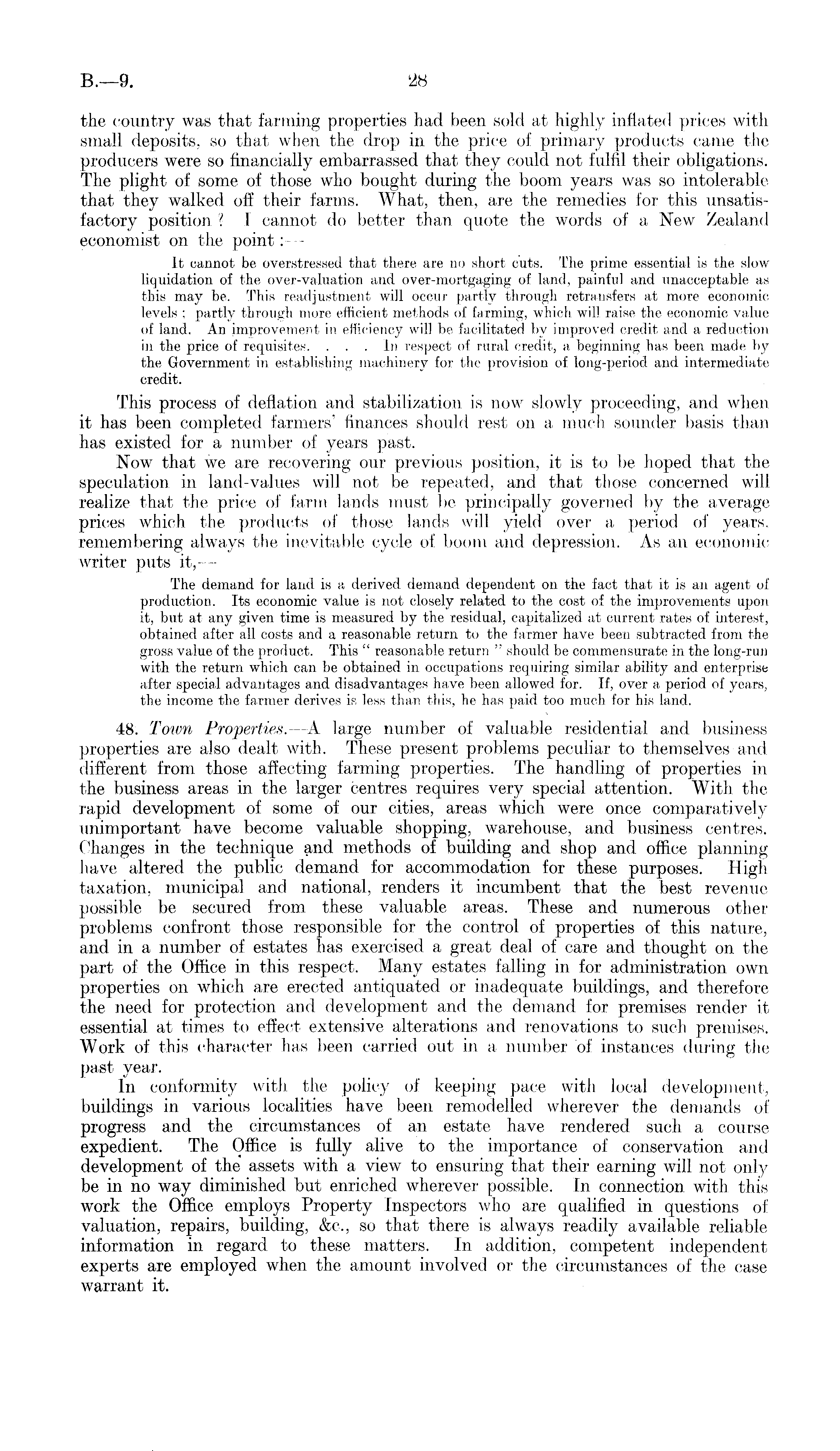 the country was that farming properties had been sold at highly inflated prices with small deposits, so that when the drop in the price of primary products came the producers were so financially embarrassed that they could not fulfil their obligations. The plight of some of those who bought during the boom years was so intolerable that they walked off their farms. What, then, are the remedies for this unsatisfactory position ? I cannot do better than quote the words of a New Zealand economist on the point:--It cannot be overstressed that there are 110 short cuts. The prime essential is the slow liquidation of the over-valuation and over-mortgaging of land, painful and unacceptable as this may be. This readjustment will occur partly through retransfers at more economic levels ; partly through more efficient methods of farming, which will raise the economic value of land. An improvement in efficiency will be facilitated by improved credit and a reduction in the price of requisites. ... In respect of rural credit, a beginning has been made by the Government in establishing machinery for the provision of long-period and intermediate credit. This process of deflation and stabilization is now slowly proceeding, and when it has been completed farmers' finances should rest on a much sounder basis than has existed for a number of years past. Now that we are recovering our previous position, it is to be hoped that the speculation in land-values will not be repeated, and that those concerned will realize that the price of farm lands must lie principally governed by the average prices which the products of those lands will yield over a period of years, remembering always the inevitable cycle of boom and depression. As an economic writer puts it, — The demand for land is a derived demand dependent on the fact that it is an agent of production. Its economic value is not closely related to the cost of the improvements upon it, but at any given time is measured by the residual, capitalized at current rates of interest, obtained after all costs and a reasonable return to the farmer have been subtracted from the gross value of the product. This " reasonable return " should be commensurate in the long-run with the return which can be obtained in occupations requiring similar ability and enterprise after special advantages and disadvantages have been allowed for. If, over a period of years, the income the farmer derives is less than this, he has paid too much for his land. 48. Town Properties. —A large number of valuable residential and business properties are also dealt with. These present problems peculiar to themselves and different from those affecting farming properties. The handling of properties in the business areas in the larger centres requires very special attention. With the rapid development of some of our cities, areas which were once comparatively unimportant have become valuable shopping, warehouse, and business centres. Changes in the technique and methods of building and shop and office planning have altered the public demand for accommodation for these purposes. High taxation, municipal and national, renders it incumbent that the best revenue possible be secured from these valuable areas. These and numerous other problems confront those responsible for the control of properties of this nature, and in a number of estates has exercised a great deal of care and thought on the part of the Office in this respect. Many estates falling in for administration own properties on which are erected antiquated or inadequate buildings, and therefore the need for protection and development and the demand for premises render itessential at times to effect extensive alterations and renovations to such premises. Work of this character has been carried out in a number of instances during the past year. In conformity with the policy of keeping pace with local development, buildings in various localities have been remodelled wherever the demands of progress and the circumstances of an estate have rendered such a course expedient. The Office is fully alive to the importance of conservation and development of the assets with a view to ensuring that their earning will not only be in no way diminished but enriched wherever possible. In connection with this work the Office employs Property Inspectors who are qualified in questions of valuation, repairs, building, &c., so that there is always readily available reliable information in regard to these matters. In addition, competent independent experts are employed when the amount involved or the circumstances of the case warrant it.