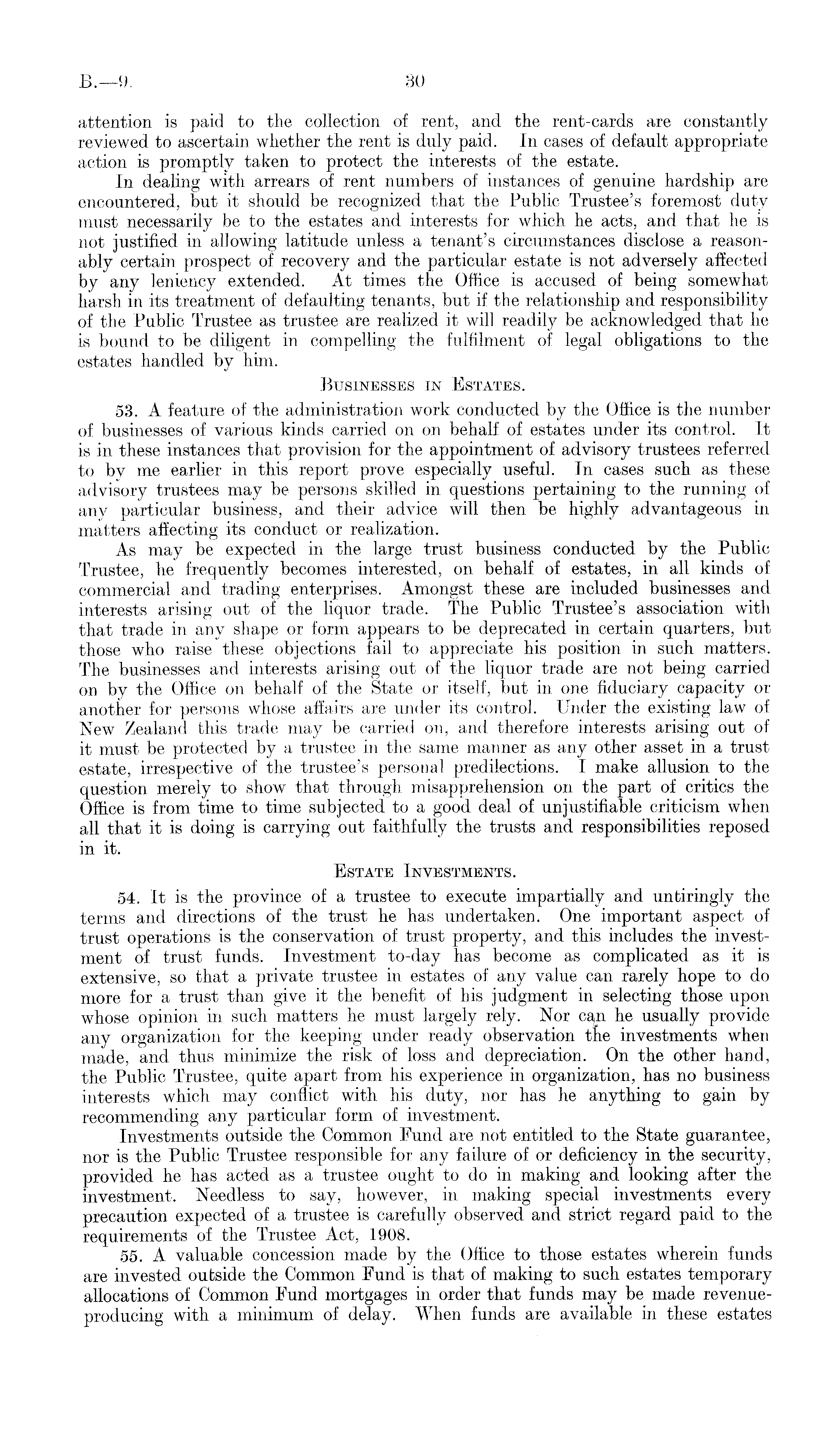 attention is paid to the collection of rent, and the rent-cards are constantly reviewed to ascertain whether the rent is duly paid. In cases of default appropriate action is promptly taken to protect the interests of the estate. In dealing with arrears of rent numbers of instances of genuine hardship are encountered, but it should be recognized that the Public Trustee's foremost duty must necessarily be to the estates and interests for which he acts, and that he is not justified in allowing latitude unless a tenant's circumstances disclose a reasonably certain prospect of recovery and the particular estate is not adversely affected by any leniency extended. At times the Office is accused of being somewhat harsh in its treatment of defaulting tenants, but if the relationship and responsibility of the Public Trustee as trustee are realized it will readily be acknowledged that he is bound to be diligent in compelling the fulfilment of legal obligations to the estates handled by him. Businesses in Estates. 53. A feature of the administration work conducted by the Office is the number of businesses of various kinds carried on on behalf of estates under its control. It is in these instances that provision for the appointment of advisory trustees referred to by me earlier in this report prove especially useful. In cases such as these advisory trustees may be persons skilled in questions pertaining to the running of any particular business, and their advice will then be highly advantageous in matters affecting its conduct or realization. As may be expected in the large trust business conducted by the Public Trustee, he frequently becomes interested, on behalf of estates, in all kinds of commercial and trading enterprises. Amongst these are included businesses and interests arising out of the liquor trade. The Public Trustee's association with that trade in any shape or form appears to be deprecated in certain quarters, but those who raise these objections fail to appreciate his position in such matters. The businesses and interests arising out of the liquor trade are not being carried on by the Office on behalf of the State or itself, but in one fiduciary capacity or another for persons whose affairs are under its control. Under the existing law of New Zealand this trade may be carried on, and therefore interests arising out of it must be protected by a trustee in the same manner as any other asset in a trust estate, irrespective of the trustee's personal predilections. I make allusion to the question merely to show that through misapprehension on the part of critics the Office is from time to time subjected to a good deal of unjustifiable criticism when all that it is doing is carrying out faithfully the trusts and responsibilities reposed in it. Estate Investments. 54. It is the province of a trustee to execute impartially and untiringly the terms and directions of the trust he has undertaken. One important aspect of trust operations is the conservation of trust property, and this includes the investment of trust funds. Investment to-day has become as complicated as it is extensive, so that a private trustee in estates of any value can rarely hope to do more for a trust than give it the benefit of his judgment in selecting those upon whose opinion in such matters he must largely rely. Nor c%n he usually provide any organization for the keeping under ready observation the investments when made, and thus minimize the risk of loss and depreciation. On the other hand, the Public Trustee, quite apart from his experience in organization, has no business interests which may conflict with his duty, nor has he anything to gain by recommending any particular form of investment. Investments outside the Common Fund are not entitled to the State guarantee, nor is the Public Trustee responsible for any failure of or deficiency in the security, provided he has acted as a trustee ought to do in making and looking after the investment. Needless to say, however, in making special investments every precaution expected of a trustee is carefully observed and strict regard paid to the requirements of the Trustee Act, 1908. 55. A valuable concession made by the Office to those estates wherein funds are invested outside the Common Fund is that of making to such estates temporary allocations of Common Fund mortgages in order that funds may be made revenueproducing with a minimum of delay. When funds are available in these estates