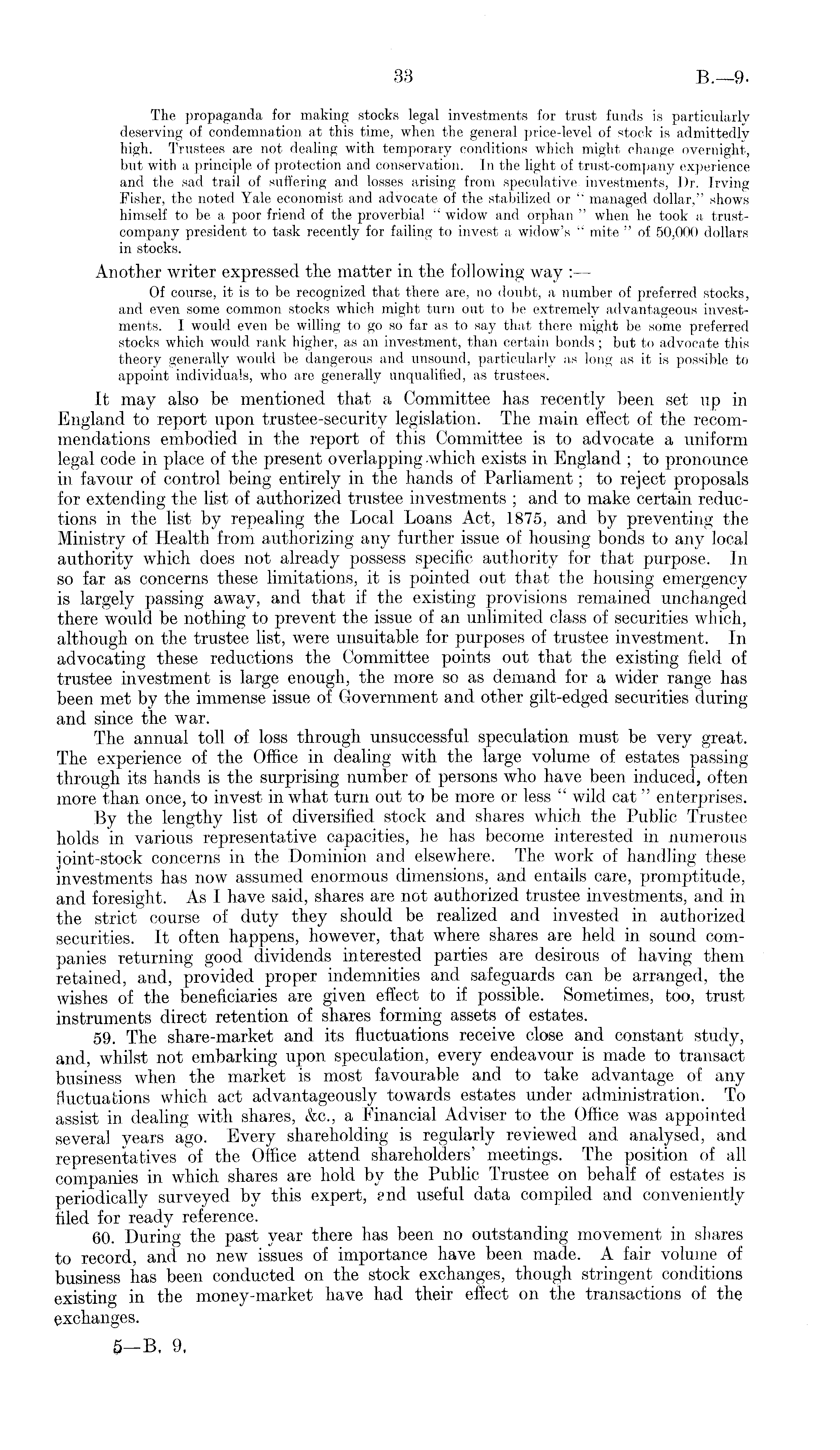 The propaganda for making stocks legal investments for trust funds is particularly deserving of condemnation at this time, when the general price-level of stock is admittedly high. Trustees are not dealing with temporary conditions which might change overnight, but with a principle of protection and conservation. In the light of trust-company experience and the sad trail of suffering and losses arising from speculative investments, Dr. Irving Fisher, the noted Yale economist and advocate of the stabilized or " managed dollar," shows himself to be a poor friend of the proverbial " widow and orphan " when he took a trustcompany president to task recently for failing to invest a widow's " mite " of 50,000 dollars in stocks. Another writer expressed the matter in the following way :— Of course, it is to be recognized that there are, no doubt, a number of preferred stocks, and even some common stocks which might turn out to be extremely advantageous investments. I would even be willing to go so far as to say that there might be some preferred stocks which would rank higher, as an investment, than certain bonds; but to advocate this theory generally would be dangerous and unsound, particularly as long as it is possible to appoint individuals, who are generally unqualified, as trustees. It may also be mentioned that a Committee has recently been set up in England to report upon trustee-security legislation. The main effect of the recommendations embodied in the report of this Committee is to advocate a uniform legal code in place of the present overlapping -which exists in England ; to pronounce in favour of control being entirely in the hands of Parliament; to reject proposals for extending the list of authorized trustee investments ; and to make certain reductions in the list by repealing the Local Loans Act, 1875, and by preventing the Ministry of Health from authorizing any further issue of housing bonds to any local authority which does not already possess specific authority for that purpose. In so far as concerns these limitations, it is pointed out that the housing emergency is largely passing away, and that if the existing provisions remained unchanged there would be nothing to prevent the issue of an unlimited class of securities which, although on the trustee list, were unsuitable for purposes of trustee investment. In advocating these reductions the Committee points out that the existing field of trustee investment is large enough, the more so as demand for a wider range has been met by the immense issue of Government and other gilt-edged securities during and since the war. The annual toll of loss through unsuccessful speculation must be very great. The experience of the Office in dealing with the large volume of estates passingthrough its hands is the surprising number of persons who have been induced, often more than once, to invest in what turn out to be more or less " wild cat " enterprises. By the lengthy list of diversified stock and shares which the Public Trustee holds in various representative capacities, he has become interested in numerous ioint-stock concerns in the Dominion and elsewhere. The work of handling these investments has now assumed enormous dimensions, and entails care, promptitude, and foresight. As I have said, shares are not authorized trustee investments, and in the strict course of duty they should be realized and invested in authorized securities. It often happens, however, that where shares are held in sound companies returning good dividends interested parties are desirous of having them retained, and, provided proper indemnities and safeguards can be arranged, the wishes of the beneficiaries are given effect to if possible. Sometimes, too, trust instruments direct retention of shares forming assets of estates. 59. The share-market and its fluctuations receive close and constant study, and, whilst not embarking upon speculation, every endeavour is made to transact business when the market is most favourable and to take advantage of any fluctuations which act advantageously towards estates under administration. To assist in dealing with shares, &c., a Financial Adviser to the Office was appointed several vears ago. Every shareholding is regularly reviewed and analysed, and representatives of the Office attend shareholders' meetings. The position of all companies in which shares are hold by the Public Trustee on behalf of estates is periodically surveyed by this expert, ?nd useful data compiled and conveniently filed for ready reference. 60. During the past year there has been no outstanding movement in shares to record, and no new issues of importance have been made. A fair volume of business has been conducted on the stock exchanges, though stringent conditions existing in the money-market have had their effect on the transactions of the exchanges.