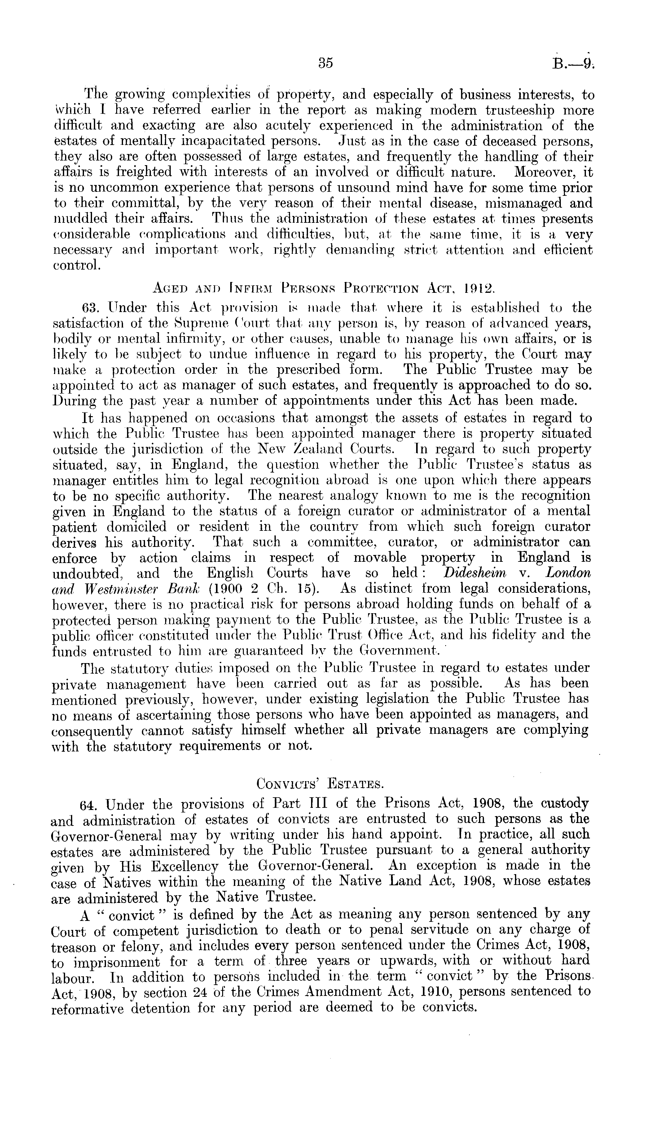 The growing complexities of property, and especially of business interests, to which I have referred earlier in the report as making modern trusteeship more difficult and exacting are also acutely experienced in the administration of the estates of mentally incapacitated persons. Just as in the case of deceased persons, they also are often possessed of large estates, and frequently the handling of their affairs is freighted with interests of an involved or difficult nature. Moreover, it is no uncommon experience that persons of unsound mind have for some time prior to their committal, by the very reason of their mental disease, mismanaged and muddled their affairs. Thus the administration of these estates at times presents considerable complications and difficulties, but, at the same time, it is a very necessary and important work, rightly demanding strict attention and efficient control. Aged and Infirm Persons Protection Act, 1912. 63. Under this Act provision is made that where it is established to the satisfaction of the Supreme Court that any person is, by reason of advanced years, bodily or mental infirmity, or other causes, unable to manage his own affairs, or is likely to be subject to undue influence in regard to his property, the Court may make a protection order in the prescribed form. The Public Trustee may be appointed to act as manager of such estates, and frequently is approached to do so. During the past year a number of appointments under this Act has been made. It has happened on occasions that amongst the assets of estates in regard to which the Public Trustee has been appointed manager there is property situated outside the jurisdiction of the New Zealand Courts. In regard to such property situated, say, in England, the question whether the Public Trustee's status as manager entitles him to legal recognition abroad is one upon which there appears to be no specific authority. The nearest analogy known to me is the recognition given in England to the status of a foreign curator or administrator of a mental patient domiciled or resident in the country from which such foreign curator derives his authority. That such a committee, curator, or administrator can enforce by action claims in respect of movable property in England is undoubted, and the English Courts have so held: Didesheim v. London and Westminster Bank (1900 2 Ch. 15). As distinct from legal considerations, however, there is no practical risk for persons abroad holding funds on behalf of a protected person making payment to the Public Trustee, as the Public Trustee is a public officer constituted under the Public Trust Office Act, and his fidelity and the funds entrusted to him are guaranteed by the Government. The statutory duties imposed on the Public Trustee in regard to estates under private management have been carried out as far as possible. As has been mentioned previously, however, under existing legislation the Public Trustee has no means of ascertaining those persons who have been appointed as managers, and consequently cannot satisfy himself whether all private managers are complying with the statutory requirements or not. Convicts' Estates. 64. Under the provisions of Part 111 of the Prisons Act, 1908, the custody and administration of estates of convicts are entrusted to such persons as the Governor-General may by writing under his hand appoint. In practice, all such estates are administered by the Public Trustee pursuant to a general authority oiven by His Excellency the Governor-General. An exception is made in the case of Natives within the meaning of the Native Land Act, 1908, whose estates are administered by the Native Trustee. A " convict" is defined by the Act as meaning any person sentenced by any Court of competent jurisdiction to death or to penal servitude on any charge of treason or felony, and includes every person sentenced under the Crimes Act, 1908, to imprisonment for a term of three years or upwards, with or without hard labour. In addition to persons included in the term " convict " by the Prisons Act, 1908, by section 24 Of the Crimes Amendment Act, 1910, persons sentenced to reformative detention for any period are deemed to be convicts.