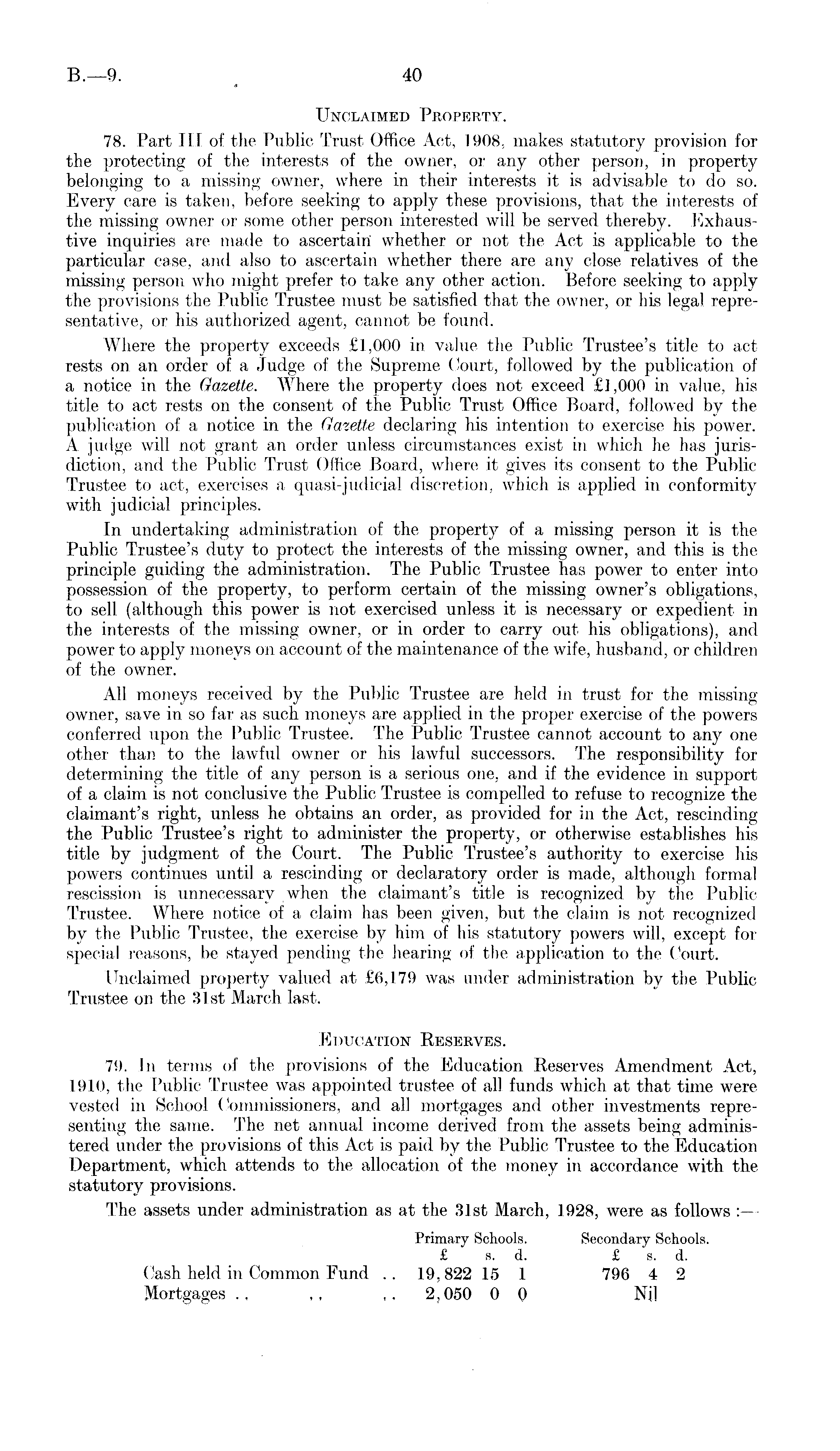 Unclaimed Property. 78. Part TIF of the Public Trust Office Act, 1908. makes statutory provision for the protecting of the interests of the owner, or any other person, in property belonging to a missing owner, where in their interests it is advisable to do so. Every care is taken, before seeking to apply these provisions, that the interests of the missing owner or some other person interested will be served thereby. Exhaustive inquiries are made to ascertain whether or not the Act is applicable to the particular case, and also to ascertain whether there are any close relatives of the missing person who might prefer to take any other action. Before seeking to apply the provisions the Public Trustee must be satisfied that the owner, or his legal representative, or his authorized agent, cannot be found. Where the property exceeds £1,000 in value the Public Trustee's title to act rests on an order of a Judge of the Supreme Court, followed by the publication of a notice in the Gazette. Where the property does not exceed £1,000 in value, his title to act rests on the consent of the Public Trust Office Board, followed by the publication of a notice in the Gazette declaring his intention to exercise his power. A judge will not grant an order unless circumstances exist in which he has jurisdiction, and the Public Trust Office Board, where it gives its consent to the Public Trustee to act, exercises a quasi-judicial discretion, which is applied in conformity with judicial principles. In undertaking administration of the property of a missing person it is the Public Trustee's duty to protect the interests of the missing owner, and this is the principle guiding the administration. The Public Trustee has power to enter into possession of the property, to perform certain of the missing owner's obligations, to sell (although this power is not exercised unless it is necessary or expedient in the interests of the missing owner, or in order to carry out his obligations), and power to apply moneys on account of the maintenance of the wife, husband, or children of the owner. All moneys received by the Public Trustee are held in trust for the missing owner, save in so far as such moneys are applied in the proper exercise of the powers conferred upon the Public Trustee. The Public Trustee cannot account to any one other than to the lawful owner or his lawful successors. The responsibility for determining the title of any person is a serious one, and if the evidence in support of a claim is not conclusive the Public Trustee is compelled to refuse to recognize the claimant's right, unless he obtains an order, as provided for in the Act, rescinding the Public Trustee's right to administer the property, or otherwise establishes his title by judgment of the Court. The Public Trustee's authority to exercise his powers continues until a rescinding or declaratory order is made, although formal rescission is unnecessary when the claimant's title is recognized by the Public Trustee. Where notice of a claim has been given, but the claim is riot recognized by the Public Trustee, the exercise by him of his statutory powers will, except for special reasons, be stayed pending the hearing of the application to the Court. Unclaimed property valued at £6,179 was under administration by the Public Trustee on the 31st March last. Education Reserves. 79. In terms of the provisions of the Education Reserves Amendment Act, 1910, the Public Trustee was appointed trustee of all funds which at that time were vested in School Commissioners, and all mortgages and other investments representing the same. The net annual income derived from the assets being administered under the provisions of this Act is paid by the Public Trustee to the Education Department, which attends to the allocation of the money in accordance with the statutory provisions. The assets under administration as at the 31st March, 1928, were as follows Primary Schools. Secondary Schools. £ s. d. £ s. d. Cash held in Common Fund .. 19,822 15 1 796 4 2 Mortgages ~ ~ 2,050 0 0 Nil
