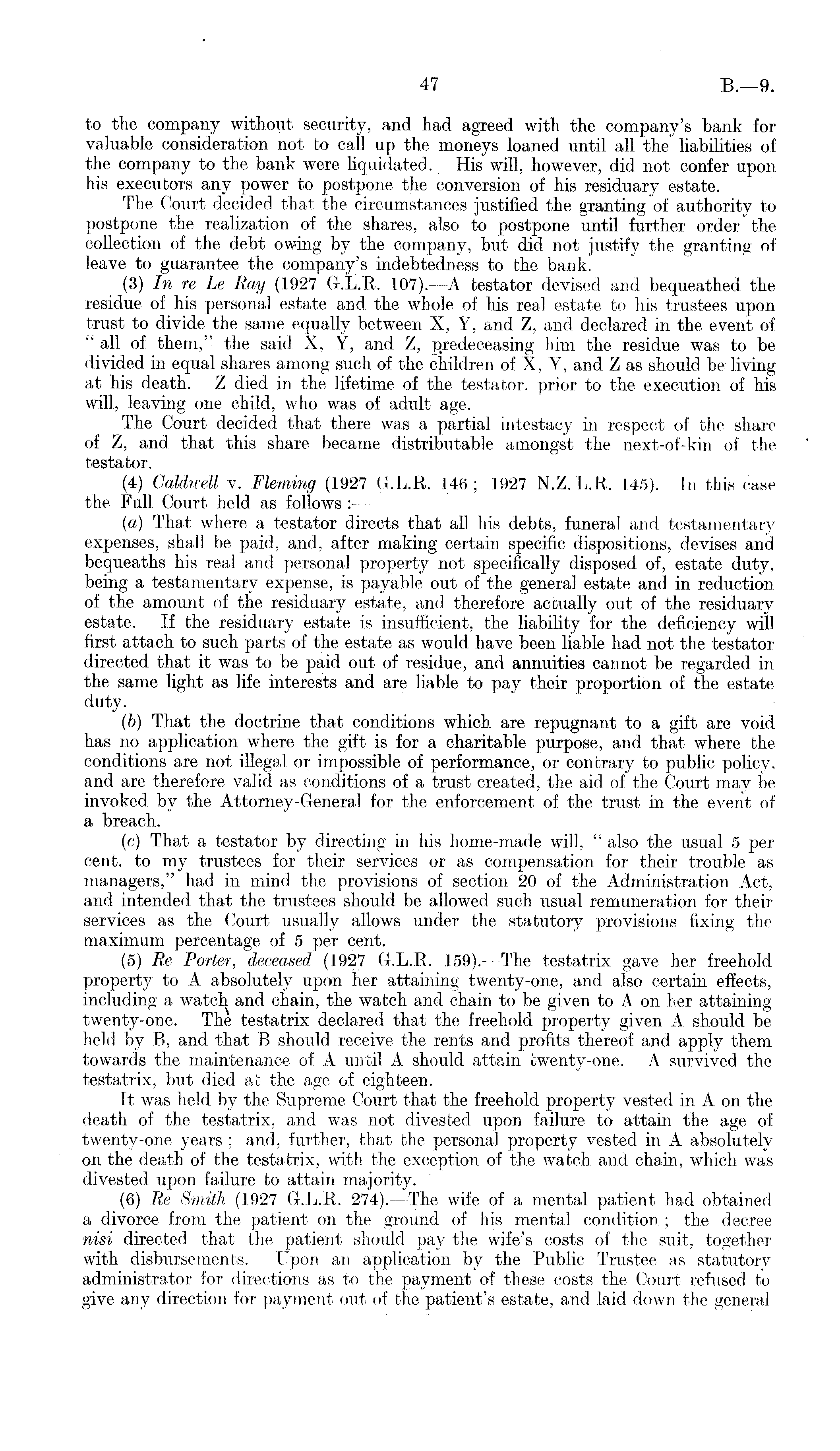to the company without security, and had agreed with the company's bank for valuable consideration not to call up the moneys loaned until all liabilities of the company to the bank were liquidated. His will, however, did not confer upon his executors any power to postpone the conversion of his residuary estate. The Court decided that the circumstances justified the granting of authoritv to postpone the realization of the shares, also to postpone until further order the collection of the debt owing by the company, but did not justify the granting of leave to guarantee the company's indebtedness to the bank. (3) In re Le Ray (1927 G.L.R. 107). —A testator devised and bequeathed the residue of his personal estate and the whole of his real estate to his trustees upon trust to divide the same equally between X, Y, and Z, and declared in the event of " all of them," the said X, Y, and Z, predeceasing him the residue was to be divided in equal shares among such of the children of X, Y, and Z as should be living at his death. Z died in the lifetime of the testator, prior to the execution of his will, leaving one child, who was of adult age. The Court decided that there was a partial intestacy in respect of the share of Z, and that this share became distributable amongst the next-of-kin of the testator. (4) Caldwell v. Fleming (1927 G.L.R. 146; 1927 N.Z. L.R. 145). In this case the Full Court held as follows : (a) That where a testator directs that all his debts, funeral and testamentary expenses, shall be paid, and, after making certain specific dispositions, devises and bequeaths his real and personal property not specifically disposed of, estate duty, being a testamentary expense, is payable out of the general estate and in reduction of the amount of the residuary estate, and therefore actually out of the residuary estate. If the residuary estate is insufficient, the liability for the deficiency will first attach to such parts of the estate as would have been liable had not the testator directed that it was to be paid out of residue, and annuities cannot be regarded in the same light as life interests and are liable to pay their proportion of the estate duty. (b) That the doctrine that conditions which are repugnant to a gift are void has no application where the gift is for a charitable purpose, and that where the conditions are not illegal or impossible of performance, or contrary to public policy, and are therefore valid as conditions of a trust created, the aid of the Court may be invoked by the Attorney-General for the enforcement of the trust in the event of a breach. (c) That a testator by directing in his home-made will, " also the usual 5 per cent, to my trustees for their services or as compensation for their trouble as managers," had in mind the provisions of section 20 of the Administration Act, and intended that the trustees should be allowed such usual remuneration for their services as the Court usually allows under the statutory provisions fixing the maximum percentage of 5 per cent. (5) Re Porter, deceased (1927 G.L.R. 159).- The testatrix gave her freehold property to A absolutely upon her attaining twenty-one, and also certain effects, including a watch and chain, the watch and chain to be given to A on her attaining twenty-one. The testatrix declared that the freehold property given A should be held by .B, and that B should receive the rents and profits thereof and apply them towards the maintenance of A until A should attain twenty-one. A survived the testatrix, but died at the age of eighteen. It was held by the Supreme Court that the freehold property vested in A on the death of the testatrix, and was not divested upon failure to attain the age of twenty-one years ; and, further, that the personal property vested in A absolutely on the death of the testatrix, with the exception of the watch and chain, which was divested upon failure to attain majority. (6) Re Smith (1927 G.L.R. 274). The wife of a mental patient had obtained a divorce from the patient on the ground of his mental condition ; the decree nisi directed that the patient should pay the wife's costs of the suit, together with disbursements. Upon an application by the Public Trustee as statutory administrator for directions as to the payment of these costs the Court refused to give any direction for payment out of the patient's estate, and laid down the general