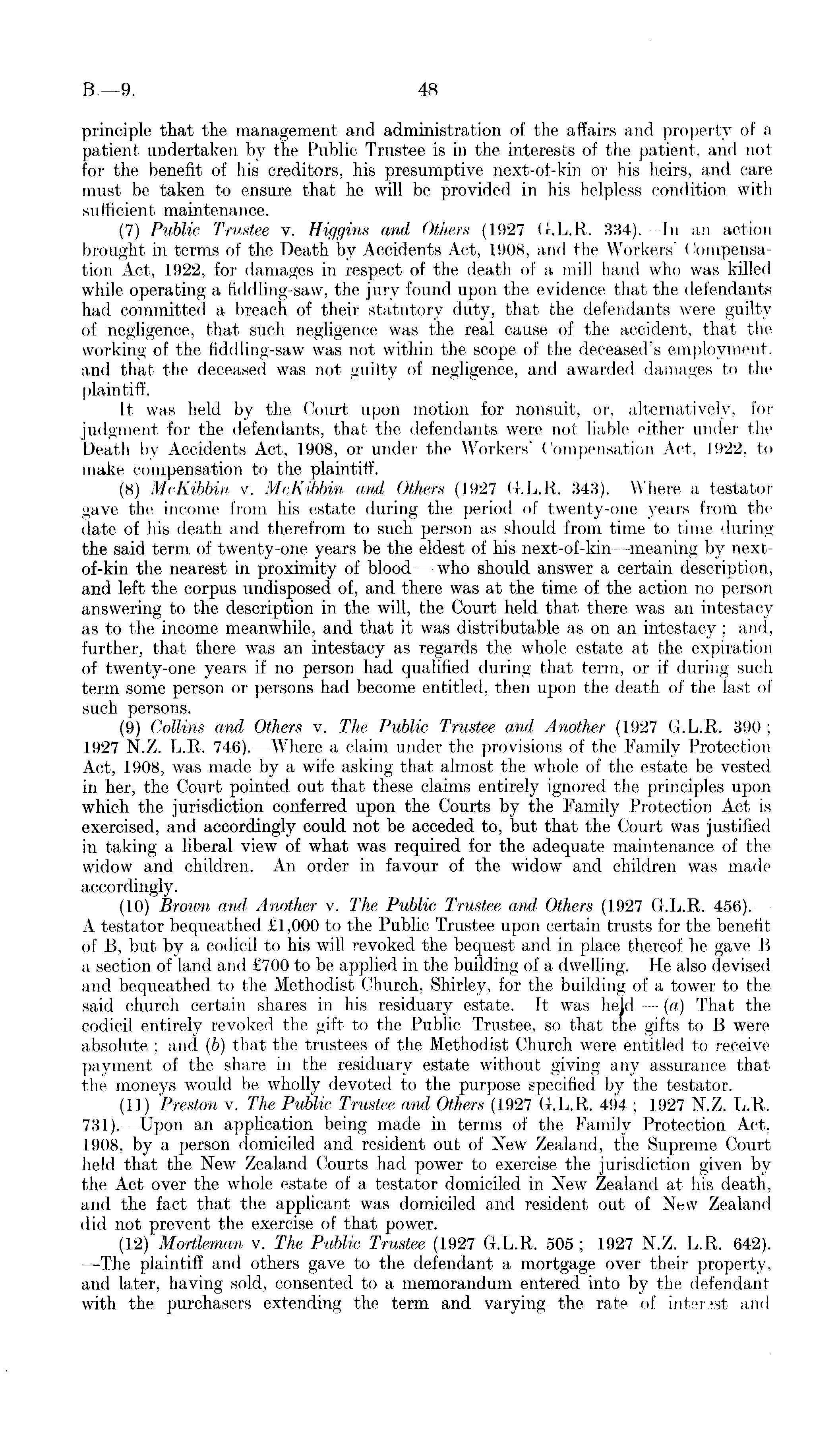 principle that the management and administration of the affairs and property of a patient undertaken by the Public Trustee is in the interests of the patient, and not for the benefit of his creditors, his presumptive next-of-kin or his heirs, and care must be taken to ensure that he will be provided in his helpless condition with sufficient maintenance. (7) Public Trustee v. Higgins and Others (1927 G.L.R. 334). Tn an action brought in terms of the Death by Accidents Act, 1908, and the Workers' Compensation Act, 1922, for damages in respect of the death of a mill hand who was killed while operating a fiddling-saw, the jury found upon the evidence that the defendants had committed a breach of their statutory duty, that the defendants were guilty of negligence, that such negligence was the real cause of the accident, that the working of the fiddling-saw was not within the scope of the deceased's employment, and that the deceased was not guilty of negligence, and awarded damages to the plaintiff. It was held by the Court upon motion for nonsuit, or, alternatively, for judgment for the defendants, that the defendants were not liable either under the Death by Accidents Act, 1908, or under the Workers' Compensation Act, 1922, to make compensation to the plaintiff. (8) McKibbin v. McKibbin and Others (1927 G.L.R. 343). Where a testator gave the income from his estate during the period of twenty-one years from the elate of his death and therefrom to such person as should from time to time during the said term of twenty-one years be the eldest of his next-of-kin -meaning by next-of-kin the nearest in proximity of blood — who should answer a certain description, and left the corpus undisposed of, and there was at the time of the action no person answering to the description in the will, the Court held that there was an intestacy as to the income meanwhile, and that it was distributable as on an intestacy ; and, further, that there was an intestacy as regards the whole estate at the expiration of twenty-one years if no person had qualified during that term, or if during such term some person or persons had become entitled, then upon the death of the last of such persons. (9) Collins and Others v. The Public Trustee and Another (1927 G.L.R. 390 ; 1927 N.Z. L.R. 746). —Where a claim under the provisions of the Family Protection Act, 1908, was made by a wife asking that almost the whole of the estate be vested in her, the Court pointed out that these claims entirely ignored the principles upon which the jurisdiction conferred upon the Courts by the Family Protection Act is exercised, and accordingly could not be acceded to, but that the Court was justified in taking a liberal view of what was required for the adequate maintenance of the widow and children. An order in favour of the widow and children was made accordingly. (10) Broivn and Another v. The Public Trustee and Others (1927 G.L.R. 456). A testator bequeathed £1,000 to the Public Trustee upon certain trusts for the benefit of B, but by a codicil to his will revoked the bequest and in place thereof he gave B a section of land and £700 to be applied in the building of a dwelling. He also devised and bequeathed to the Methodist Church, Shirley, for the building of a toWer to the said church certain shares in his residuary estate. Ft was held - (a) That the codicil entirely revoked the gift to the Public Trustee, so that the gifts to B were absolute ; and (b) that the trustees of the Methodist Church were entitled to receive payment of the share in the residuary estate without giving any assurance that the moneys would be wholly devoted to the purpose specified by the testator. (11) Preston v. The Public Trustee and Others (1927 G.L.R. 494 ; 1927 N.Z. L.R. 731). —Upon an application being made in terms of the Family Protection Act, 1908, by a person domiciled and resident out of New Zealand, the Supreme Court held that the New Zealand Courts had power to exercise the jurisdiction given by the Act over the whole estate of a testator domiciled in New Zealand at his death, and the fact that the applicant was domiciled and resident out of New Zealand did not prevent the exercise of that power. (12) Mortleman v. The Public Trustee (1927 G.L.R. 505; 1927 N.Z. L.R. 642). —The plaintiff and others gave to the defendant a mortgage over their property, and later, having sold, consented to a memorandum entered into by the defendant with the purchasers extending the term and varying the rate of interest and