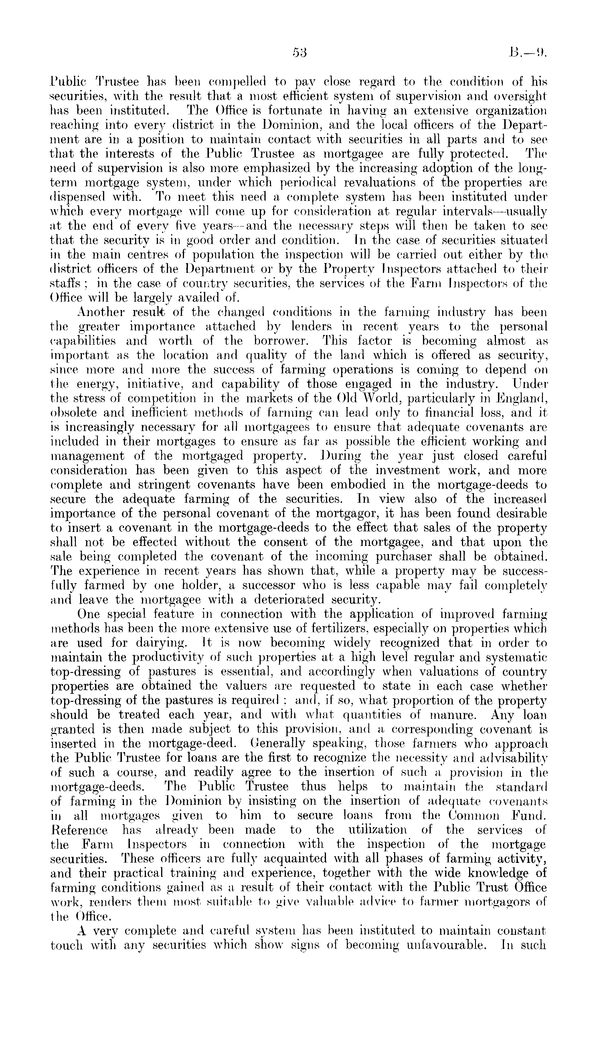 Public Trustee lias been compelled to pay close regard to the condition of his securities, with the result that a most efficient system of supervision and oversight has been instituted. The Office is fortunate in having an extensive organization reaching into even' district in the Dominion, and the local officers of the Department are in a position to maintain contact with securities in all parts and to see that the interests of the Public Trustee as mortgagee are fully protected. The need of supervision is also more emphasized by the increasing adoption of the longterm mortgage system, under which periodical revaluations of the properties are dispensed with. To meet this need a complete system has been instituted under which every mortgage will come up for consideration at regular intervals—usually at the end of every five years —and the necessary steps will then be taken to see that the security is in good order and condition. In the case of securities situated in the main centres of population the inspection will be carried out either by the district officers of the Department or by the Property Inspectors attached to their staffs ; in the case of country securities, the services of the Farm Inspectors of the Office will be largely availed of. Another result of the changed conditions in the farming industry has been the greater importance attached by lenders in recent years to the personal capabilities and worth of the borrower. This factor is becoming almost as important as the location and quality of the land which is offered as security., since more and more the success of farming operations is coming to depend on the energy, initiative, and capability of those engaged in the industry. Under the stress of competition in the markets of the Old World, particularly in England, obsolete and inefficient methods of farming can lead only to financial loss, and it is increasingly necessary for all mortgagees to ensure that adequate covenants are included in their mortgages to ensure as far as possible the efficient working and management of the mortgaged property. During the year just closed careful consideration has been given to this aspect of the investment work, and more complete and stringent covenants have been embodied in the mortgage-deeds to secure the adequate farming of the securities. In view also of the increased importance of the personal covenant of the mortgagor, it has been found desirable to insert a covenant in the mortgage-deeds to the effect that sales of the property shall not be effected without the consent of the mortgagee, and that upon the sale being completed the covenant of the incoming purchaser shall be obtained. The experience in recent years has shown that, while a property may be successfully farmed by one holder, a successor who is less capable may fail completely and leave the mortgagee with a deteriorated security. One special feature in connection with the application of improved farming methods has been the more extensive use of fertilizers, especially on properties which are used for dairying. It is now becoming widely recognized that in order to maintain the productivity of such properties at a high level regular and systematic top-dressing of pastures is essential, and accordingly when valuations of country properties are obtained the valuers are requested to state in each case whether top-dressing of the pastures is required ; and, if so, what proportion of the property should be treated each year, and with what quantities of manure. Any loan granted is then made subject to this provision, and a corresponding covenant is inserted in the mortgage-deed. Generally speaking, those farmers who approach the Public Trustee for loans are the first to recognize the necessity and advisability of such a course, and readily agree to the insertion of such a provision in the mortgage-deeds. The Public Trustee thus helps to maintain the standard of farming in the Dominion by insisting on the insertion of adequate covenants in all mortgages given to him to secure loans from the Common Fund. Reference has already been made to the utilization of the services of the Farm Inspectors in connection with the inspection of the mortgage securities. These officers are fully acquainted with all phases of farming activity, and their practical training and experience, together with the wide knowledge of farming conditions gained as a result of their contact with the Public Trust Office work, renders them most suitable to give valuable advice to farmer mortgagors of the Office. A very complete and careful system has been instituted to maintain constant touch with any securities which show signs of becoming unfavourable. In such