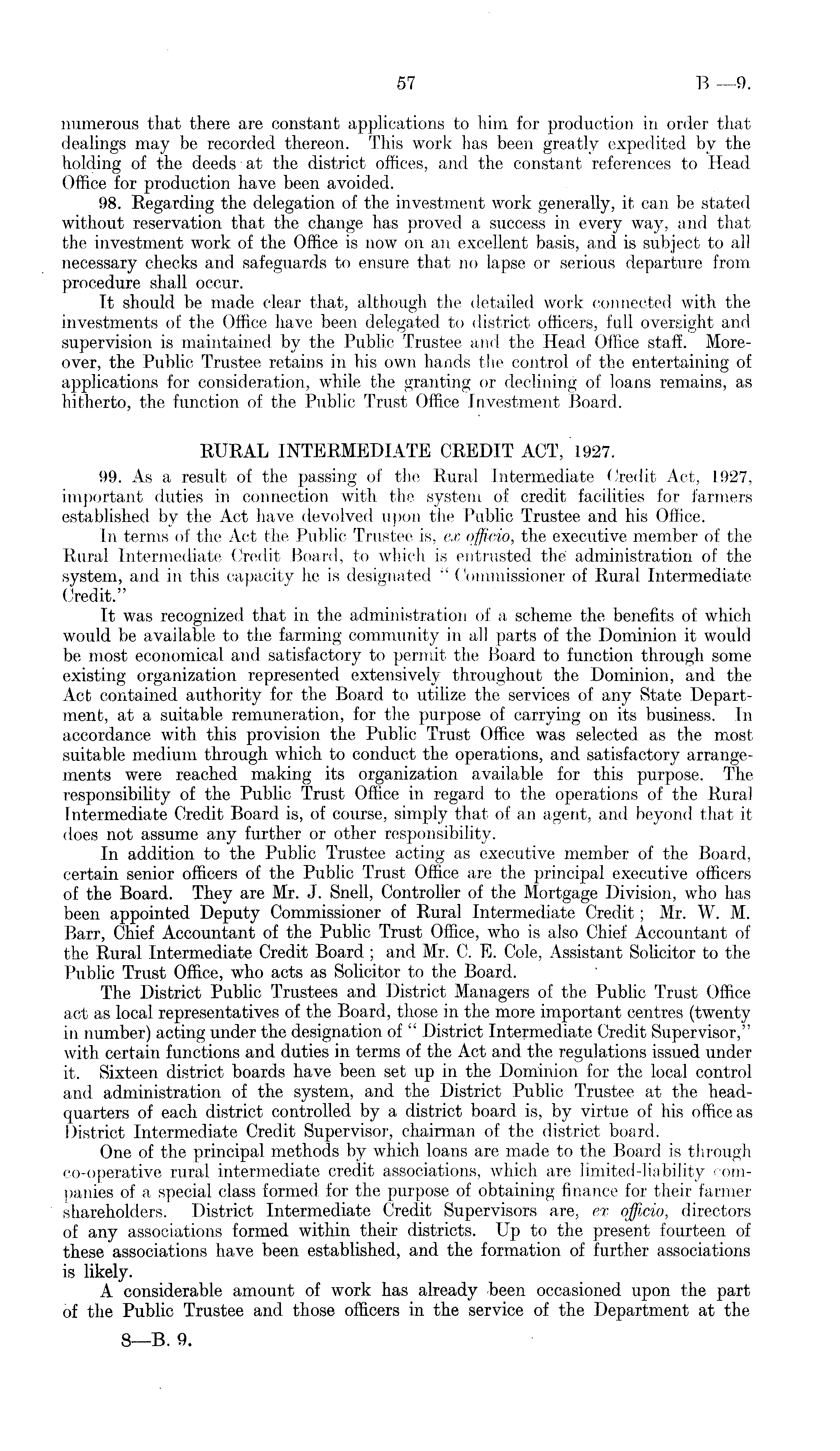 numerous that there are constant applications to him for production in order that dealings may be recorded thereon. This work has been greatly expedited by the holding of the deeds at the district offices, and the constant references to Head Office for production have been avoided. 98. Regarding the delegation of the investment work generally, it can be stated without reservation that the change has proved a success in every way, and that the investment work of the Office is now on an excellent basis, and is subject to all necessary checks and safeguards to ensure that no lapse or serious departure from procedure shall occur. It should be made clear that, although the detailed work connected with the investments of the Office have been delegated to district officers, full oversight and supervision is maintained by the Public Trustee and the Head Office staff. Moreover, the Public Trustee retains in his own hands the control of the entertaining of applications for consideration, while the granting or declining of loans remains, as hitherto, the function of the Public Trust Office Investment Board. RURAL INTERMEDIATE CREDIT ACT, 1927. 99. As a result of the passing of the Rural Intermediate Credit Act, 1927, important duties in connection with the system of credit facilities for farmers established by the Act have devolved upon the Public Trustee and his Office. In terms of the Act the Public Trustee is, ex officio, the executive member of the Rural Intermediate Credit Board, to which is entrusted the administration of the system, and in this capacity he is designated " Commissioner of Rural Intermediate Credit." It was recognized that in the administration of a scheme the benefits of which would be available to the farming community in all parts of the Dominion it would be most economical and satisfactory to permit the Board to function through some existing organization represented extensively throughout the Dominion, and the Act contained authority for the Board to utilize the services of any State Department, at a suitable remuneration, for the purpose of carrying on its business. In accordance with this provision the Public Trust Office was selected as the most suitable medium through which to conduct the operations, and satisfactory arrangements were reached making its organization available for this purpose. The responsibility of the Public Trust Office in regard to the operations of the Rural Intermediate Credit Board is, of course, simply that of an agent, and beyond that it does not assume any further or other responsibility. In addition to the Public Trustee acting as executive member of the Board, certain senior officers of the Public Trust Office are the principal executive officers of the Board. They are Mr. J. Snell, Controller of the Mortgage Division, who has been appointed Deputy Commissioner of Rural Intermediate Credit; Mr. W. M. Barr, Chief Accountant of the Public Trust Office, who is also Chief Accountant of the Rural Intermediate Credit Board ; and Mr. C. E. Cole, Assistant Solicitor to the Public Trust Office, who acts as Solicitor to the Board. The District Public Trustees and District Managers of the Public Trust Office act as local representatives of the Board, those in the more important centres (twenty in number) acting under the designation of " District Intermediate Credit Supervisor," with certain functions and duties in terms of the Act and the regulations issued under it. Sixteen district boards have been set up in the Dominion for the local control and administration of the system, and the District Public Trustee at the headquarters of each district controlled by a district board is, by virtue of his office as District Intermediate Credit Supervisor, chairman of the district board. One of the principal methods by which loans are made to the Board is through co-operative rural intermediate credit associations, which are limited-liability companies of a special class formed for the purpose of obtaining finance for their farmer shareholders. District Intermediate Credit Supervisors are, ex officio, directors of any associations formed within their districts. Up to the present fourteen of these associations have been established, and the formation of further associations is likely. A considerable amount of work has already been occasioned upon the part of the Public Trustee and those officers in the service of the Department at the