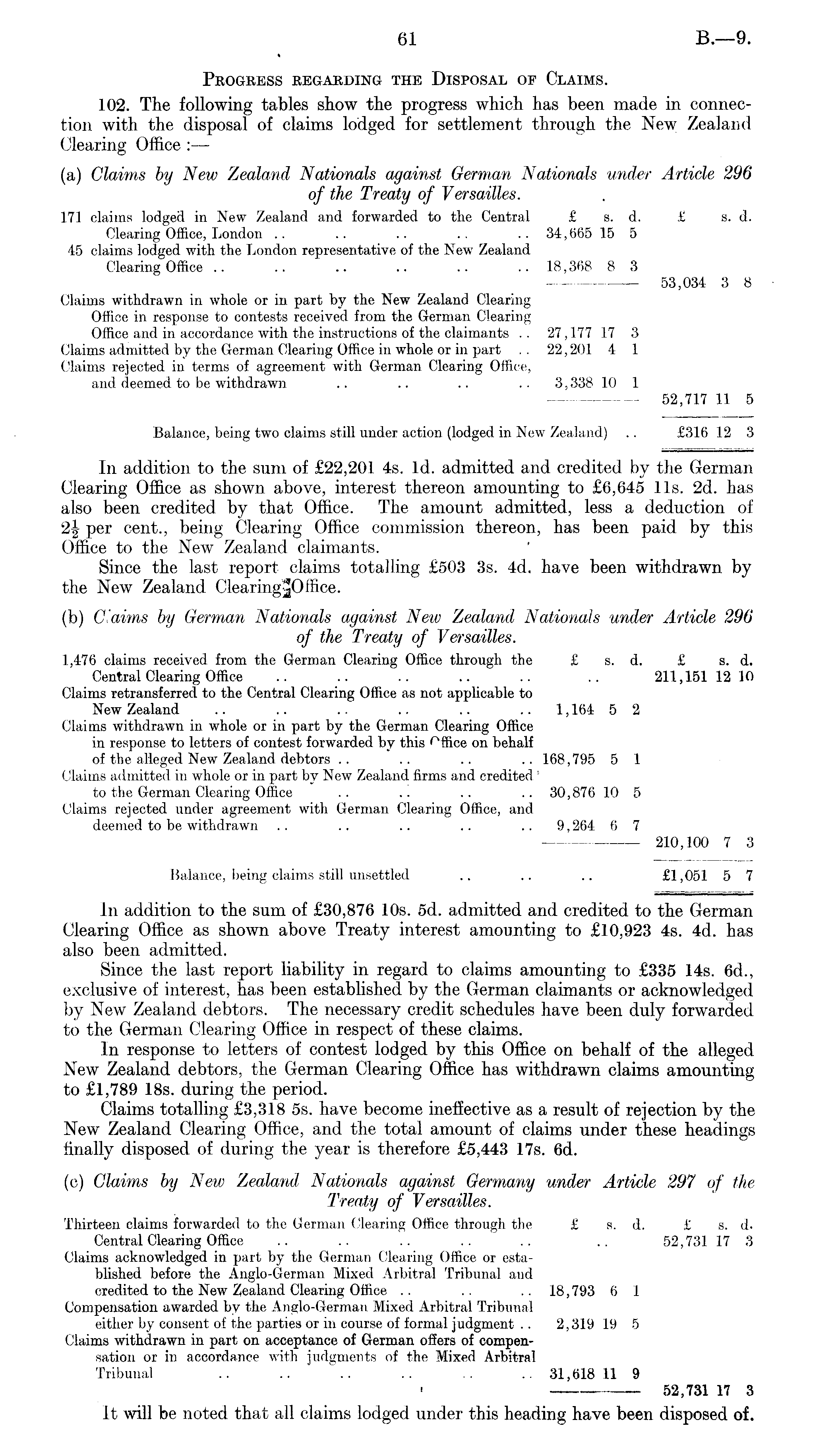 Progress regarding the Disposal of Claims. 102. The following tables show the progress which has been made in connection with the disposal of claims lodged for settlement through the New Zealand Clearing Office : — (a) Claims by New Zealand Nationals against German Nationals under Article 296 of the Treaty of Versailles. 171 claims lodged in New Zealand and forwarded to the Central £ s. d. £ s. d. Clearing Office, London .. .. .. .. .. 34,665 15 5 45 claims lodged with the London representative of the New Zealand Clearing Office .. .. .. .. .. .. 18,368 8 3 53,034 3 8 Claims withdrawn in whole or in part by the New Zealand Clearing Office in response to contests received from the German Clearing Office and in accordance with the instructions of the claimants .. 27,177 17 3 Claims admitted by the German Clearing Office in whole or in part .. 22,201 4 1 Claims rejected in terms of agreement with German Clearing Office, and deemed to be withdrawn .. .. .. .. 3,338 10 1 - 52,717 11 5 Balance, being two claims still under action (lodged in New Zealand) .. £316 12 3 In addition to the sum of £22,201 4s. Id. admitted and credited by the German Clearing Office as shown above, interest thereon amounting to £6,645 lis. 2d. has also been credited by that Office. The amount admitted, less a deduction of 2|- per cent., being Clearing Office commission thereon, has been paid by this Office to the New Zealand claimants. Since the last report claims totalling £503 3s. 4d. have been withdrawn by the New Zealand Clearing^Office. (b) Claims by German Nationals against New Zealand Nationals under Article 296 of the Treaty of Versailles. 1,476 claims received from the German Clearing Office through the £ s. d. £ s. d. Central Clearing Office .. .. .. .. .. .. 211,151 12 10 Claims retransferred to the Central Clearing Office as not applicable to New Zealand .. .. .. .. .. 1,164 5 2 Claims withdrawn in whole or in part by the German Clearing Office in response to letters of contest forwarded by this Office on behalf of the alleged New Zealand debtors .. .. .. .. 168,795 5 1 Claims admitted in whole or in part by New Zealand firms and credited to the German Clearing Office .. .. .. .. 30,876 10 5 Claims rejected under agreement with German Clearing Office, and deemed to be withdrawn .. .. .. .. .. 9,264 6 7 210,100 7 3 Balance, being claims still unsettled .. .. .. £1,051 5 7 In addition to the sum of £30,876 10s. sd. admitted and credited to the German Clearing Office as shown above Treaty interest amounting to £10,923 4s. 4d. has also been admitted. Since the last report liability in regard to claims amounting to £335 14s. 6d., exclusive of interest, has been established by the German claimants or acknowledged by New Zealand debtors. The necessary credit schedules have been duly forwarded to the German Clearing Office in respect of these claims. In response to letters of contest lodged by this Office on behalf of the alleged New Zealand debtors, the German Clearing Office has withdrawn claims amounting to £1,789 18s. during the period. Claims totalling £3,318 ss. have become ineffective as a result of rejection by the New Zealand Clearing Office, and the total amount of claims under these headings finally disposed of during the year is therefore £5,443 17s. 6d. (c) Claims by New Zealand Nationals against Germany under Article 297 of the Treaty of Versailles. Thirteen claims forwarded to the German Clearing Office through the £ s. d. £ s. d. Central Clearing Office .. .. .. .. .. .. 52,731 17 3 Claims acknowledged in part by the German Clearing Office or established before the Anglo-German Mixed Arbitral Tribunal and credited to the New Zealand Clearing Office .. .. .. 18,793 6 1 Compensation awarded by the Anglo-German Mixed Arbitral Tribunal either by consent of the parties or in course of formal judgment .. 2,319 19 5 Claims withdrawn in part on acceptance of German offers of compensation or in accordance with judgments of the Mixed Arbitral Tribunal .. .. .. . . .. 31,618 11 9 52,731 17 3 It will be noted that all claims lodged under this heading have been disposed of.