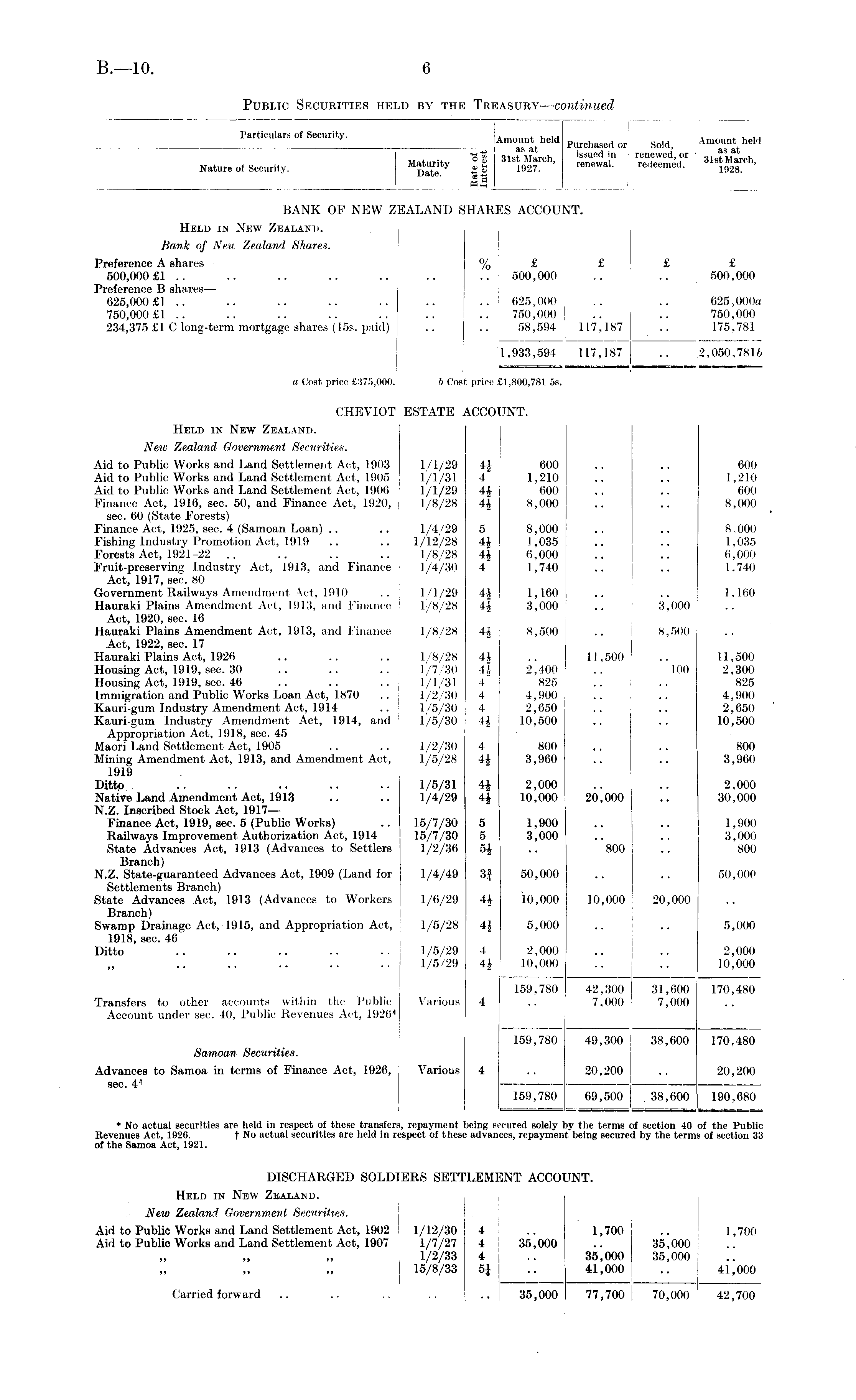 _J. Part.ou.arao, Security. I | Amount he.i o® qi«t iramh issued in renewed, or i a-JKJJ*. Nature ot Security. I || m? ' ™™' re ' leemed - I "UK"* 1 I I && BANK OF NEW ZEALAND SHARES ACCOUNT. Held in New Zealand. Bank of New Zealand Shares. Preference A shares— ! % £ £ £ £ 500,000 £1 .. .. .. .. .. | .. .. 500,000 .. .. 500,000 Preference B shares— 625,000 £1 .. .. .. .. .. .. .. 625,000! .. .. 625,000a 750,000 £1 .. .. .. .. .. .. .. 750,000 j .. .. 750,000 234,375 £1 C long-term mortgage shares (15s. paid) .. .. 58,594 j 117,187 .. 175,781 , : 1 1,933,594 117,187 .. ! 2,050,7816 1 . a Cost price £375,000. b Cost price £1,800,781 5s. CHEVIOT ESTATE ACCOUNT. Held in New Zealand. New Zealand Government Securities. Aid to Public Works and Land Settlement Act, 1903 1/1/29 4J 600 .. .. 600 Aid to Public Works and Land Settlement Act, 1905 1/1/31 4 1,210 .. .. 1,210 Aid to Public Works and Land Settlement Act, 1906 1/1/29 4£ 600 .. .. 600 Finance Act, 1916, sec. 50, and Finance Act, 1920, 1/8/28 4£ 8,000 .. .. 8,000 sec. 60 (State Forests) Finance Act, 1925, sec. 4 (Samoan Loan) .. .. 1/4/29 5 8,000 .. .. 8,000 Fishing Industry Promotion Act, 1919 .. .. 1/12/28 4J 1,035 .. .. 1,035 Forests Act, 1921-22 .. .. .. .. 1/8/28 4J 6,000 .. .. 6,000 Fruit-preserving Industry Act, 1913, and Finance 1/4/30 4 1,740 .. .. 1,740 Act, 1917, sec. 80 Government Railways Amendment Act, 1910 .. 1/1/29 44 1,160 .. .. 1,160 Hauraki Plains Amendment Act, 1913, and Finance 1/8/28 4| 3,000 .. 3,000 Act, 1920, sec. 16 Hauraki Plains Amendment Act, 1913, and Finance 1/8/28 44 8,500 .. 8,500 Act, 1922, sec. 17 Hauraki Plains Act, 1926 .. .. .. 1/8/28 4J .. 11,500 .. 11,500 Housing Act, 1919, sec. 30 .. .. .. 1/7/30 44 2,400 .. 100 2,300 Housing Act, 1919, sec. 46 .. .. .. 1/1/31 4 825 .. .. 825 Immigration and Public Works Loan Act, 1870 .. 1/2/30 4 4,900 .. j .. 4,900 Kauri-gum Industry Amendment Act, 1914 .. 1/5/30 4 2,650 .. .. 2,650 Kauri-gum Industry Amendment Act, 1914, and 1/5/30 44 10,500 .. .. 10,500 Appropriation Act, 1918, sec. 45 Maori Land Settlement Act, 1905 .. .. 1/2/30 4 800 .. .. 800 Mining Amendment Act, 1913, and Amendment Act, 1/5/28 44 3,960 .. .. 3,960 1919 Ditto .. .. .. .. •• 1/5/31 44 2,000 .. .. 2,000 Native Land Amendment Act, 1913 .. .. 1/4/29 44 10,000 20,000 .. 30,000 N.Z. Inscribed Stock Act, 1917— Finance Act, 1919, sec. 5 (Public Works) .. 15/7/30 5 1,900 .. .. 1,900 Railways Improvement Authorization Act, 1914 15/7/30 5 3,000 .. .. 3,000 State Advances Act, 1913 (Advances to Settlers 1/2/36 54 .. 800 .. 800 Branch) N.Z. State-guaranteed Advances Act, 1909 (Land for 1/4/49 3j 50,000 .. .. 50,000 Settlements Branch) State Advances Act, 1913 (Advances to Workers 1/6/29 44 10,000 10,000 20,000 Branch) Swamp Drainage Act, 1915, and Appropriation Act, 1/5/28 44 5,000 .. .. 5,000 1918, sec. 46 Ditto .. .. .. .. .. 1/5/29 4 2,000 .. .. 2,000 1/5/29 44 10,000 .. .. 10,000 159,780 42,300 31,600 170,480 Transfers to other accounts within the Public Various 4 .. 7,000 7,000 Account under sec. 40, Public Revenues Act, 1926" 159,780 49,300 38,600 170,480 Samoan Securities. Advances to Samoa in terms of Finance Act, 1926, Various 4 .. 20,200 .. 20,200 sec. -1 1 — 159,780 69,500 . 38,600 190,680 * No actual securities are held in respect of these transfers, repayment being secured solely by the terms of section 40 of the Public Revenues Act, 1926. t No actual securities are held in respect of these advances, repayment* being secured by the terms of section 33 of the Samoa Act, 1921. DISCHARGED SOLDIERS SETTLEMENT ACCOUNT. Held in New Zealand. New Zealand Government Securities. Aid to Public Works and Land Settlement Act, 1902 1/12/30 4 .. 1,700 .. 1,700 Aid to Public Works and Land Settlement Act, 1907 1/7/27 4 35,000 .. 35,000 1/2/33 4 .. 35,000 35,000 15/8/33 5J .. 41,000 .. 41,000 Carried forward .. .. .. .. .. 35,000 77,700 70,000 42,700