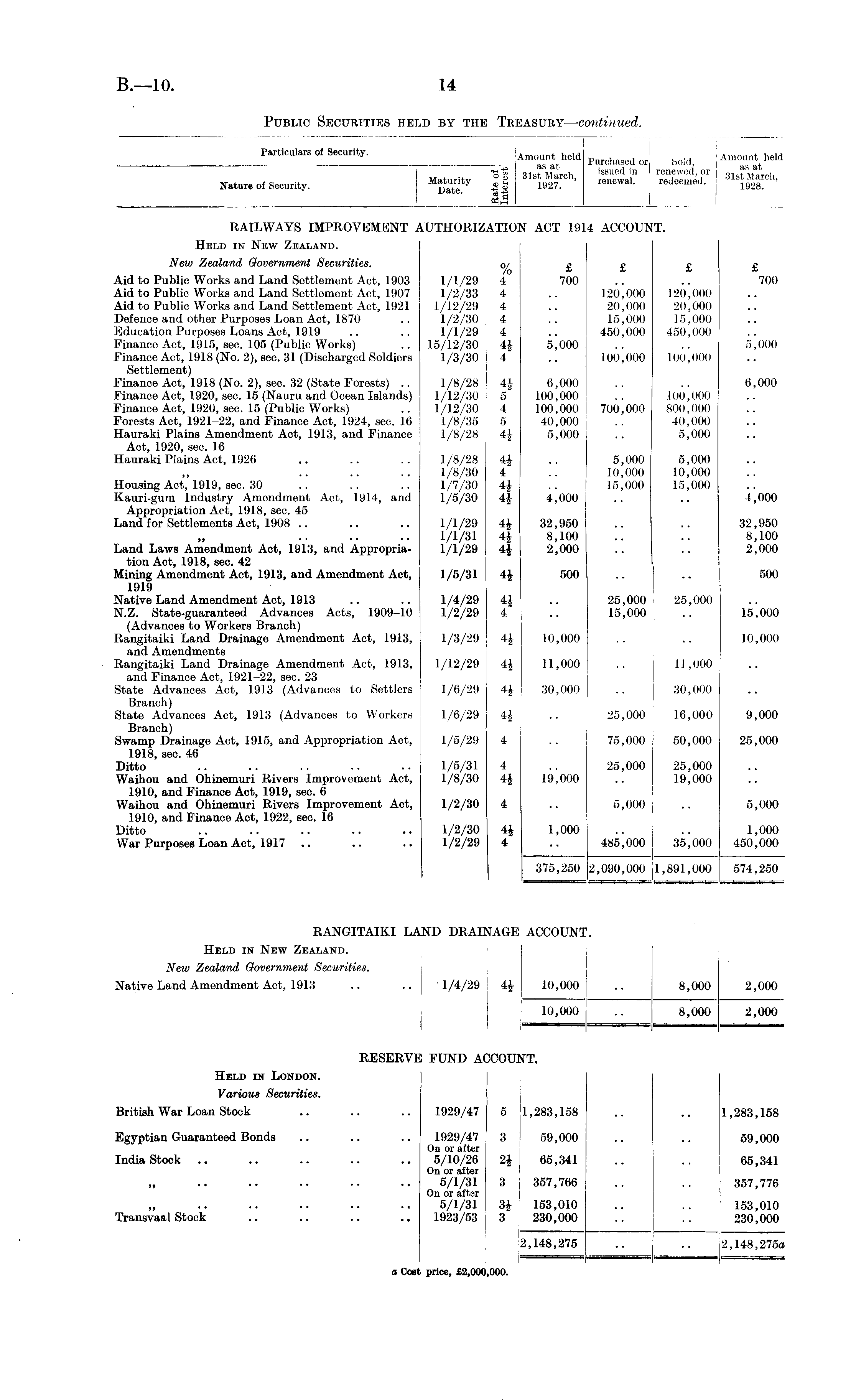 oculars of Security. Amountheld Purcha3ed or gold , , Amount held I I o? 31st March issued in renewed, or 3l " . Nature of Security. M « |§ m ' redee ™ d - 1 9 28 ' I 1 aa RAILWAYS IMPROVEMENT AUTHORIZATION ACT 1914 ACCOUNT. Held in New Zealand. New Zealand Government Securities. °/ £, £ £ £ Aid to Public Works and Land Settlement Act, 1903 1/1/29 4 700 .. .. 700 Aid to Public Works and Land Settlement Act, 1907 1/2/33 4 .. 120,000 120,000 Aid to Public Works and Land Settlement Act, 1921 1/12/29 4 .. 20,000 20,000 Defence and other Purposes Loan Act, 1870 .. 1/2/30 4 .. 15,000 15,000 Education Purposes Loans Act, 1919 .. .. 1/1/29 4 .. 450,000 450,000 Finance Act, 1915, sec. 105 (Public Works) .. 15/12/30 4J 5,000 .. .. 5,000 Finance Act, 1918 (No. 2), see. 31 (Discharged Soldiers 1/3/30 4 .. 100,000 100,000 Settlement) Finance Act, 1918 (No. 2), sec. 32 (State Forests) .. 1/8/28 4£ 6,000 .. .. 6,000 Finance Act, 1920, sec. 15 (Nauru and Ocean Islands) 1/12/30 5 100,000 .. 100,000 Finance Act, 1920, sec. 15 (Public Works) .. 1/12/30 4 100,000 700,000 800,000 Forests Act, 1921-22, and Finance Act, 1924, sec. 16 1/8/35 5 40,000 .. 40,000 Hauraki Plains Amendment Act, 1913, and Finance 1/8/28 4J 5,000 .. 5,000 Act, 1920, sec. 16 Hauraki Plains Act, 1926 .. .. .. 1/8/28 4J .. 5,000 5,000 ...... 1/8/30 4 .. 10,000 10,000 Housing Act, 1919, sec. 30 .. .. .. 1/7/30 4£ .. 15,000 15,000 Kauri-gum Industry Amendment Act, 1914, and 1/5/30 4J 4,000 .. .. 4,000 Appropriation Act, 1918, sec. 45 Land for Settlements Act, 1908 .. .. .. 1/1/29 41 32,950 .. .. 32,950 1/1/31 4J 8,100 .. .. 8,100 Land Laws Amendment Act, 1913, and Appropria- 1/1/29 41 2,000 .. .. 2,000 tion Act, 1918, sec. 42 Mining Amendment Act, 1913, and Amendment Act, 1/5/31 4£ 500 .. .. 500 1919 Native Land Amendment Act, 1913 .. .. 1/4/29 4£ .. 25,000 25,000 N.Z. State-guaranteed Advances Acts, 1909-10 1/2/29 4 .. 15,000 .. 15,000 (Advances to Workers Branch) Rangitaiki Land Drainage Amendment Act, 1913, 1/3/29 4J 10,000 .. .. 10,000 and Amendments Rangitaiki Land Drainage Amendment Act, 1913, 1/12/29 4J 11,000 .. 11,000 and Finanoe Aot, 1921-22, sec. 23 State Advances Act, 1913 (Advances to Settlers 1/6/29 4J 30,000 .. 30,000 Branch) State Advances Act, 1913 (Advances to Workers 1/6/29 4J .. 25,000 16,000 9,000 Branch) Swamp Drainage Act, 1915, and Appropriation Aot, 1/5/29 4 .. 75,000 50,000 25,000 1918, see. 46 Ditto .. .. .. .. .. 1/5/31 4 .. 25,000 25,000 Waihou and Ohinemuri Rivers Improvement Act, 1/8/30 4J 19,000 .. 19,000 1910, and Finance Act, 1919, sec. 6 Waihou and Ohinemuri Rivers Improvement Act, 1/2/30 4 .. 5,000 .. 5,000 1910, and Finance Act, 1922, sec. 16 Ditto .. .. .. .. .. 1/2/30 4J 1,000 .. .. 1,000 War Purposes Loan Act, 1917 .. .. .. 1/2/29 4 .. 485,000 35,000 450,000 375,250 2,090,000 1,891,000 574,250 RANGITAIKI LAND DRAINAGE ACCOUNT. Held in New Zealand. New Zealand Government Securities. Native Land Amendment Act, 1913 .. .. 1/4/29 4£ 10,000 j .. 8,000 2,000 10,000 | .. 8,000 2,000 ' I I t-T— RESERVE FUND ACCOUNT. Held in London. Various Securities. British War Loan Stock .. .. .. 1929/47 5 1,283,158 .. .. 1,283,158 Egyptian Guaranteed Bonds .. .. .. 1929/47 3 59,000 .. .. 59,000 On or after India Stock .. .. .. .. .. 5/10/26 2J 65,341 .. .. 65,341 On or after 5/1/31 3 357,766 .. .. 357,776 On or after „ .. .. .. .. .. 5/1/31 3i 153,010 .. .. 153,010 Transvaal Stock .. .. .. .. 1923/53 3 230,000 .. .. 230,000 j 2,148,275 .. .. 2,148,275<z 1 — 1 1 1 ■ a Cost price, £2,000,000.