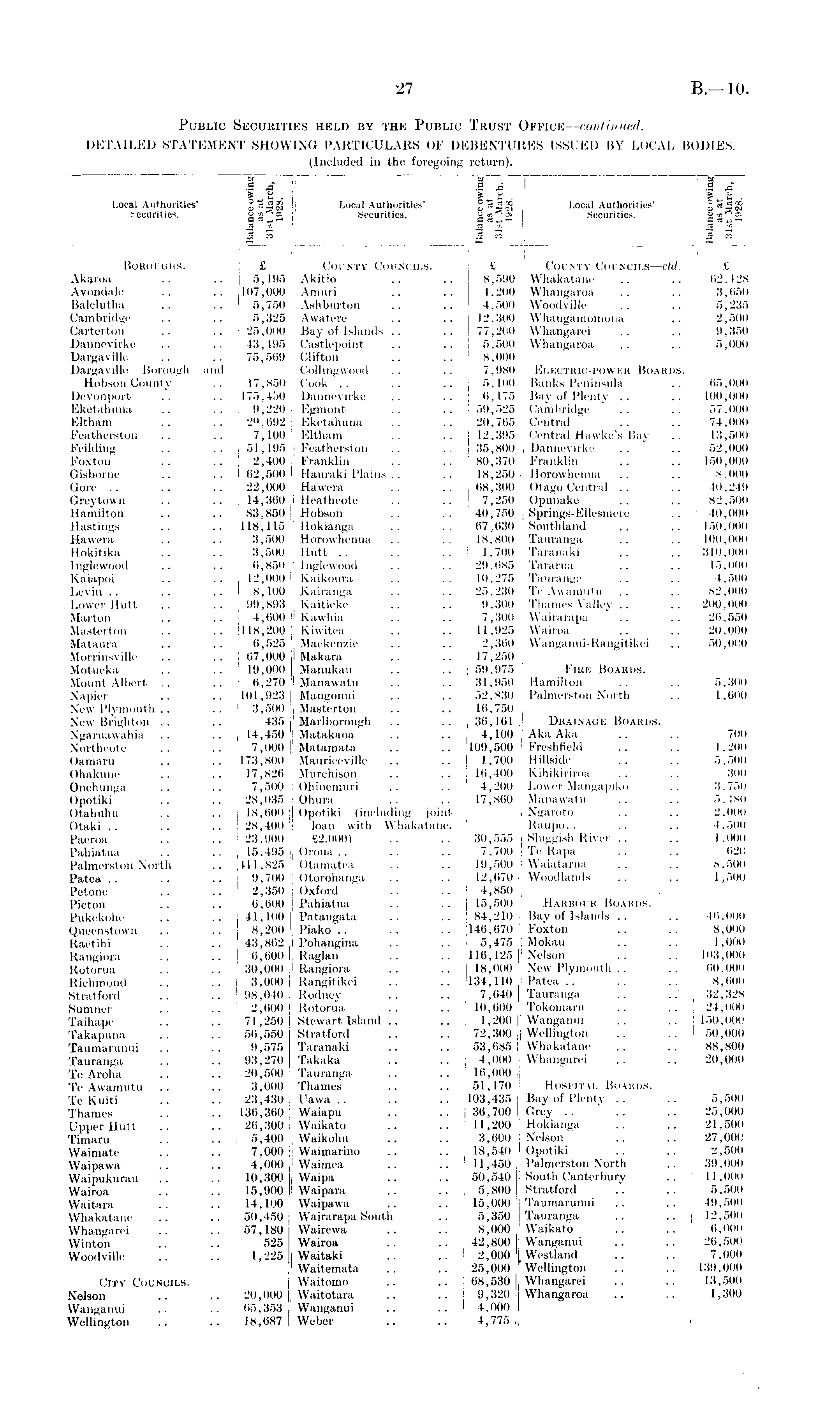 I t>o .a d * 2 . Local Authorities' ® 03 Securities. " fl »+iH _C« CO I W w Boroughs. £ Akaroa .. .. 5,195 Avondale .. .. 107,000 Balclutha .. .. 5,750 Cambridge .. .. 5,325 Carterton .. .. 25,000 Dannevirke .. .. 43,495 Dargaville .. .. 75,569 Dargaville Borough and Hobson County .. 17,850 Devonport .. .. 175,450 Eketahuna .. .. 9,220 Eltham .. .. 29,692 Featherston .. .. j 7,100 Feilding .. .. 51,195 Foxton .. .. 2,400 Gisborne .. . . 02,500 Gore .. .. .. 22,000 Grey town .. .. 14,360 Hamilton .. .. 83,850 Hastings .. .. 118,115 Hawera .. .. 3,500 Hokitika .. .. 3,500 Tnglewood .. .. 6,850 Kaiapoi .. .. 12,000 Levin .. .. .. 8,100 Lower Hutt .. .. 99,893 Marton .. .. 4,600 Masterton .. .. 118,200 Mataura .. .. 6,525 Morrinsville .. .. 67,000 Motueka .. .. 19,000 Mount Albert .. .. 6,270 Napier .. .. 101,923 New Plymouth .. .. 3,500 New Brighton .. .. 435 Ngaruawahia .. .. 14,450 Northcote .. .. 7,000 Oamaru .. .. 173,800 Ohakune .. .. 17,826 Onehunga .. .. 7,500 Opotiki .. .. 28,035 Otahuhu .. .. 18,600 Otaki .. .. .. 28,400 Paeroa .. .. 23,900 Pahiatua .. .. 15,495 Palmerston North .. 411,825 Patea .. .. .. 9,700 Petone .. .. 2,350 Pieton .. .. 6,600 Pukekohe .. .. 41,100 Queenstown .. .. 8,200 Raetihi .. .. 43,862 Rangiora .. .. 6,600 Rotorua .. .. 30,000 Richmond .. .. 3,000 Stratford . . .. 98,040 Sumner .. .. 2,600 Taihape .. .. 71,250 Takapuna .. .. j 56,550 Taumarunui .. .. 9,575 Tauranga .. j 93,270 TeAroha .. .. 20,500 Te Awamutu .. ..I 3,000 Te Kuiti .. .. ) 23,430 Thames .. .. 136,360 Upper Hutt .. •• I 26,300 Timaru . . • • 5,400 Waimate .. .. 7,000 Waipawa .. .. 4,000 Waipukurau .. .. 10,300 Wairoa .. .. 15,900 Waitara .. .. 14,100 Whakatane .. .. 50,450 Whangarei .. .. 57,180 Winton .. .. 525 Woodville .. .. 1,225 City Councils. Nelson .. .. 20,000 { Wanganui .. .. 65,353 Wellington .. ..I 18,687