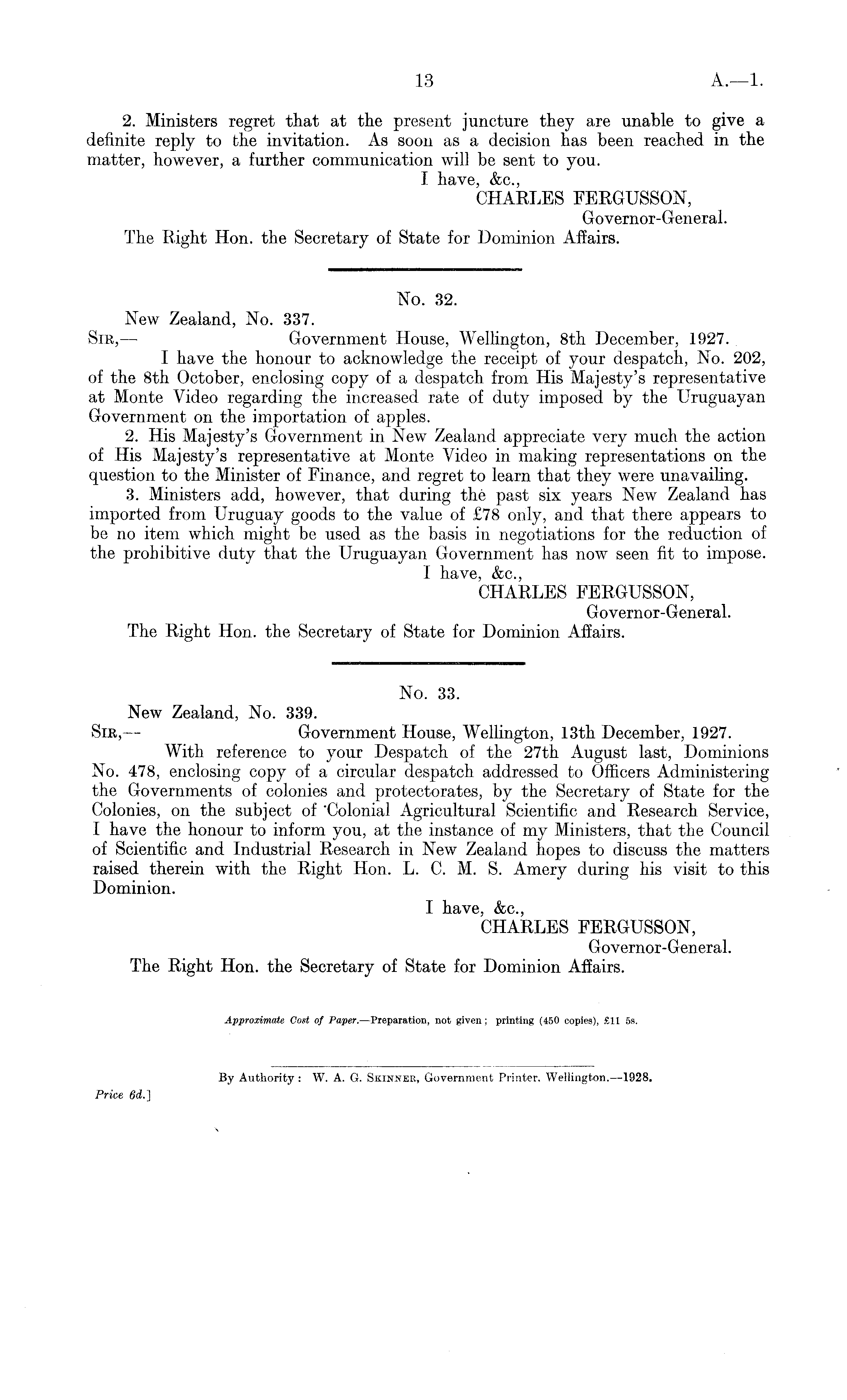 No. 33. New Zealand, No. 339. Sir, — Government House, Wellington, 13th December, 1927. With reference to your Despatch of the 27th August last, Dominions No. 478, enclosing copy of a circular despatch addressed to Officers Administering the Governments of colonies and protectorates, by the Secretary of State for the Colonies, on the subject of 'Colonial Agricultural Scientific and Research Service, I have the honour to inform you, at the instance of my Ministers, that the Council of Scientific and Industrial Research in New Zealand hopes to discuss the matters raised therein with the Right Hon. L. C. M. S. Amery during his visit to this Dominion. I have, &c., CHARLES FERGUSSON, Governor-General. The Right Hon. the Secretary of State for Dominion Affairs.