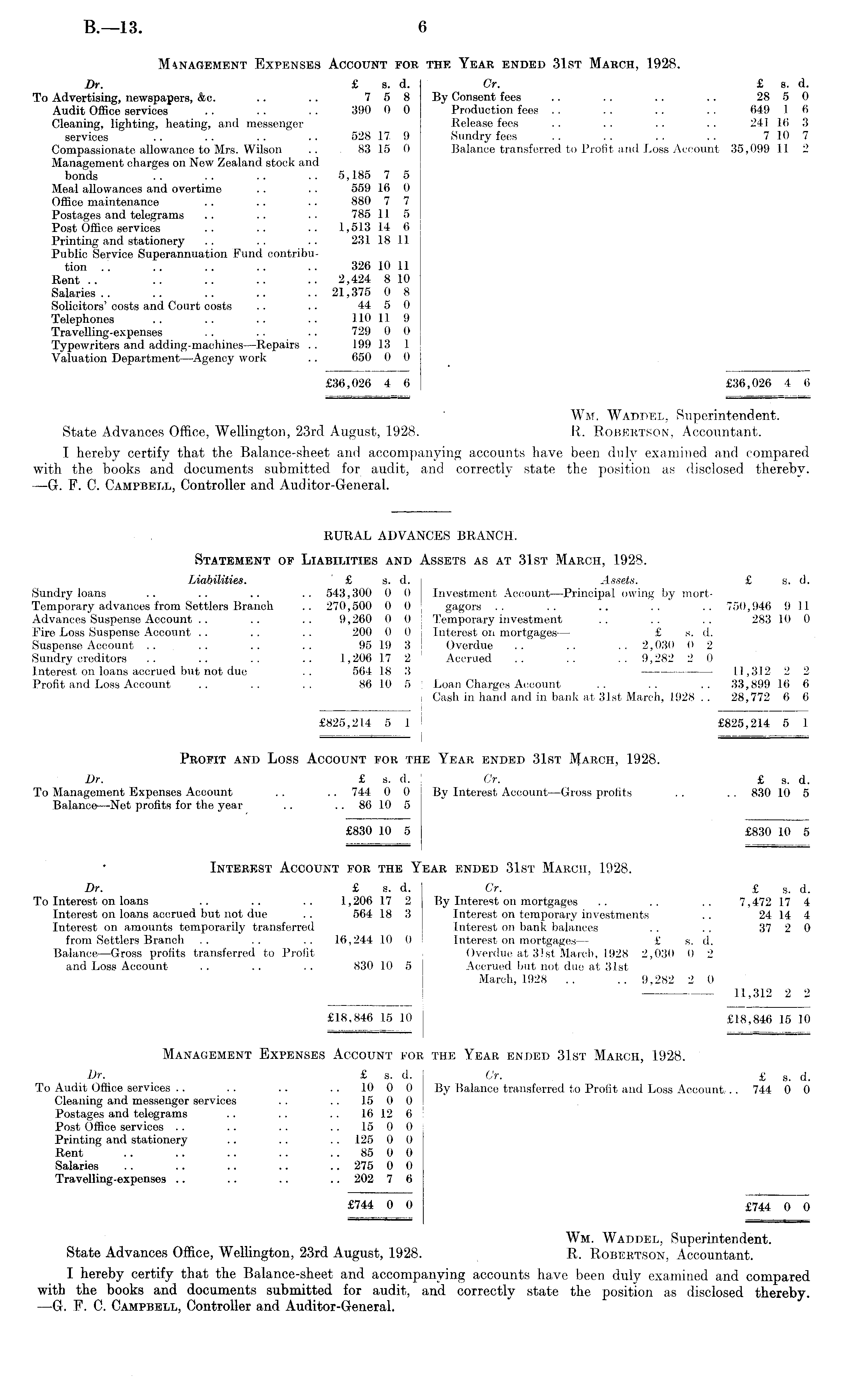 Management Expenses Account fob the Year ended 31st March, 1928. Dr. £ s. d. Cr. £ s. d. To Advertising, newspapers, &c. .. .. 7 5 8 By Consent fees .. .. .. .. 28 5 0 Audit Office services .. .. .. 390 0 0 Production fees .. . . .. .. 649 1 6 Cleaning, lighting, heating, and messenger Release fees .. . . .. .. 241 16 3 services .. .. .. .. 528 17. 9 Sundry fees .. . . . . .. 7 10 7 Compassionate allowance to Mrs. Wilson .. 83 15 0 Balance transferred to Profit and Loss Account 35,099 11 2 Management charges on New Zealand stock and bonds .. .. .. .. 5,185 7 5 Meal allowances and overtime .. .. 559 16 0 Office maintenance .. .. .. 880 7 7 Postages and telegrams .. .. .. 785 11 5 Post Office services .. .. .. 1,513 14 6 Printing and stationery .. . . .. 231 18 11 Public Service Superannuation Fund contribution .. .. .. .. .. 326 10 11 Rent .. .. .. .. .. 2,424 810 Salaries.. .. .. .. .. 21,375 0 8 Solicitors' oosts and Court costs .. .. 44 5 0 Telephones .. .. .. .. 110 11 9 Travelling-expenses .. .. •. 729 0 0 Typewriters and adding-machines—Repairs .. 199 13 1 Valuation Department—Agency work .. 650 0 0 £36,026 4 6 £36,026 4 6 Wm. Waddel, Superintendent. State Advances Office, Wellington, 23rd August, 1928. R. Robertson, Accountant. I hereby certify that the Balance-sheet and accompanying accounts have been duly examined and compared with the books and documents submitted for audit, and correctly state the position as disclosed thereby. —G. F. C. Campbell, Controller and Auditor-General. RURAL ADVANCES BRANCH. Statement op Liabilities and Assets as at 31st March, 1928. Liabilities. £ s. d. Asset*. £ s. d. Sundry loans .. .. .. .. 543,300 0 0 Investment Account —Principal owing by mortTemporary advances from Settlers Branch .. 270,500 0 0 gagors .. .. .. .. .. 750,946 9 11 Advances Suspense Account .. .. .. 9,260 0 0 Temporary investment .. .. .. 283 10 0 Fire Loss Suspense Account .. .. .. 200 0 0 Interest on mortgages — £ s. d. Suspense Account .. .. .. .. 95 19 3 Overdue .. .. .. 2,030 0 2 Sundry creditors .. .. .. .. 1,206 17 2 Accrued .. .. .. 9,282 2 0 Interest on loans accrued but not due .. 564 18 3 11,312 2 2 Profit and Loss Account .. .. .. 86 10 5 Loan Charges Account .. .. .. 33,899 16 6 Cash in hand and in bank at 31st March, 1928 . . 28,772 6 6 £825,214 5 1 1 £825,214 5 1 ■ - ■ I ===— Profit and Loss Account for the Year ended 31st March, 1928. Dr. £ s. (1. Cr. £ s. d. To Management Expenses Account .. .. 744 0 0 By Interest Account —Gross profits . . . . 830 10 5 Balance—Net profits for the year .. 86 10 5 £830 10 5 £830 10 5 Interest Account for the Year ended 31st March, 1928. Dr. £ s. d. Cr. £ 3 . d. To Interest on loans .. .. .. 1,206 17 2 By Interest on mortgages .. .. .. 7,472 17 4 Interest on loans accrued but not due . . 564 18 3 Interest on temporary investments .. 24 14 4 Interest on amounts temporarily transferred Interest on bank balances . . .. 37 2 0 from Settlers Branch .. .. .. 16,244 10 0 Interest on mortgages— £ s. d. Balance—Gross profits transferred to Profit Overdue at 31st March, 1928 2,030 0 2 and Loss Account . . .. .. 830 10 5 Accrued but not due at 31st March, 1928 .. .. 9,282 2 0 11,312 2 2 £18,846 15 10 £18,846 15 10 Management Expenses Account for the Year ended 31st March, 1928. Dr. £ s. d. Cr. £ s . d. To Audit Office services .. .. .. .. 10 0 0 By Balance transferred to Profit and Loss Account,.. 744 0 0 Cleaning and messenger services .. .. 15 0 0 Postages and telegrams .. .. .. 16 12 6 Post Office services .. .. .. .. 15 0 0 Printing and stationery .. .. .. 125 0 0 Rent .. .. .. .. 85 0 0 Salaries .. .. .. .. .. 275 0 0 Travelling-expenses .. .. .. .. 202 7 6 £744 0 0 £744 o 0 Wm. Waddel, Superintendent. State Advances Office, Wellington, 23rd August, 1928. R. Robertson, Accountant. I hereby certify that the Balance-sheet and accompanying accounts have been duly examined and compared with the books and documents submitted for audit, and correctly state the position as disclosed thereby. —G. E. C. Campbell, Controller and Auditor-General.