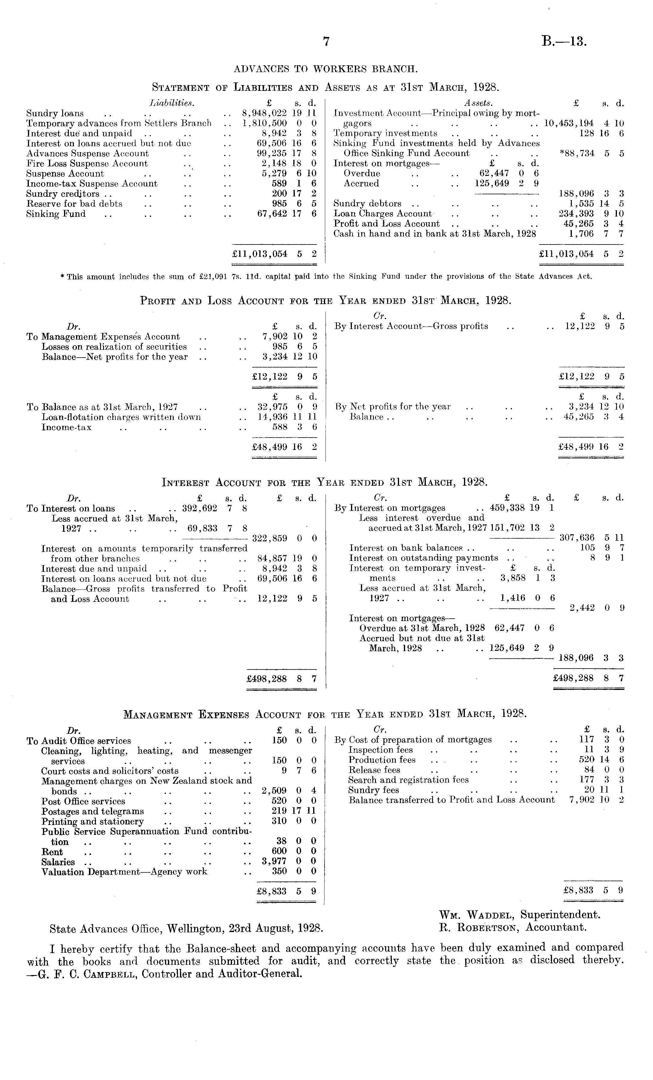 ADVANCES TO WORKERS BRANCH. Statement or Liabilities and Assets as at 31st March, 1928. Liabilities. £ s. d. Assets. £ s. d. Sundry loans .. .. .. .. 8,948,022 19 11 Investment Account—Principal owing by mortTemporary advances from Settlers Branch .. 1,810,500 0 0 gagors .. .. .. .. 10,453,194 410 Interest due'and unpaid .. .. .. 8,942 3 8 Temporary investments .. .. .. 128 16 6 Interest on loans accrued but not due .. 69,506 16 6 Sinking Fund investments held by Advances Advances Suspense Account .. .. 99,235 17 8 Office Sinking Fund Account .. .. *88,734 5 5 Fire Loss Suspense Account .. .. 2,148 18 0 Interest on mortgages — £ s. d. Suspense Account .. .. .. 5,279 6 10 Overdue .. .. 62,447 0 6 Income-tax Suspense Account .. .. 589 1 6 Accrued .. .. 125,649 2 9 Sundry creditors .. .. .. .. 200 17 2 188,096 3 3 Reserve for bad debts .. .. .. 985 6 5 Sundry debtors .. . . .. .. 1,535 14 5 Sinking Fund .. .. .. .. 67,642 17 6 Loan Charges Account .. .. .. 234,393 910 Profit and Loss Account .. .. .. 45,265 3 4 Cash in hand and in bank at 31st March, 1928 1,706 7 7 £11,013,054 5 2 £11,013,054 5 2 * This amount includes the sum of £21,091 7s. lid. capital paid into the Sinking Fund under the provisions of the State Advances Act. Profit and Loss Account for the Year ended 31st March. 1928. Or. £ s. d. Dr. £ s. d. By Interest Account —Gross profits .. .. 12,122 9 5 To Management Expenses Account .. .. 7,902 10 2 Losses on realization of securities .. .. 985 6 5 Balance—Net profits for the year .. .. 3,234 12 10 £12,122 9 5 £12,122 9 5 £ s. d. £ s. d. To Balance as at 31st March, 1927 .. .. 32,975 0 9 By Net profits for the year .. .. .. 3,234 12 10 Loan-flotation charges written down .. 11,936 11 11 Balance.. .. .. .. .. 45,265 3 4 Income-tax .. .. .. .. 588 3 6 £48,499 16 2 £48,499 16 2 Interest Account for the Year ended 31st March, 1928. Dr. £ s. d. £ s. d. Cr. £ s. d. £ s. d. To Interest on loans .. .. 392.692 7 8 By Interest on mortgages .. 459,338 19 1 Less accrued at 31st March, Less interest overdue and 1927 .. .. .. 69,833 7 8 accrued at 31st March, 1927 151,702 13 2 322,859 0 0 307,636 5 11 Interest on amounts temporarily transferred Interest on bank balances .. .. .. 105 9 7 from other branches .. .. .. 84,857 19 0 Interest on outstanding payments .. .. 8 9 1 Interest due and unpaid .. .. .. 8,942 3 8 Interest on temporary invest- £ s. d. Interest on loans accrued but not due .. 69,506 16 6 ments .. .. 3,858 1 3 Balance —Gross profits transferred to Profit Less accrued at 31st March, and Loss Account .. .. .. 12,122 9 5 1927 .. .. .. 1,416 0 6 2,442 0 9 Interest on mortgages— Overdue at 31st March, 1928 62,447 0 6 Accrued but not due at 31st March, 1928 .. .. 125,649 2 9 • — 188,096 3 3 £498,288 8 7 £498,288 8 7 Management Expenses Account for the Year ended 31st March, 1928. Dr. £ s. d. Or. £ s. d. To Audit Office services .. .. .. 150 0 0 By Cost of preparation of mortgages .. .. 117 3 0 Cleaning, lighting, heating, and messenger Inspection fees .. .. .. .. 1139 services .. .. .. .. 150 0 0 Production fees .. .. .. .. 520 14 6 Court costs and solicitors' costs .. .. 9 7 6 Release fees .. .. .. . . 84 0 0 Management charges on New Zealand stock and Search and registration fees .. . . 177 3 3 bonds .. .. .. .. . ■ 2,509 0 4 Sundry fees .. .. .. .. 20 11 1 Post Office services .. .. .. 520 0 0 Balance transferred to Profit and Loss Account 7,902 10 2 Postages and telegrams .. .. .. 219 17 11 Printing and stationery .. .. .. 310 0 0 Public Service Superannuation Fund contribution .. .. .. • ■ •. 38 0 0 Rent .. .. • ■ .. . • 600 0 0 Salaries .. .. .. .. .. 3,977 0 0 Valuation Department —Agency work .. 350 0 0 £8,833 5 9 £8,833 5 9 Wm. Waddel, Superintendent. State Advances Office, Wellington, 23rd August, 1928. R. Robertson, Accountant. I hereby certify that the Balance-sheet and accompanying accounts have been duly examined and compared with the books and documents submitted for audit, and correctly state the position as disclosed thereby, —G. F. C. Campbell, Controller and Auditor-General.