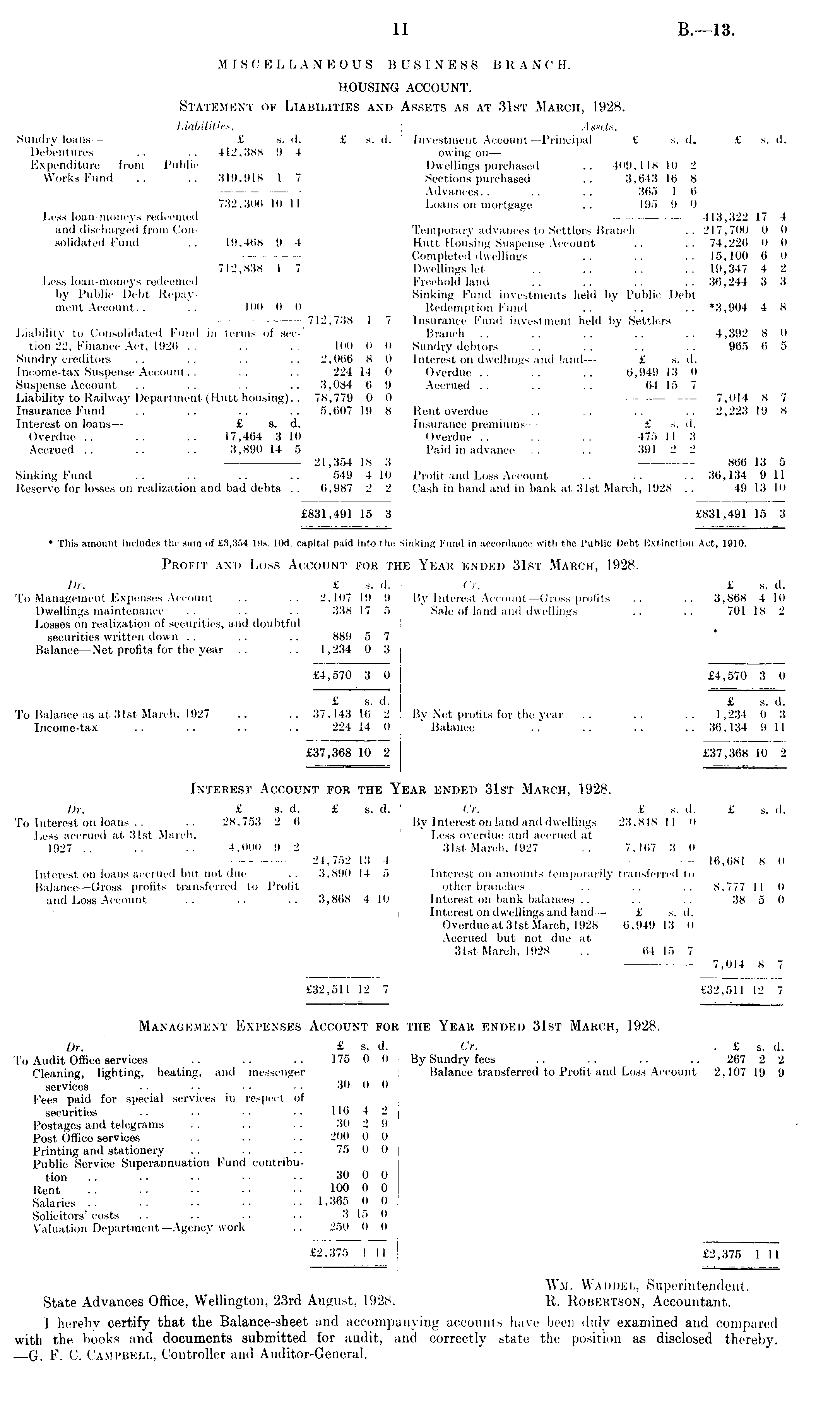 Statement op Liabilities and Assets as at 31st March, 1928. Liabilities. Assets. Sundry loans-— £ s. d. £ s. d. Investment Account—Principal £ s. d. £ s. d. Debentures .. .. 412,388 9 4 owing on — Expenditure from Public Dwellings purchased .. 409,118 10 2 Works Fund .. .. 319,918 1 7 Sections purchased .. 3,643 16 8 Advances.. .. .. 365 1 6 732,306 10 11 Loans on mortgage .. 195 9 0 Less loan-moneys redeemed 413,322 17 4 and discharged from Con- Temporary advances to Settlers Branch .. 217,700 0 0 solidated Fund .. 19,468 9 4 Hutt Housing Suspense Account .. .. 74,226 0 0 Completed dwellings .. .. .. 15,100 6 0 712,838 1 7 Dwellings let .. .. .. .. 19,347 4 2 Less loan-moneys redeemed Freehold land .. .. . . . . 36,244 3 3 by Public Debt Repay- Sinking Fund investments held by Public Debt ment Account.. .. 100 0 0 Redemption Fund .. .. .. *3,904 4 8 712,738 1 7 Insurance Fund investment held by Settlers Liability to Consolidated Fund in terms of sec-' Branch .. .. .. .. .. 4,392 8 0 tion 22, Finance Act, 1926 .. .. .. 100 0 0 Sundry debtors .. .. .. .. 965 6 5 Sundry creditors .. .. .. .. 2,066 8 0 Interest on dwellings and land— £ s. d. Income-tax Suspense Account. . .. .. 224 14 0 Overdue .. .. .. 6,949 13 0 Suspense Account .. .. .. .. 3,084 6 9 Accrued .. .. .. 64 15 7 Liability to Railway Department (Hutt housing).. 78,779 0 0 7,014 8 7 Insurance Fund .. .. .. .. 5,607 19 8 Rent overdue .. .. .. .. 2,223 19 8 Interest on loans — £ s. d. Insurance premiums— £ s. d. Overdue .. .. .. 17,464 3 10 Overdue .. .. .. 475 11 3 Accrued .. .. .. 3,890 14 5 Paid in advance .. .. 391 2 2 21,354 18 3 866 13 5 Sinking Fund .. .. .. .. 549 410 Profit and Loss Account .. .. .. 36,134 911 Reserve for losses on realization and bad debts .. 6,987 2 2 Cash in hand and in bank at 31st March, 1928 .. 49 13 10 £831,491 15 3 £831,491 15 3 * This amount includes the sum of £3,354 19s. lOd. capital paid into the Sinking Fund in accordance with the Public Debt Extinction Act, 1910. Promt and Loss Account for the Year ended 31st March, 1928. Dr. £ s. d. Cr. £ s. d. To Management Expenses Account .. .. 2,107 19 9 By Interest Account—Gross profits .. .. 3,868 410 Dwellings maintenance .. .. .. 338 17 5 Sale of land and dwellings .. .. 701 18 2 Losses on realization of securities, and doubtful securities written down .. .. .. 889 5 7 Balance —Net profits for the year .. .. .1,234 0 3 £4,570 3 0 £4,570 3 0 £ s. d. £ s. d. To Balance as at 31st March, 1927 .. .. 37,143 16 2 By Net profits for the year .. .. .. 1,234 0 3 Income-tax .. .. .. .. 224 14 0 Balance .. .. .. .. 36,134 9 11 £37,368 10 2 £37,368 10 2 Interest Account for the Year ended 31st March, 1928. Dr. £ s. d. £ s. d. Cr. £ s. d. £ s. d. To Interest on loans .. .. 28,753 2 6 By Interest on land and dwellings 23,848 11 0 Less accrued at 31st March, Less overdue and accrued at 1927 .. .. .. 4,000 9 2 31st March, 1927 .. 7,167 3 0 24,752 13 4 j 16,681 8 0 Interest on loans accrued but not due .. 3,890 14 5 Interest on amounts temporarily transferred to Balance —Gross profits transferred to Profit other branches .. .. .. 8,777 11 0 and Loss Account .. .. .. 3,868 4 10 Interest on bank balances .. .. .. 38 5 0 Interest on dwellings and land— £ s. d. Overdue at 31st March, 1928 6,949 13 0 Accrued but not due at 31st March, 1928 .. 64 15 7 — 7,014 8 7 £32,511 12 7 j £32,511 12 7 Management Expenses Account for the Year ended 31st March, 1928. Dr. £ s. d. Cr. . £ s. d. To Audit Office services .. .. .. 175 0 0 By Sundry fees .. .. .. .. 267 2 2 Cleaning, lighting, heating, and messenger Balance transferred to Profit and Loss Account 2,107 19 9 services . • • • • • • ■ 30 0 0 Fees paid for special services in respect of securities .. • • • • • • 116 4 2 Postages and telegrams .. .. .. 30 2 9 Post Office services .. .. .. 200 0 0 Printing and stationery . . .. .. 75 0 0 Public Service Superannuation Fund contribution .. . • • ■ • ■ •■ 30 0 0 Rent .. ■ • • • • • • • 100 0 0 Salaries .. • • ■ • • • 1 > 365 0 0 Solicitors' costs .. .. ■. ■ • 315 0 Valuation Department—Agency work .. 250 0 0 £2,375 1 11 £2,375 1 11 Wm. Waddel, Superintendent. State Advances Office, Wellington, 23rd August, 1928. R. Robertson, Accountant. I hereby certify that the Balance-sheet and accompanying accounts have been duly examined and compared with the books and documents submitted for audit, and correctly state the position as disclosed thereby. —G. F. C. Campbell, Controller and Auditor-General.