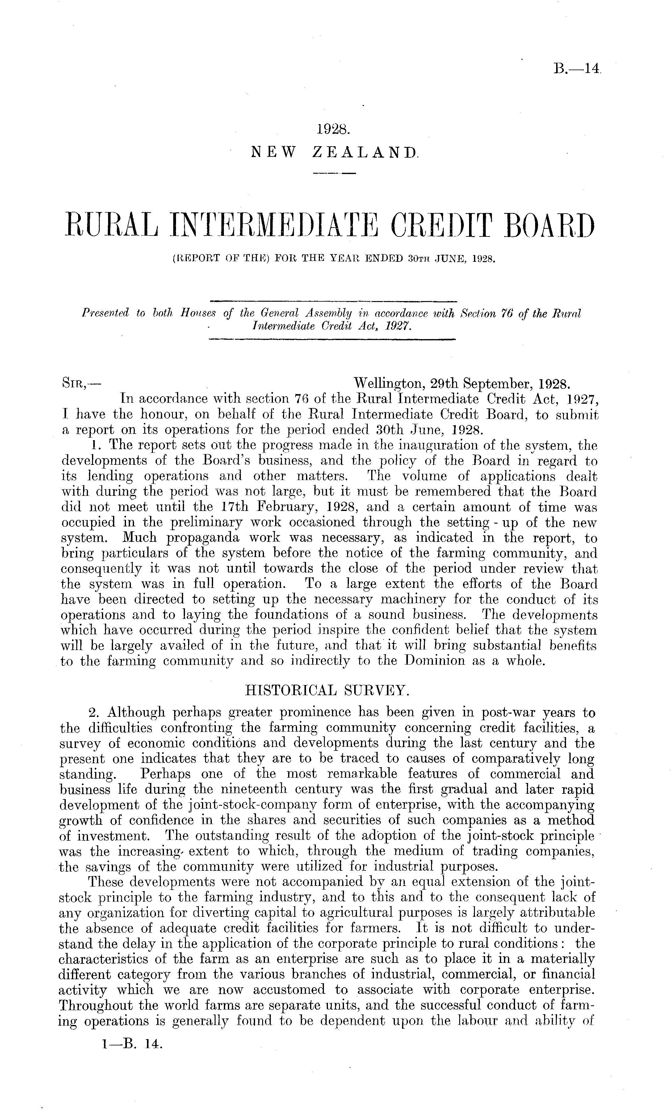 Sir, — Wellington, 29th September, 1928. In accordance with section 78 of the Rural Intermediate Credit Act, 1927, I have the honour, on behalf of the Rural Intermediate Credit Board, to submit a report on its operations for the period ended 30th June, 1928. 1. The report sets Out the progress made in the inauguration of the system, the developments of the Board's business, and the policy of the Board in regard to its lending operations and other matters. The volume of applications dealt with during the period was not large, but it must be remembered that the Board did not meet until the 17th February, 1928, and a certain amount of time was occupied in the preliminary work occasioned through the setting - up of the new system. Much propaganda work was necessary, as indicated in the report, to bring particulars of the system before the notice of the farming community, and consequently it was not until towards the close of the period under review that the system was in full operation. To a large extent the efforts of the Board have been directed to setting up the necessary machinery for the conduct of its operations and to laying the foundations of a sound business. The developments which have occurred during the period inspire the confident belief that the system will be largely availed of in the future, and that it will bring substantial benefits to the farming community and so indirectly to the Dominion as a whole. HISTORICAL SURVEY. 2. Although perhaps greater prominence has been given in post-war years to the difficulties confronting the farming community concerning credit facilities, a survey of economic conditions and developments during the last century and the present one indicates that they are to be traced to causes of comparatively long standing. Perhaps one of the most remarkable features of commercial and business life during the nineteenth century was the first gradual and later rapid development of the joint-stock-company form of enterprise, with the accompanying growth of confidence in the shares and securities of such companies as a method of investment. The outstanding result of the adoption of the joint-stock principle was the increasing, extent to which, through the medium of trading companies, the savings of the community were utilized for industrial purposes. These developments were not accompanied by an equal extension of the jointstock principle to the farming industry, and to this and to the consequent lack of any organization for diverting capital to agricultural purposes is largely attributable the absence of adequate credit facilities for farmers. It is not difficult to understand the delay in the application of the corporate principle to rural conditions : the characteristics of the farm as an enterprise are such as to place it in a materially different category from the various branches of industrial, commercial, or financial activity which we are now accustomed to associate with corporate enterprise. Throughout the world farms are separate units, and the successful conduct of farming operations is generally found to be dependent upon the labour and ability of