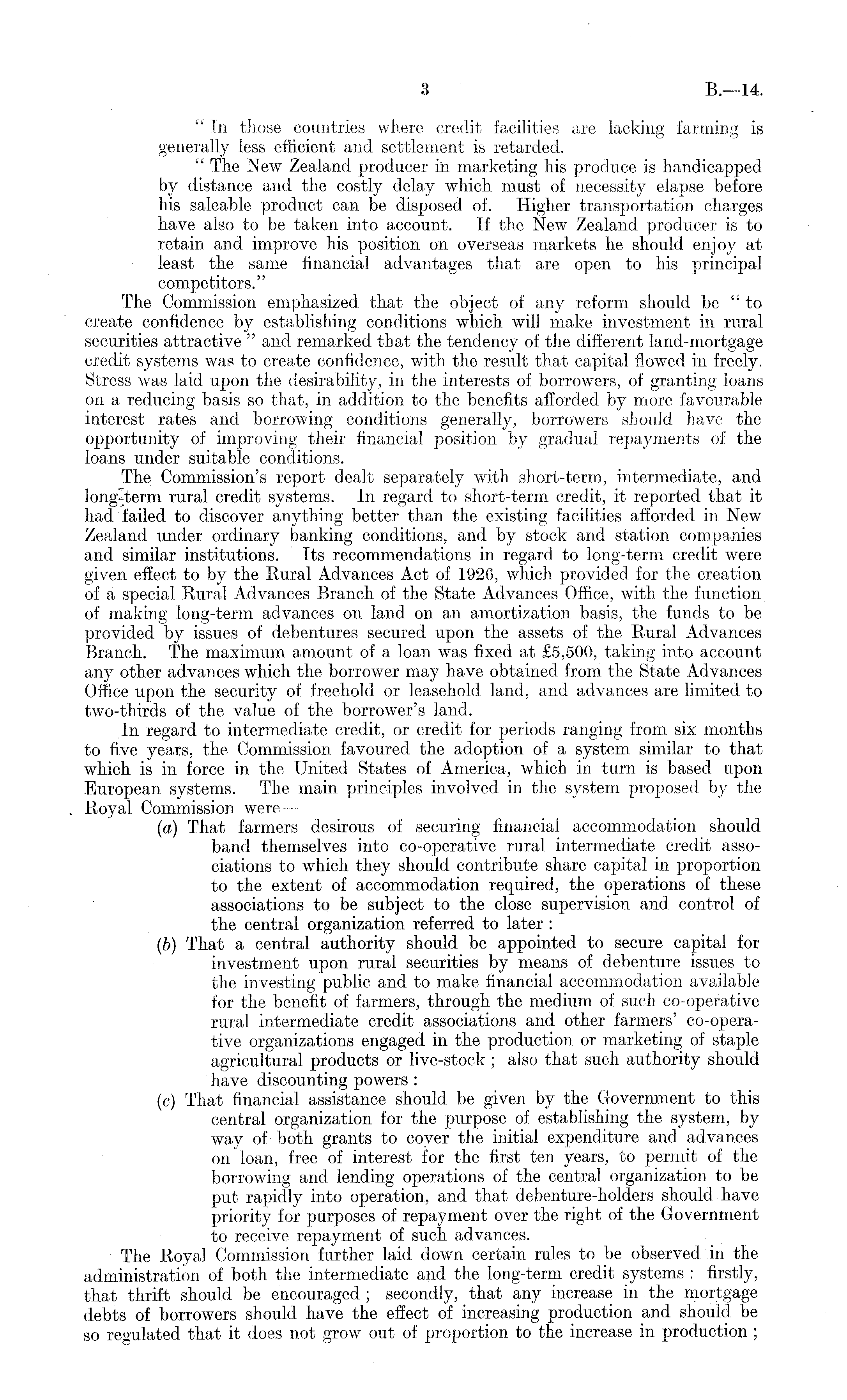 "In those countries where credit facilities are lacking farming is generally less efficient and settlement is retarded. " The New Zealand producer in marketing his produce is handicapped by distance and the costly delay which must of necessity elapse before his saleable product can be disposed of. Higher transportation charges have also to be taken into account. If the New Zealand producer is to retain and improve his position on overseas markets he should enjoy at least the same financial advantages that are open to his principal competitors." The Commission emphasized that the object of any reform should be " to create confidence by establishing conditions which will make investment in rural securities attractive " and remarked that the tendency of the different land-mortgage credit systems was to create confidence, with the result that capital flowed in freely. Stress was laid upon the desirability, in the interests of borrowers, of granting loans on a reducing basis so that, in addition to the benefits afforded by more favourable interest rates and borrowing conditions generally, borrowers should have the opportunity of improving their financial position by gradual repayments of the loans under suitable conditions. The Commission's report dealt separately with short-term, intermediate, and long-term rural credit systems. In regard to short-term credit, it reported that it had failed to discover anything better than the existing facilities afforded in New Zealand under ordinary banking conditions, and by stock and station companies and similar institutions. Its recommendations in regard to long-term credit were given effect to by the Rural Advances Act of 1926, which provided for the creation of a special Rural Advances Branch of the State Advances Office, with the function of making long-term advances on land on an amortization basis, the funds to be provided by issues of debentures secured upon the assets of the Rural Advances Branch. The maximum amount of a loan was fixed at £5,500, taking into account any other advances which the borrower may have obtained from the State Advances Office upon the security of freehold or leasehold land, and advances are limited to two-thirds of the value of the borrower's land. In regard to intermediate credit, or credit for periods ranging from six months to five years, the Commission favoured the adoption of a system similar to that which is in force in the United States of America, which in turn is based upon European systems. The main principles involved in the system proposed by the Royal Commission were (a) That farmers desirous of securing financial accommodation should band themselves into co-operative rural intermediate credit associations to which they should contribute share capital in proportion to the extent of accommodation required, the operations of these associations to be subject to the close supervision and control of the central organization referred to later : (b) That a central authority should be appointed to secure capital for investment upon rural securities by means of debenture issues to the investing public and to make financial accommodation available for the benefit of farmers, through the medium of such co-operative rural intermediate credit associations and other farmers' co-opera-tive organizations engaged in the production or marketing of staple agricultural products or live-stock ; also that such authority should have discounting powers : (c) That financial assistance should be given by the Government to this central organization for the purpose of establishing the system, by way of both grants to cover the initial expenditure and advances on loan, free of interest for the first ten years, to permit of the borrowing and lending operations of the central organization to be put rapidly into operation, and that debenture-holders should have priority for purposes of repayment over the right of the Government to receive repayment of such advances. The Royal Commission further laid down certain rules to be observed in the administration of both the intermediate and the long-term credit systems : firstly, that thrift should be encouraged ; secondly, that any increase in the mortgage debts of borrowers should have the effect of increasing production and should be so regulated that it does not grow out of proportion to the increase in production ;