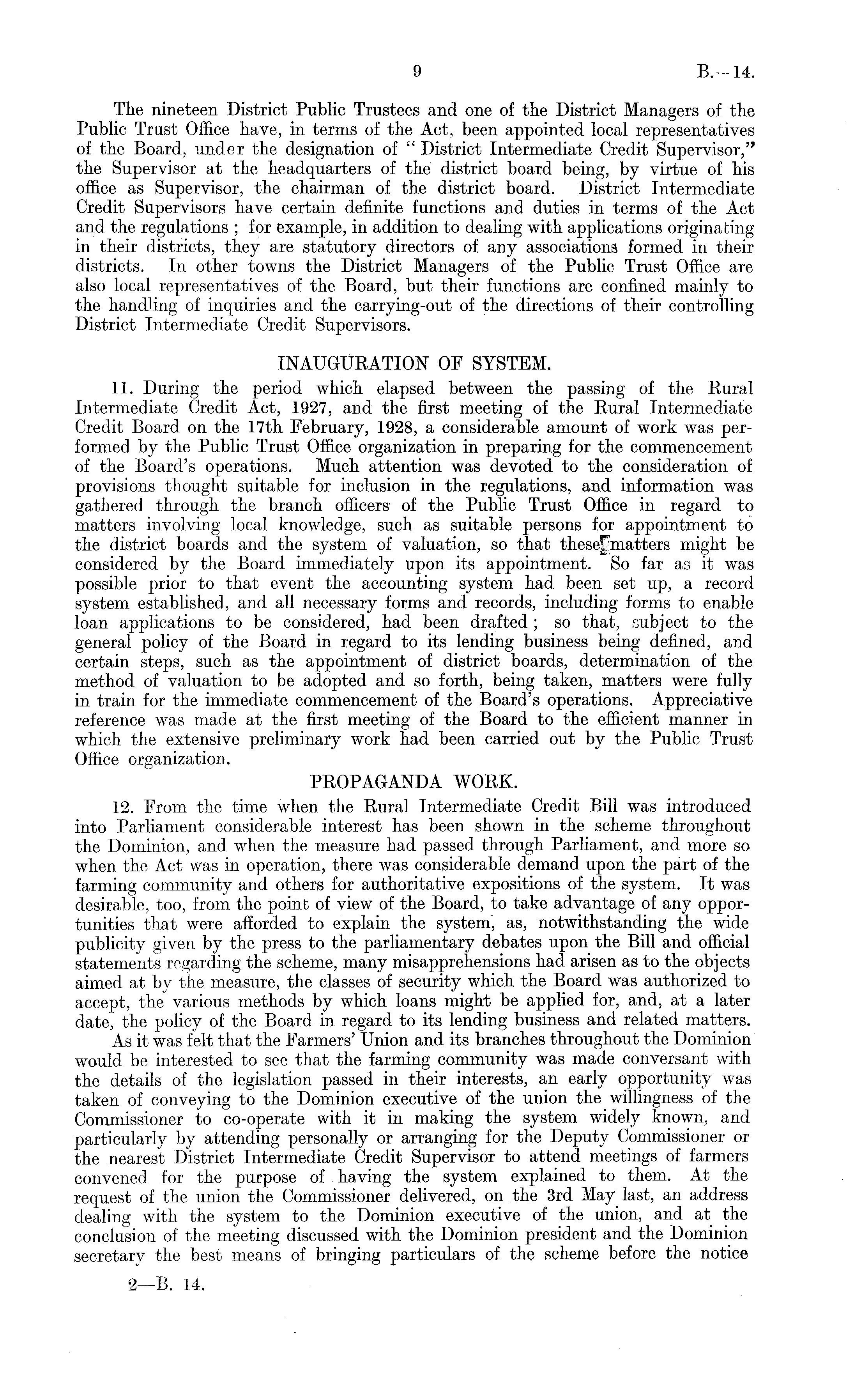 The nineteen District Public Trustees and one of the District Managers of the Public Trust Office have, in terms of the Act, been appointed local representatives of the Board, under the designation of " District Intermediate Credit Supervisor," the Supervisor at the headquarters of the district board being, by virtue of his office as Supervisor, the chairman of the district board. District Intermediate Credit Supervisors have certain definite functions and duties in terms of the Act and the regulations ; for example, in addition to dealing with applications originating in their districts, they are statutory directors of any associations formed in their districts. In other towns the District Managers of the Public Trust Office are also local representatives of the Board, but their functions are confined mainly to the handling of inquiries and the carrying-out of the directions of their controlling District Intermediate Credit Supervisors. INAUGURATION OF SYSTEM. 11. During the period which elapsed between the passing of the Rural Intermediate Credit Act, 1927, and the first meeting of the Rural Intermediate Credit Board on the 17th February, 1928, a considerable amount of work was performed by the Public Trust Office organization in preparing for the commencement of the Board's operations. Much attention was devoted to the consideration of provisions thought suitable for inclusion in the regulations, and information was gathered through the branch officers of the Public Trust Office in regard to matters involving local knowledge, such as suitable persons for appointment to the district boards and the system of valuation, so that thesejmatters might be considered by the Board immediately upon its appointment. So far as it was possible prior to that event the accounting system had been set up, a record system established, and all necessary forms and records, including forms to enable loan applications to be considered, had been drafted ; so that, subject to the general policy of the Board in regard to its lending business being defined, and certain steps, such as the appointment of district boards, determination of the method of valuation to be adopted and so forth, being taken, matters were fully in train for the immediate commencement- of the Board's operations. Appreciative reference was made at the first meeting of the Board to the efficient manner in which the extensive preliminary work had been carried out by the Public Trust Office organization. PROPAGANDA WORK. 12. From the time when the Rural Intermediate Credit Bill was introduced into Parliament considerable interest has been shown in the scheme throughout the Dominion, and when the measure had passed through Parliament, and more so when the Act was in operation, there was considerable demand upon the part of the farming community and others for authoritative expositions of the system. It was desirable, too, from the point of view of the Board, to take advantage of any opportunities that were afforded to explain the system", as, notwithstanding the wide publicity given by the press to the parliamentary debates upon the Bill and official statements regarding the scheme, many misapprehensions had arisen as to the objects aimed at by the measure, the classes of security which the Board was authorized to accept, the various methods by which loans might be applied for, and, at a later date, the policy of the Board in regard to its lending business and related matters. As it was felt that the Farmers' Union and its branches throughout the Dominion would be interested to see that the farming community was made conversant with the details of the legislation passed in their interests, an early opportunity was taken of conveying to the Dominion executive of the union the willingness of the Commissioner to co-operate with it in making the system widely known, and particularly by attending personally or arranging for the Deputy Commissioner or the nearest District Intermediate Credit Supervisor to attend meetings of farmers convened for the purpose of having the system explained to them. At the request of the union the Commissioner delivered, on the 3rd May last, an address dealing with the system to the Dominion executive of the union, and at the conclusion of the meeting discussed with the Dominion president and the Dominion secretary the best means of bringing particulars of the scheme before the notice