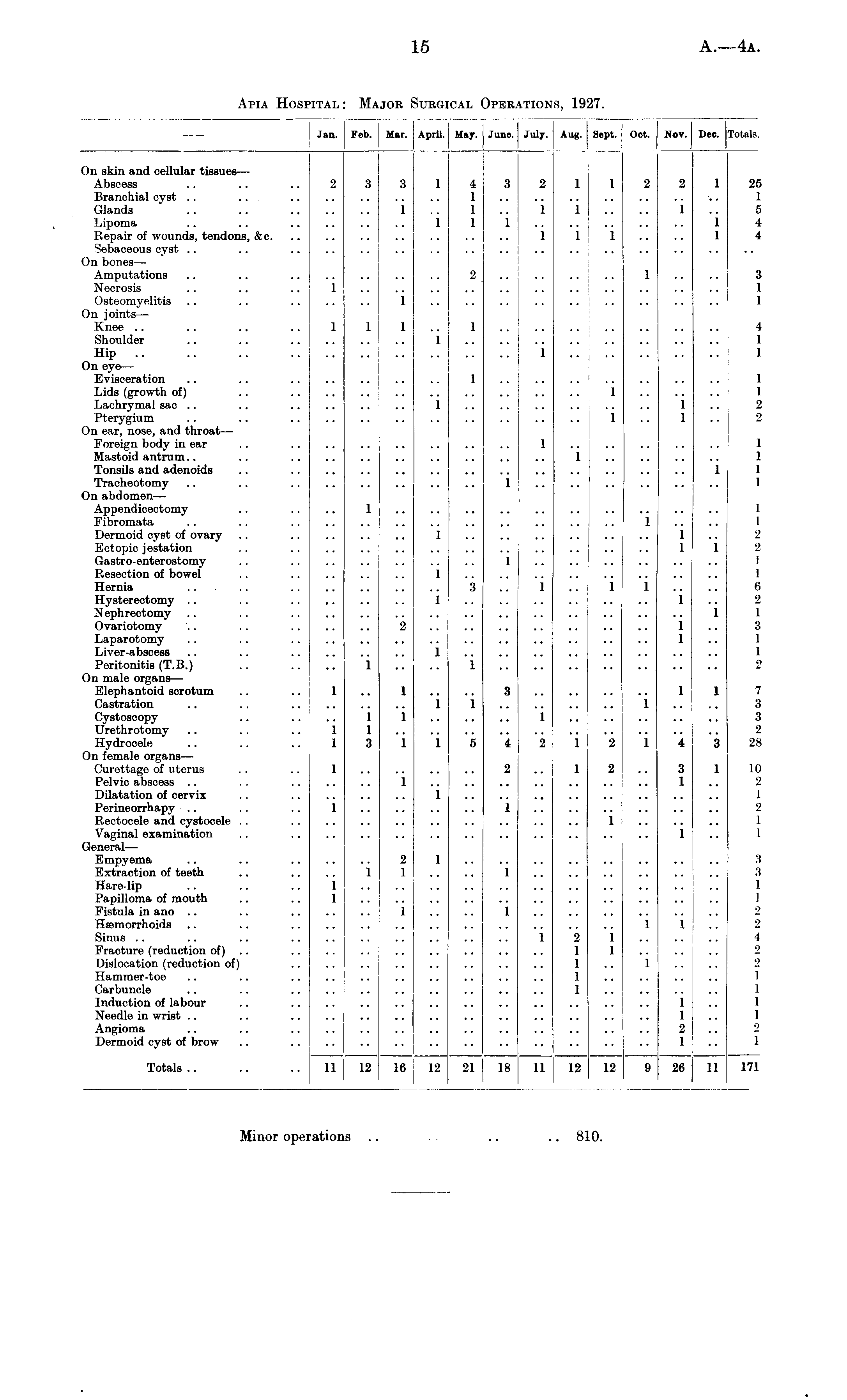 Jan. Feb. Mar. April. May. June. July. Aug. Sept. Oct. Nov. Dec. Totals. On akin and cellular tissues — Abscess .. .. 233143211221 25 Branchial cyst .. .. .. .. .. .. .. 1 .. .. .. .. .. .. .. 1 Glands .. .. 1 .. 1 .. 1 1 .. .. 1 .. 5 Lipoma .. .. .. .. .. .. 1 1 1 .. .. .. .. .. 1 4 Repair of wounds, tendons, &c .. .. .. .. .. 1 1 1 .. .. 1 4 Sebaceous cyst .. .. On bones— Amputations .. .. .. .. .. .. .. 2 .. .. .. .. 1 .. .. 3 Necrosis .. .. .. 1 1 Osteomyelitis .. .. .. .. .. 1 .. .. .. .. .. .. .. .. .. 1 On joints— Knee .. .. .. .. 1 1 1 .. 1 4 Shoulder .. .. 1 1 Hip .. .. .. 1 1 On eye — Evisceration .. .. .. 1 .... .. .. .. .. .. 1 Lids (growth of) .. 1 1 Lachrymal sac .. .. .. .. .. .. 1 .. .. .. .. .. .. 1 .. 2 Pterygium .. .. I .. 1 .. 1 .. 2 On ear, nose, and throat— Foreign body in ear .. .. .. .. .. .. .. .. 1 .. .. .. .. .. 1 Mastoid antrum.. .. 1 1 Tonsils and adenoids .. .. .. .. .. .. .. 1 1 Tracheotomy .. .. .. 1 1 On abdomen— Appendicectomy .. .. .. 1 1 Fibromata .. .. 1 .. .. i Dermoid cyst of ovary .. 1 1 .. 2 Ectopic jestation .. 1 1 2 Gastroenterostomy .. 1 1 Resection of bowel .. 1 .. .. 1 Hernia .. .. 3 .. 1 .. 1 1 .. .. 6 Hysterectomy .. .. 1 1 .. 2 Nephrectomy .. .. .. .. .. 1 1 Ovariotomy .. .. 2 1 .. 3 Laparotomy .. . . .. .. .. .. .. .. 1 .. 1 Liver-abscess .. .. .. 1 .. .. 1 Peritonitis (T.B.) .. .. .. 1 .. .. 1 2 On male organs— Elephantoid scrotum .. .. 1 .. 1 .. .. 3 1 1 7 Castration .. .. 1 1 1 .. .. 3 Cystoscopy .. .. .. 1 1 .. .. .. 1 .. 3 Urethrotomy .. .. .. 1 1 .. .. 2 Hydrocele .. .. 131154212143 28 On female organs— Curettage of uterus .. .. 1 2 .. 1 2 .. 3 1 10 Pelvic abscess .. .. 1 1 .. 2 Dilatation of cervix .. .. .. .. 1 .. .. .. 1 Perineorrhapy .. 1 .. 1 .. .. .. .. .. .. 2 Rectocele and cystocele .. 1 1 Vaginal examination .. 1 .. 1 General — Empyema .. .. 2 1 3 Extraction of teeth .. .. .. 1 1 .. .. 1 .. .. .. .. .. .. 3 Hare lip .. .. .. 1 1 Papilloma of mouth .. .. 1 1 Fistula in ano .. .. 1 .. .. 1 2 Haemorrhoids .. .. .. .. .. 1 1 .. 2 Sinus .. .. .. 1 2 1 4 Fracture (reduction of) .. .. .. 1 1 .. .. .. 2 Dislocation (reduction of) 1 .. 1 .. .. 2 Hammer-toe .. .. .. .. .. .. .. 1 .. .. .. .. I Carbuncle .. .. .. .. .. .. .. .. .. .. 1 .. 1 Induction of labour .. 1 .. 1 Needle in wrist .. .. .. .. .. .. .. 1 .. 1 Angioma .. .. .. .. .. 2 .. 2 Dermoid cyst of brow .. .. .. .. .. .. .. .. .. 1 .. 1 Totals.. .. .. 11 j 12 16 , 12 21 18 11 12 12 9 26 11 171 Minor operations .. .. .. 810.