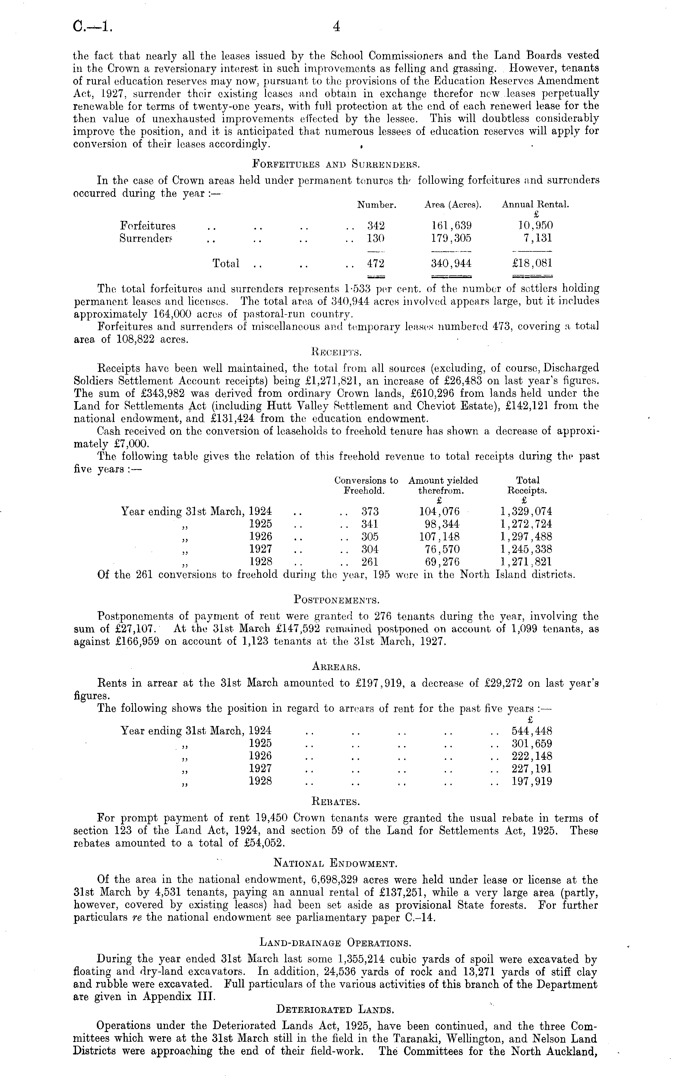 the fact that nearly all the leases issued by the School Commissioners and the Land Boards vested in the Crown a reversionary interest in such improvements as felling and grassing. However, tenants of rural education reserves may now, pursuant to the provisions of the Education Reserves Amendment Act, 1927, surrender their existing leases and obtain in exchange therefor new .leases perpetually renewable for terms of twenty-one years, with full protection at the end of each renewed lease for the then value of unexhausted improvements effected by the lessee. This will doubtless considerably improve the position, and it is anticipated that numerous lessees of education reserves will apply for conversion of their leases accordingly. , Forfeitures and Surrenders. In the case of Crown areas held under permanent tenures th/ following forfeitures and surrenders occurred during the year : — Number. Area (Aores). Annual Rental. £ Forfeitures .. .. .. ..342 161,639 10.950 Surrender? .. .. .. .. 130 179,305 7,131 Total .. .. ..472 340,944 £18,081 The total forfeitures and surrenders represents 1-533 per cent, of the number of settlors holding permanent leases and licenses. The total area of 340,944 acres involved appears large, but it includes approximately 164,000 acres of pastoral-run country. Forfeitures and surrenders of miscellaneous and temporary leases numbered 473, covering a total area of 108,822 acres. Receipts. Receipts have been well maintained, the total from all sources (excluding, of course, Discharged Soldiers Settlement Account receipts) being £1,271,821, an increase of £26,483 on last year's figures. The sum of £343,982 was derived from ordinary Crown lands, £610,296 from lands held under the Land for Settlements Act (including Hutt Valley Settlement and Cheviot Estate), £142,121 from the national endowment, and £131,424 from the education endowment. Cash received on the conversion of leaseholds to freehold tenure has shown a decrease of approximately £7,000. The following table gives the relation of this freehold revenue to total receipts during the past five years : — Conversions to Amount yielded Total Freehold. therefrom. Receipts. £ £ Year ending 31st March, 1924 .. .. 373 104,076 1,329,074 1925 .. .. 341 98,344 1,272,724 1926 .. .. 305 107,148 1,297,488 1927 .. .. 304 76,570 1,245,338 1928 .. .. 261 69,276 1,271,821 Of the 261 conversions to freehold during the year, 195 were in the North Island districts. Postponements. Postponements of payment of rent were granted to 276 tenants during the year, involving the sum of £27,107. At the 31st March £147,592 remained postponed on account of 1,099 tenants, as against £166,959 on account of 1,123 tenants at the 31st March, 1.927. Arrears. Rents in arrear at the 31st March amounted to £197,919, a decrease of £29,272 on last year's figures. The following shows the position in regard to arrears of rent for the past five years : — £ Year ending 31st March, 1924 .. .. .. .. .. 544,448 1925 .. .. .. .. .. 301,659 1926 .. .. .. .. .. 222,148 1927 .. .. .. .. ..227,191 1928 .. .. .. .. .. 197,919 Rebates. For prompt payment of rent 19,450 Crown tenants were granted the usual rebate in terms of section 123 of the Land Act, 1924, and section 59 of the Land for Settlements Act, 1925. These rebates amounted to a total of £54,052. National Endowment. Of the area in the national endowment, 6,698,329 acres were held under lease or license at the 31st March by 4,531 tenants, paying an annual rental of £137,251, while a very large area (partly, however, covered by existing leases) had been set aside as provisional State forests. For further particulars re the national endowment see parliamentary paper C.-14. Land-drainage Operations. During the year ended 31st March last some 1,355,214 cubic yards of spoil were excavated by floating and dry-land excavators. In addition, 24,536 yards of rock and 13,271 yards of stiff clay and rubble were excavated. Full particulars of the various activities of this branch of the Department are given in Appendix 111. Deteriorated Lands. Operations under the Deteriorated Lands Act, 1925, have been continued, and the three Committees which were at the 31st March still in the field in the Taranaki, Wellington, and Nelson Land Districts were approaching the end of their field-work. The Committees for the North Auckland,