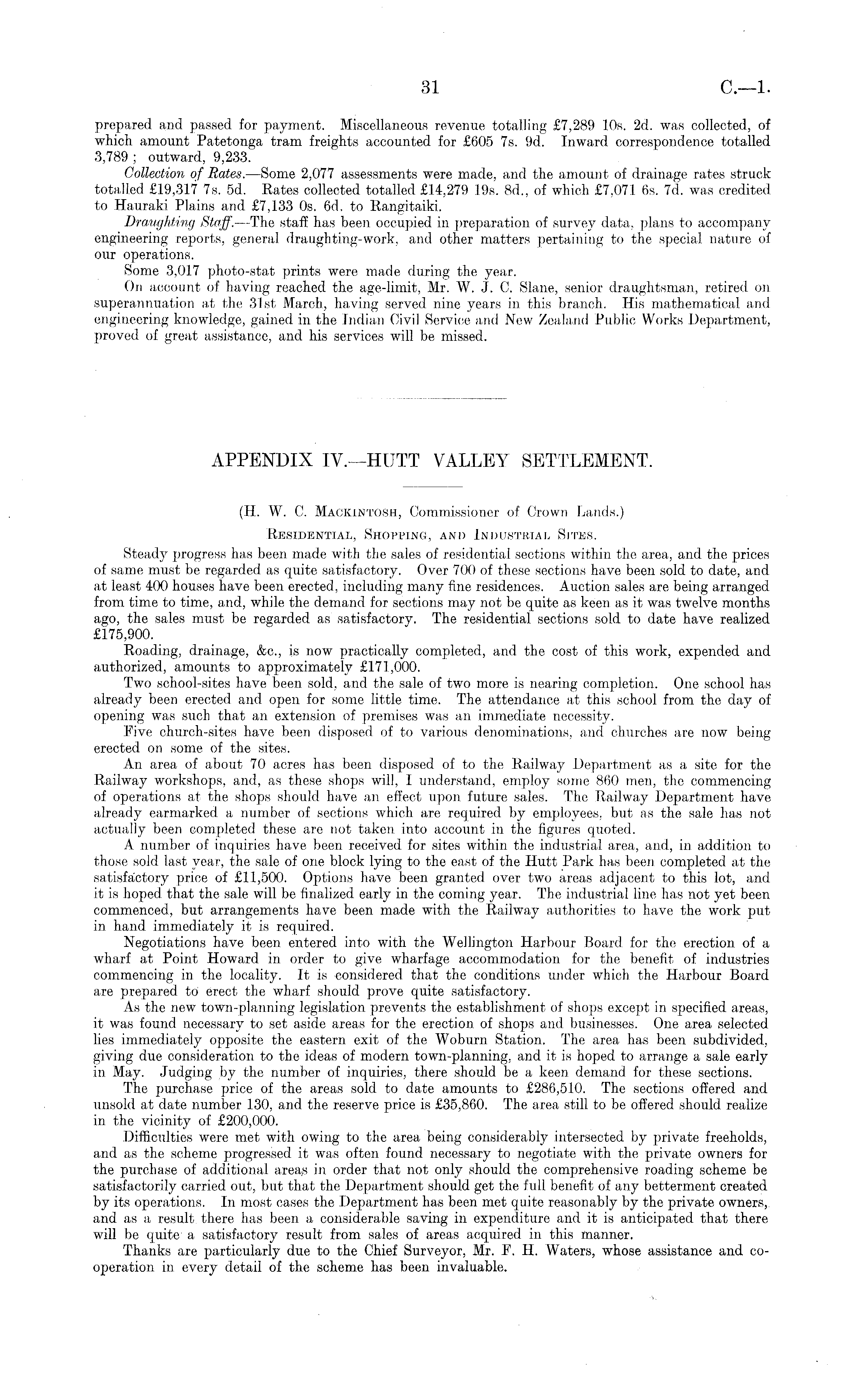 APPENDIX TV.—HUTT VALLEY SETTLEMENT. (H. W. C. Mackintosh, Commissioner of Crown Lands.) Residential, Shopping, ano Industrial Sites. Steady progress has been made with the sales of residential sections within the area, and the prices of same must be regarded as quite satisfactory. Over 700 of these sections have been sold to date, and. at least 400 houses have been erected, including many fine residences. Auction sales are being arranged from time to time, and, while the demand for sections may not be quite as keen as it was twelve months ago, the sales must be regarded as satisfactory. The residential, sections sold to date have realized £175,900. Roading, drainage, &c, is now practically completed, and the cost of this work, expended and authorized, amounts to approximately £171,000. Two school-sites have been sold, and the sale of two more is nearing completion. One school has already been erected and open for some little time. The attendance at this school from the day of opening was such that an extension of premises was an immediate necessity. Five church-sites have been disposed of to various denominations, and churches are now being erected on some of the sites. An area of about 70 acres has been disposed of to the Railway Department as a site for the Railway workshops, and, as these shops will, I understand, employ some 860 men, the commencing of operations at the shops should have an effect upon future sales. The Railway Department have already earmarked a number of sections which are required by employees, but as the sale has not actually been completed these arc not taken into account in the figures quoted. A number of inquiries have been received for sites within the industrial area, and, in addition to those sold last year, the sale of one block lying to the east of the Hutt Park has been completed at the satisfactory price of £11,500. Options have been granted over two areas adjacent to this lot, and it is hoped that the sale will be finalized early in the coming year. The industrial line has not yet been commenced, but arrangements have been made with the Railway authorities to have the work put in hand immediately it is required. Negotiations have been entered into with the Wellington Harbour Board for the erection of a wharf at Point Howard in order to give wharfage accommodation for the benefit of industries commencing in the locality. It, is considered that the conditions under which the Harbour Board are prepared to erect the wharf should prove quite satisfactory. As the new town-planning legislation prevents the establishment of shops except in specified areas, it was found necessary to set aside areas for the erection of shops and. businesses. One area selected lies immediately opposite the eastern exit of the Woburn Station. The area has been subdivided, giving due consideration to the ideas of modern town-planning, and it is hoped to arrange a sale early in May. Judging by the number of inquiries, there should be a keen demand for these sections. The purchase price of the areas sold to date amounts to £286,510. The sections offered and unsold at date number 130, and the reserve price is £35,860. The area still to be offered should realize in the vicinity of £200,000. Difficulties were met with owing to the area being considerably intersected by private freeholds, and as the scheme progressed it, was often found necessary to negotiate with the private owners for the purchase of additional areas in order that not only should the comprehensive roading scheme be satisfactorily carried out, but that the Department should get the full benefit of any betterment created by its operations. In most cases the Department has been met quite reasonably by the private owners, and as a result there has been a considerable saving in expenditure and it is anticipated that there will be quite a satisfactory result from sales of areas acquired in this manner. Thanks are particularly due to the Chief Surveyor, Mr. F. H. Waters, whose assistance and cooperation in every detail of the scheme has been invaluable.