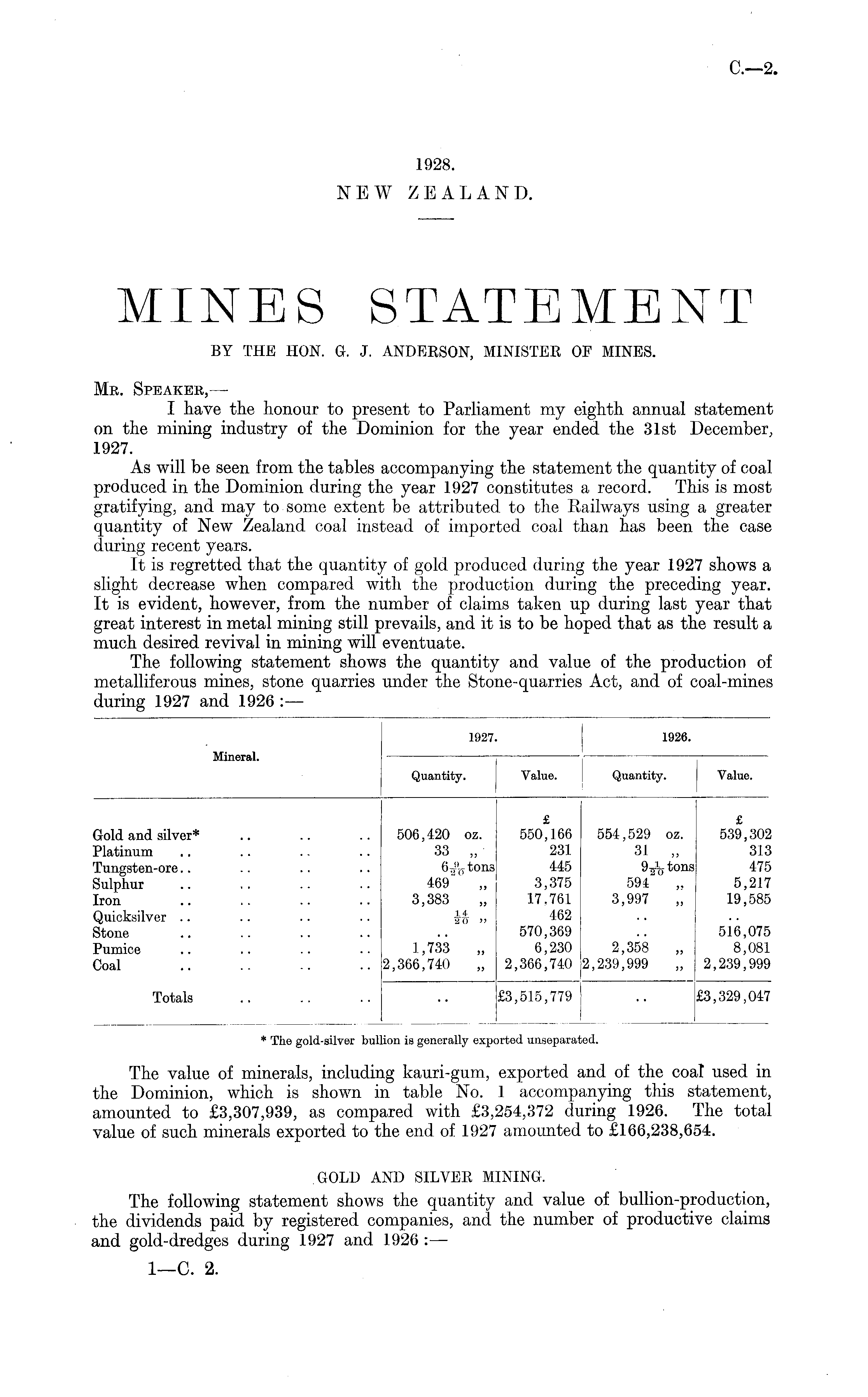 Mr. Speaker,— I have the honour to present to Parliament my eighth annual statement on the mining industry of the Dominion for the year ended the 31st December, 1927. As will be seen from the tables accompanying the statement the quantity of coal produced in the Dominion during the year 1927 constitutes a record. This is most gratifying, and may to some extent be attributed to the Railways using a greater quantity of New Zealand coal instead of imported coal than has been the case during recent years. It is regretted that the quantity of gold produced during the year 1927 shows a slight decrease when compared with the production during the preceding year. It is evident, however, from the number of claims taken up during last year that great interest in metal mining still prevails, and it is to be hoped that as the result a much desired revival in mining will eventuate. The following statement shows the quantity and value of the production of metalliferous mines, stone quarries under the Stone-quarries Act, and of coal-mines during 1927 and 1926 :—