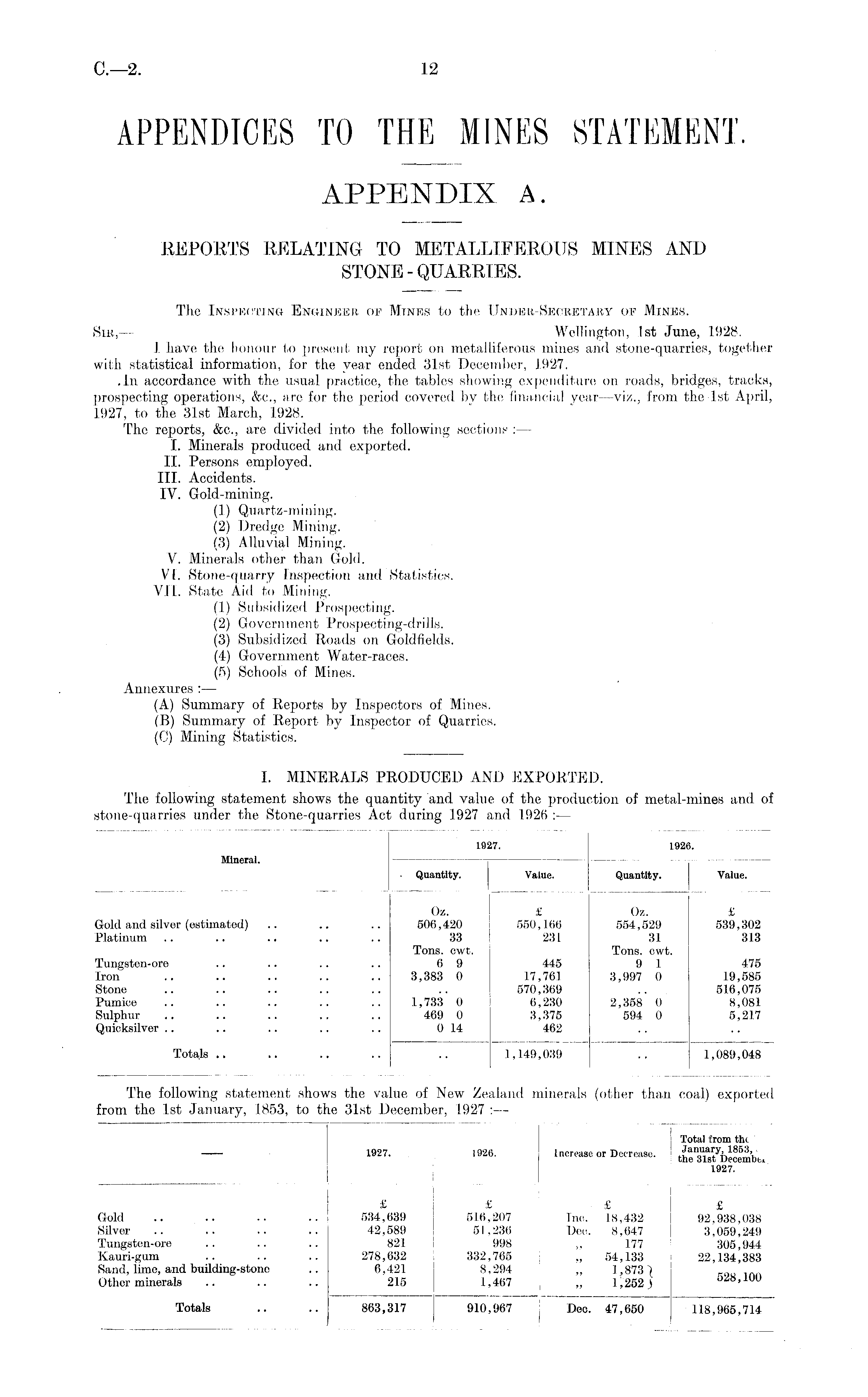 APPENDIX A. REPORTS RELATING TO METALLIFEROUS MINES AND STONE-QUARRIES. The Inspecting Engineer of Mtnes to the Under-Secretary of Mines. Sir,— Wellington, Ist June, 1928. I. have the honour to present my report on metalliferous mines and stone-quarries, together with statistical information, for the year ended 31st December, 1927. .In accordance with the usual practice, the tables showing expenditure on roads, bridges, tracks, prospecting operations, &,c, arc for the period covered by the financial year—viz., from the Ist April, 1.927, to the 31st March, 1928. The reports, &c, are divided into the following sections : — I. Minerals produced and exported. 11. Persons employed. 111. Accidents. IV. Gold-mining. (1) Quartz-mining. (2) Dredge Mining. (3) Alluvial Mining. V. Minerals other than Gold. VI. Stone-quarry Inspection and Statistics. VII. State Aid to Mining. (1) Subsidized Prospecting. (2) Government Prospecting-drills. (3) Subsidized Roads on Goldfields. (4) Government Water-races. (fi) Schools of Mines. Annexures : — (A) Summary of Reports by Inspectors of Mines. (B) Summary of Report by Inspector of Quarries. (0) Mining Statistics.