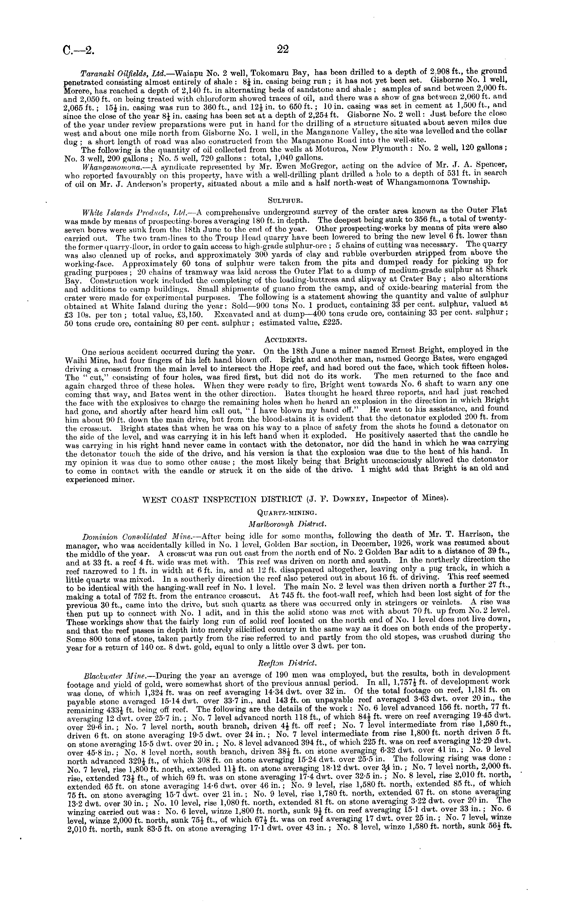 Taranaki Oilfields, Ltd.— -Waiapu No. 2 well, Tokomaru Bay, has been drilled to a depth of 2.908 ft., the ground penetrated consisting almost entirely of shale :8$ in. casing being run ; it has not yet boon set. Gisborne No. 1 well, Morere, has reached a depth of 2,140 ft. in alternating beds of sandstone and shale ; samples of sand between 2,000 ft. and 2,050 ft. on being treated with chloroform showed traces of oil, and there was a show of gas between 2,060 ft. and 2,065 ft.; 15$ in. casing was run to 360 ft., and 12$ in. to 650 ft. ; 10 in. casing was set in cement at 1,500 ft., and since the close of the year 8i in. casing has been set at a depth of 2,254 ft. Gisborne No. 2 well: Just before the close of the year under review preparations were put in hand for the drilling of a structure situated about seven miles due west and about one mile north from Gisborne No. 1 well, in the Manganone Valley, the site was levelled and tho collar dug ; a short length of road was also constructed from tho Manganone Road into the well-site. The following is the quantity of oil collected from the wells at Moturoa, New Plymouth: No. 2 well, 120 gallons ; No. 3 well, 200 gallons ; No. 5 well, 720 gallons : total, 1,040 gallons. Whangamomona.—A syndicate represented by Mr. Ewen McGregor, acting on the advice of Mr. J. A. Spencer, who reported favourably on this property, have with a well-drilling plant drilled a hole to a depth of 531 ft. m search of oil on Mr. J. Anderson's property, situated about a mile and a half north-west of Whangamotnona Township. SULTODK. While Islands Products, Ltd.—A comprehensive underground survey of the orator area known as tho Outer Flat was made by means of prospecting-bores averaging 180 ft. in depth. The deepest being sunk to 356 ft., a total of twentyseven bores were sunk from the 18th June to the end of the year. Other prospecting-works by means of pits were also carried out. The two tram-lines to tho Troup Head quarry have been lowered to bring the new lovel 6 ft. lower than the former quarry-floor, in order to gain access to high-grade sulphur-ore ; 5 chains of cutting was necessary. The quarry was also cleaned up of rocks, and approximately 300 yards of clay and rubble overburden stripped from above tho working-face. Approximately 60 tons of sulphur were taken from the pits and dumped ready for picking up for grading purposes ; 20 chains of tramway was laid across the Outer Flat to a dump of medium-grade sulphur at Shark Bay. Construction work included the completing of tho loading-buttress and slipway at Crater Bay ; also alterations and additions to camp buildings. Small shipments of guano from the camp, and of oxide-bearing material from the crater were made for experimental purposes. The following is a statoment showing the quantity and value of sulphur obtained at White Island during the year: Sold—9oo tons No. 1 product, containing 33 per cent, sulphur, valued at £3 10s. per ton ; total valuo, £3,150. Excavated and at dump—4oo tons crude oro, containing 33 per cent, sulphur ; 50 tons crude ore, containing 80 per cent, sulphur; estimated value, £225. Accidents. One serious accident occurred during the year. On tho 18th June a miner named Ernest Bright, employed in the Waihi Mine, had four fingers of his left hand blown off. Bright and another man, named George Bates, wore engaged driving a crosscut from tho main level to intersect the Hope reef, and had bored out the face, which took fifteen holos. Tho " cut," consisting of four holes, was fired first, but did not do its work. Tho men returned to the face and again charged throe of these holes. When they were ready to fire, Bright went towards No. 6 shaft to warn any one coming that way, and Bates wont in the other direction. Bates thought ho heard three reports, and had just reachod the face with, the oxplosives to charge the remaining holes when ho heard an explosion in tho direction in which Bright had gone, and shortly after heard him call out, " I have blown my hand off." He went to his assistance, and found him about 90 ft. down the main drive, but from the blood-stains it is evident that the detonator exploded 200 ft. from the crosscut. Bright states that when he was on his way to a placo of safety from the shots ho found a detonator on tho side of the level, and was carrying it in his left hand when it exploded. He positively asserted that the candle ho was carrying in his right hand never came in contact with the detonator, nor did the hand in which he was carrying the detonator touch the side of the drive, and his version is that tho explosion was due to the heat of his hand. In my opinion it was due to somo other cause ; the most likely being that Bright unconsciously allowod tho detonator to come in contact with the candle or struck it on the side of the drive. I might add that Bright is an old and experienced miner. WEST COAST INSPECTION DISTRICT (J. P. Downey, Inspector of Mines). Quartz-mining. Marlborough District. Dominion Consolidated Mine.—Aitm- being idle for somo months, following tho death of Mr. T. Harrison, tho managor, who was accidentally killed in No. 1 lovel, Golden Bar soction, in December, 1926, work was resumed about the middle of tho year. A crosscut was run out east from the north end of No. 2 Golden Bar adit to a distanco of 39 ft., and at 33 ft. a roef 4 ft. wide was met with. This reef was driven on north and south. In the northerly direction tho roof narrowed to 1 ft. in width at 6 ft. in, and at 12 ft. disappeared altogether, leaving only a pug track, in which a little quartz was mixed. In a southerly direction the reef also petered out in about 16 ft. of driving. This reef soemed to bo identical with the hanging-wall reef in No. 1 level. The main No. 2 level was then driven north a further 27 ft., making a total of 752 ft. from tho entrance crosscut. At 745 ft. tho foot-wall reef, which had been lost sight of for the previous 30 ft., camo into the drive, bu
