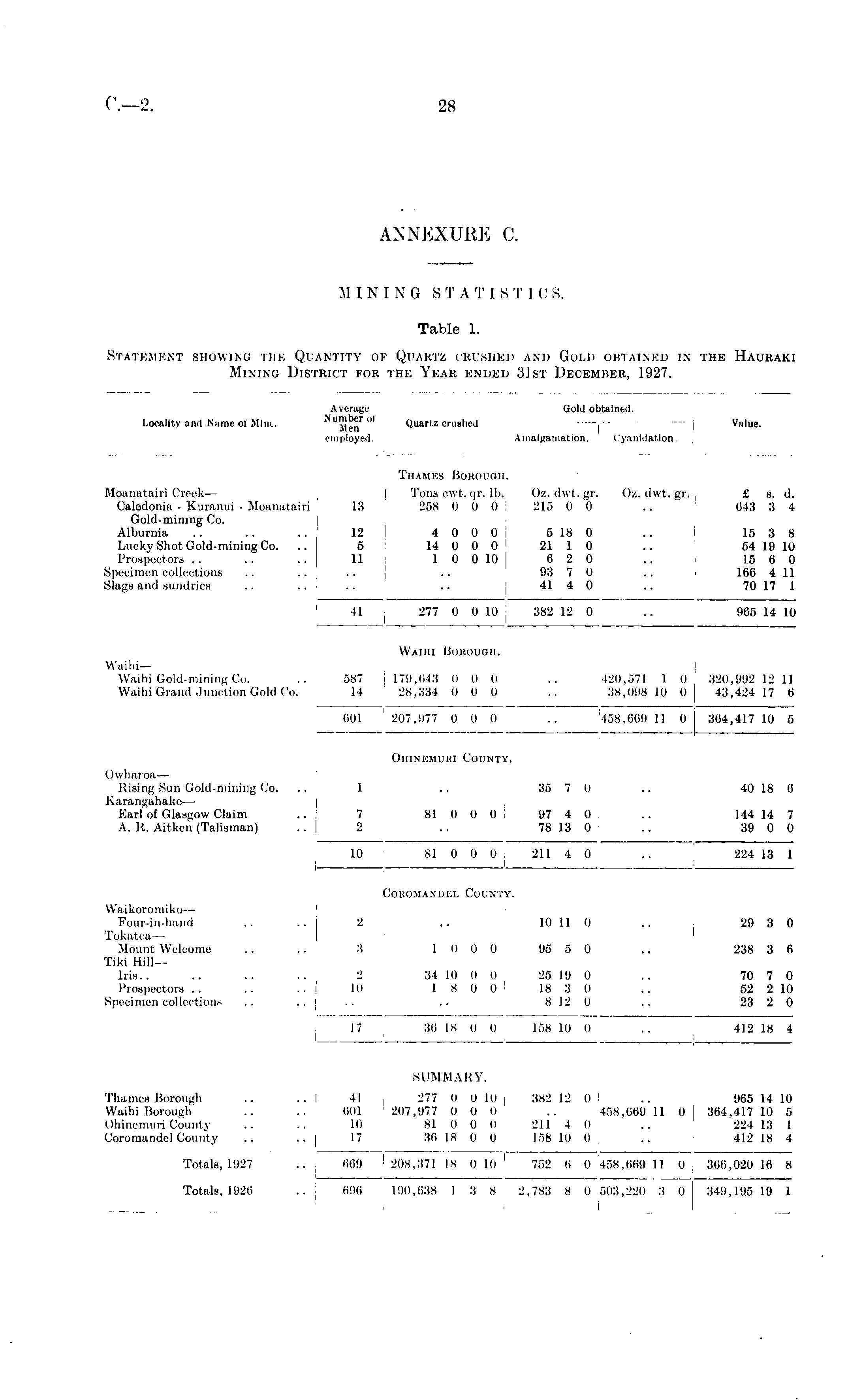 Table 1. Statement showing the Quantity of Quartz crushed and Gold obtained in the Hauraki Mining District for the Year ended 31st December, 1927.