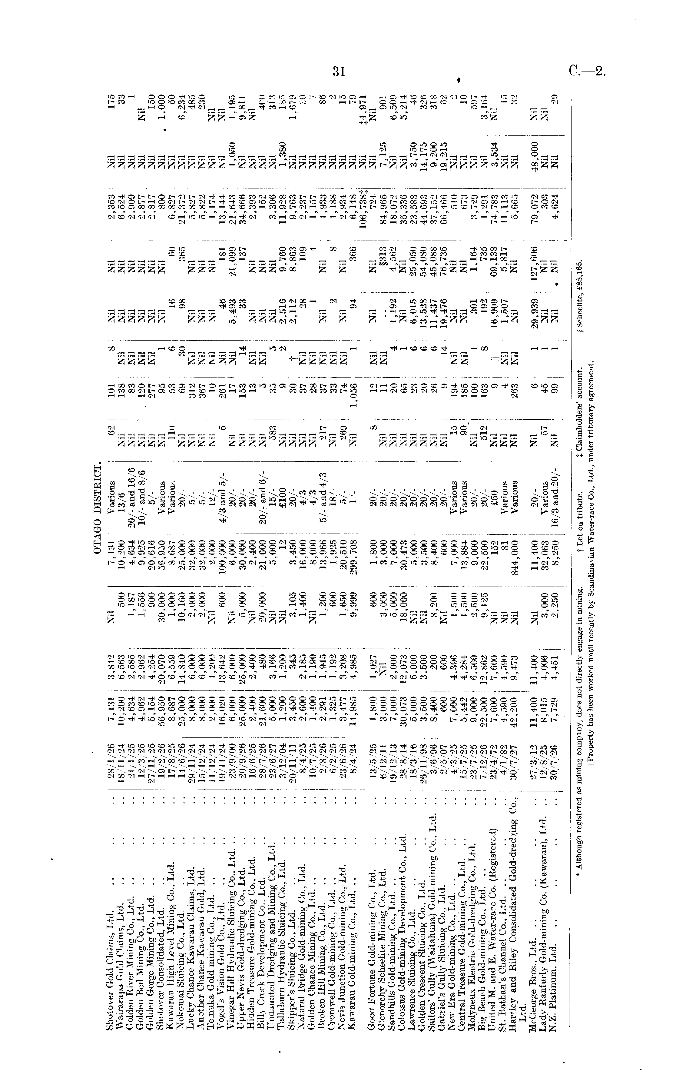 Shotover Gold Claims, Ltd. .. .. .. 28/1/26 7.131 3,8+2 Wairarajia Gold Claims, Ltd. .. .. .. 18/11/24 10,200 6,563 Golden River Mining Co., Ltd. .. .. .. 21/1/25. 4,634 i 2,585 Golden Bed Mining Co., Ltd. .. .. .. 12/3/25 4,962 2,962 Golden Gorge Mining Co., Ltd. .. .. .. 27/11/25 5,154 4,254 Shotover Consolidated, Ltd. .. .. .. 19/2/26 56,950 20,070 Kawarau High Level Mining Co., Ltd. .. .. 17/8/25 8,687 6,559 Nokomai Sluicing Co., Ltd .. .. .. 14/6/26 25,000 14,840 Lucky Chance Kawarau Claims, Ltd. .. .. | 29/11/24 8,000 6,000 Another Chance Kawarau Gold, Ltd. .. .. 15/12/24 8,000 6,000 Te/nuka Gold-mining Co., Ltd. .. .. .. 11/12/24 2,000 1,200 Vogel's Vision Gold Co., Ltd. .. .. .. 19/11/24 16,020 13,642 Vinegar Hill Hydraulic Sluicing Co., Ltd. .. .. 23/9/00 6,000 6,000 Upper Nevis Gold-dredging Co., Ltd. .. .. 20/9/26 25,000 25,000 Hidden Treasure Gold-mining Co., Ltd. .. .. 16/6/25 2.400 2,400 Billy Creek Development Co., Ltd. .. .. 28/7/26 480 Undaunted Dredging and Mining Co., Ltd. .. 23/6/27 5,000 3,166 Tallaburn Hydraulic Sluicing Co., Ltd. .. .. 3/12/04 1,200 1,200 Skipper's Sluicing Co., Ltd. .. .. .. 20/11/11 3,450 345 Natural Bridge Gold-mining Co., Ltd. .. .. 8/4/25 2,600 2,185 Golden Chance Mining Co., Ltd. .. .. .. 10/7/25 j 1,400 1,190 Broken Hill Mining Co., Ltd. .. .. .. 2/8/26; 2,291 1,945 Cromwell Gold-mining Co., Ltd. .. .. .. 6/2/25 1,325 1,192 Nevis Junction Gold-mining Co., Ltd. .. .. j 23/6/26 3,477 3,208 : Kawarau Gold-mining Co., Ltd. .. .. .. j 8/4/24 14,985 4,985 Good Fortune Gold-mining Co., Ltd. .. .. j 13/5/25 1,800 1,027 Glenorchy Scheeiite Mining Co., Ltd. .. ..I 6/12/11 3,000 Nil Sandhills Gold-mining Co., Ltd. .. .. .. 19/12/13 7,000 2,000 Co!o3sus Gold-mining Development Co., Ltd. .. 28/8/14 30,073 j 12,073 Lawrence Sluicing Co., Ltd. .. .. .. 18/3/16 5,000 5,000 Golden Crescent Sluicing Co., Ltd. .. .. 26/11/98 3,500 3,500 nSailors' Gully (Waitahuna) Gold-mining Co., Ltd. .. 3/6 ''96 8,400! 200 Gabriel's Gully Sluicing Co., Ltd. .. .. 2/5/07 600! 600 Sevi Era Gold-mining Co., Ltd. .. .. .. : 4/3/25 7,000 4,396 Central Treasure Gold-mining Co., Ltd. .. .. 15/7/25 5,442 4,284 Molyneux Electric Gold-dredging Co., Ltd. .. I 23 7 25 9,000 : 6.500 Big Beach Gold-mining Co., Ltd. .. .. j 7/12/26 22,500 12,862 United M. and E. Water-race Co. (Registered) .. 23/4/72 7'600 St. Bathan's Channel Co., Ltd. .. .. .. j 4/1/82 '• 4,590 4,590 Hartley and Riley Consolidated Gold-dredjing Co., : 30 7/27 9,473 Ltd. JVIcGeorge Bros., Ltd. .. .. .. ..27/3/12 11,400 11,400 Lady Ranfurly Gold-mining Co. (Kawarau), Ltd. .. | 12/8/25 ! 8,015 4,006 N.Z. Platinum, Ltd. .. .. .. .. 30/7 -'26 7,729 4,451 Nil 500 1,187 1.556 900 30,000 1,000 10,160 2,000 2,000 Nil 600 Nil 5,000 Nil 20,000 Nil Nil 3,105 1,400 Nil 1,200 600 1,650 9,999 600 3,000 5,000 18,000 Nil Nil 8,200 Nil 1,500 1.500 2,500 9,125 Nil Nil Nil Nil 3,000 2,250 7,131 Various 10,200 13/6 4,634 20/- and 16/6 9,925 10/- and 8/6 20,616 ' 5/56,950 Various 8.687 Various 25,000 20/32,000 5 •■- 32,000 5/2,000 12/100,000 | 4/3 and 5/6,000 20/30,000 20/2,400 20/21,600 20/- and 6/5,000 15/12 £100 3,450 20/16,000 4,3 8,000 4 3 13,966 5/- and 4/3 1,925 | ' 18 - 20,510 : 5/299.708 1/1.800 20/3.000 207,000 20/30,473 20/5.000 20 - 3,500 20/8,400 20/600 20/7,000 Various 13.884 Various 9,000 20/22,500 20/152 £50 81 Various 844,000 Various 11,400 2032,063 Various 8,250 j 16/3 and 20/i 62 I Nil Nil Nil NilNil 110 Nil Nil Nil Nil 5 Nil Nil Nil Nil 583 Nil Nil Nil Nil 217 Nil 269 Nil 8 Nil Nil Nil Nil Nil Nil Nil 15 90 Nil 512 Nil Nil Nil Nil 57 Nil 101 138 83 120 277 95 53 69 312 367 10 261 17 I 153 13 5 35 9 30 37 28 i 37 33 74 1,056 11 20 65 23 20 26 9 194 185 i ioo ! 163 4 263 6 45 99 8 Nil Nil Nil Nil Nil Nil Nil Nil Nil 1 Nil 6 ! 16 30 98 Nil Nil Nil Nil Nil Nil Nil 46 Nil 5,493 14 ! 33 Nil Nil Nil j Nil 5 Nil 2 2,516 t 2,112 Nil 28 Nil 1 Nil Nil Nil 2 Nil | Nil 1 94 Nil Nil Nil 4 1,192 1 Nil 6 6,015 6 I 13.528 6 | 11,437 14 19.476 Nil Nil Nil Nil 1 301 8 192 || 16,909 Nil i 1,507 Nil Nil 1 j 29,939 1 Nil 1 Nil Nil Nil Nil Nil Nil Nil 60 365 Nil Nil Nil 181 21,099 137 Nil Nil Nil 9,760 8,863 109 4 Nil 8 Nil 366 Nil §313 4.562 Nil 25,050 54,080 45,088 76,735 Nil Nil 1,164 735 69,138 5,817 Nil 127,606 Nil . Nil . 2,353 6,524 2,909 2,877 2,817 800 6,827 21,372 5.827 5,822 1,174 13,144 21.643 34,666 2,393 152 3,306 11,928 9,763 2,237 1,157 1,933 1,188 2,934 6,148 106,7381 724 84.965 18.072 35,336 23,588 44,693 37,152 66,466 510 673 3.729 1,291 74,783 11,113 5,665 79,072 303 4,624 Nil Nil Nil Nil Nil Nil Nil Nil Nil Nil Nil Nil 1,050 Nil Nil Nil Nil 1,380 Nil Nil Nil Nil Nil Nil Nil Nil Nil 7.125 Nil Nil 3,750 14,175 9.200 19,215 Nil Nil Nil Nil 3,534 Nil Nil 48,000 ! Nil Nil 175 33 1 Nil 150 . 1,000 50 6,234 485 230 Nil Nil 1,195 9,811 Nil 400 313 185 1,679 30 i 86 2 15 79 14,971 Nil 901 6,509 5,214 46 326 318 2 10 597 3,164 Nil 15 32 Nil Nil 29 * Although registered as mining company, does not directly engage in mining. on tribute. [I Property has been worked until recently by Scandinavian Water-race Co., Ltd., X Claimholders' account. § Scheelite, £83,165. under tributary agreement.